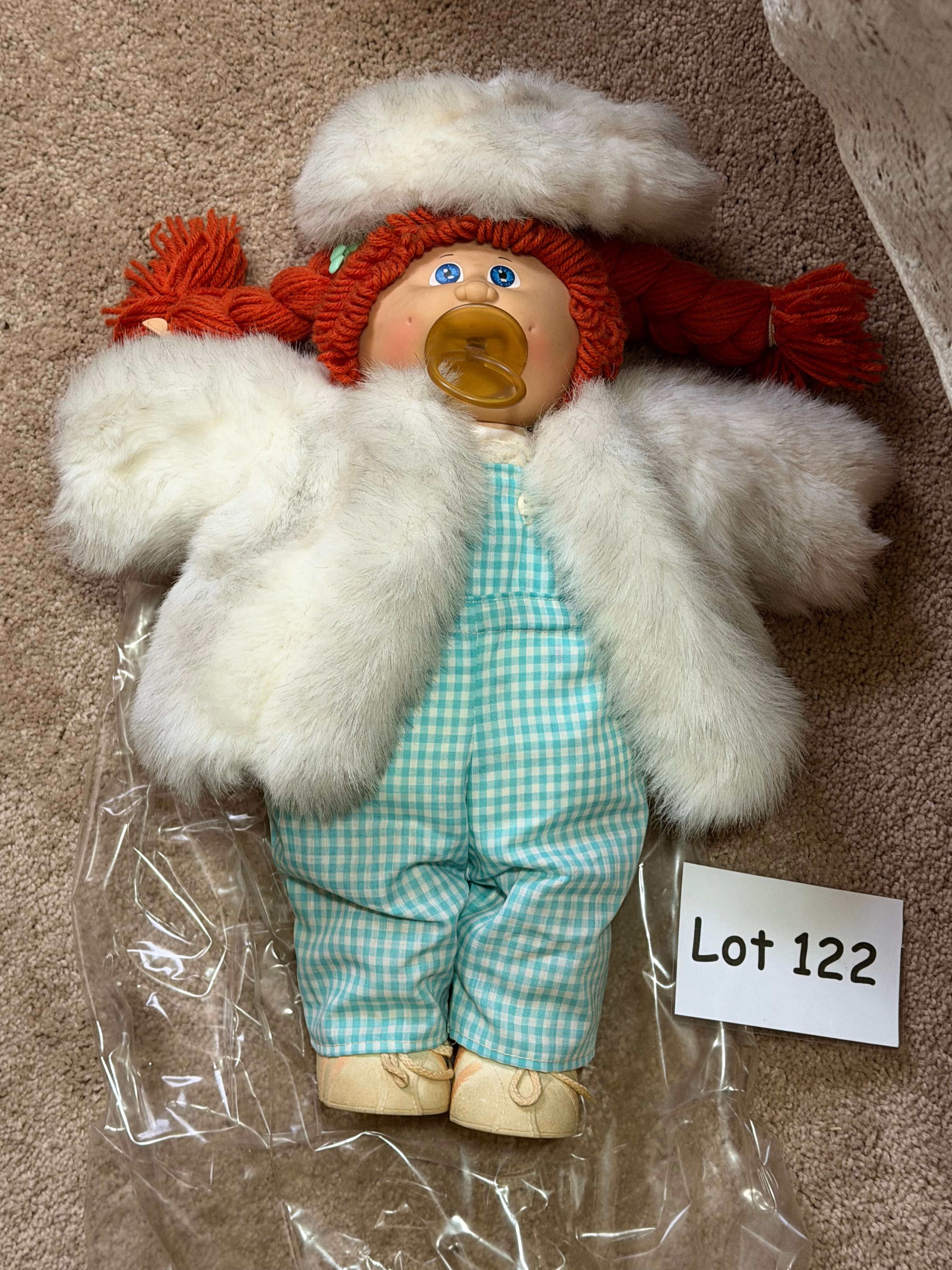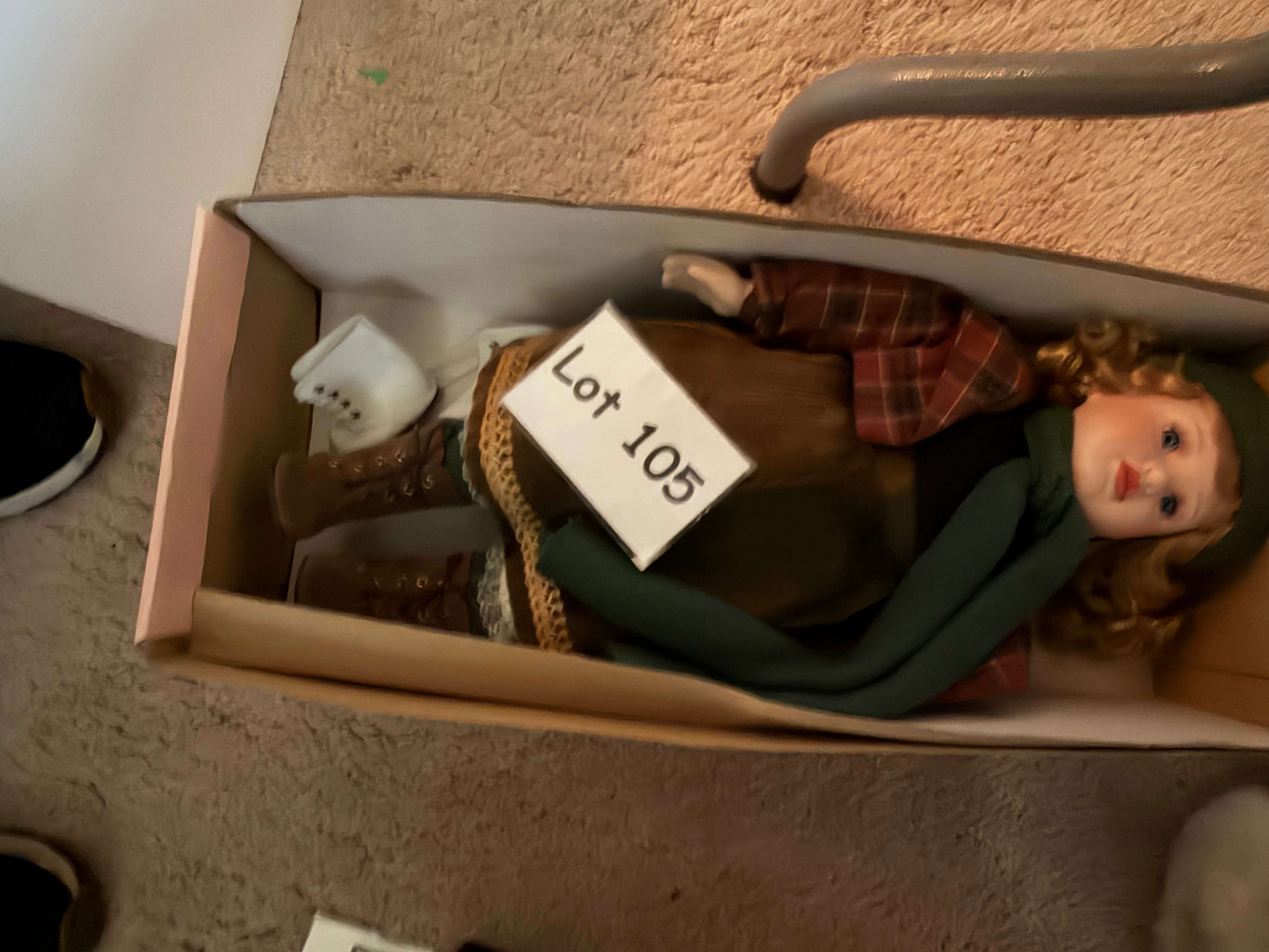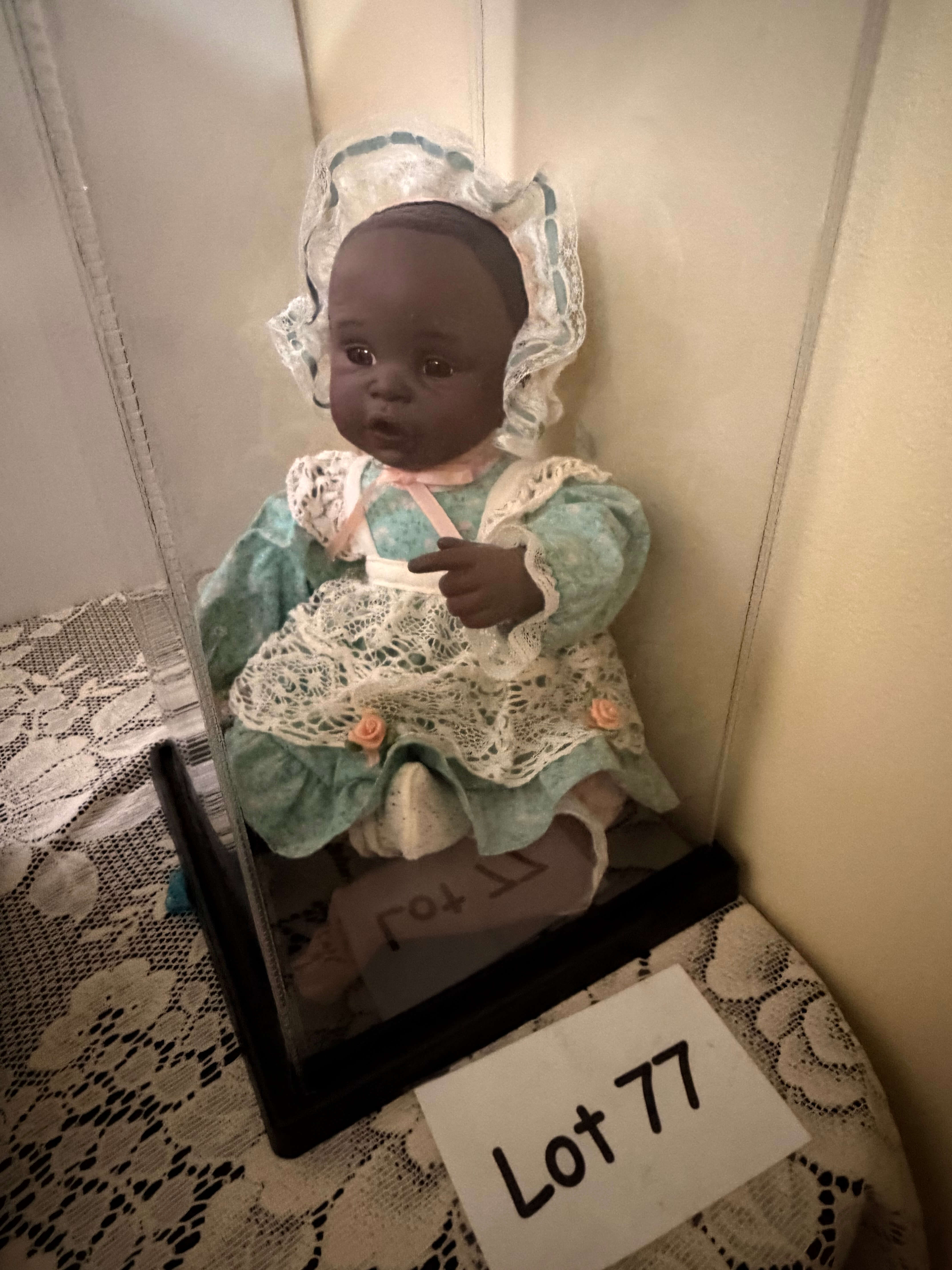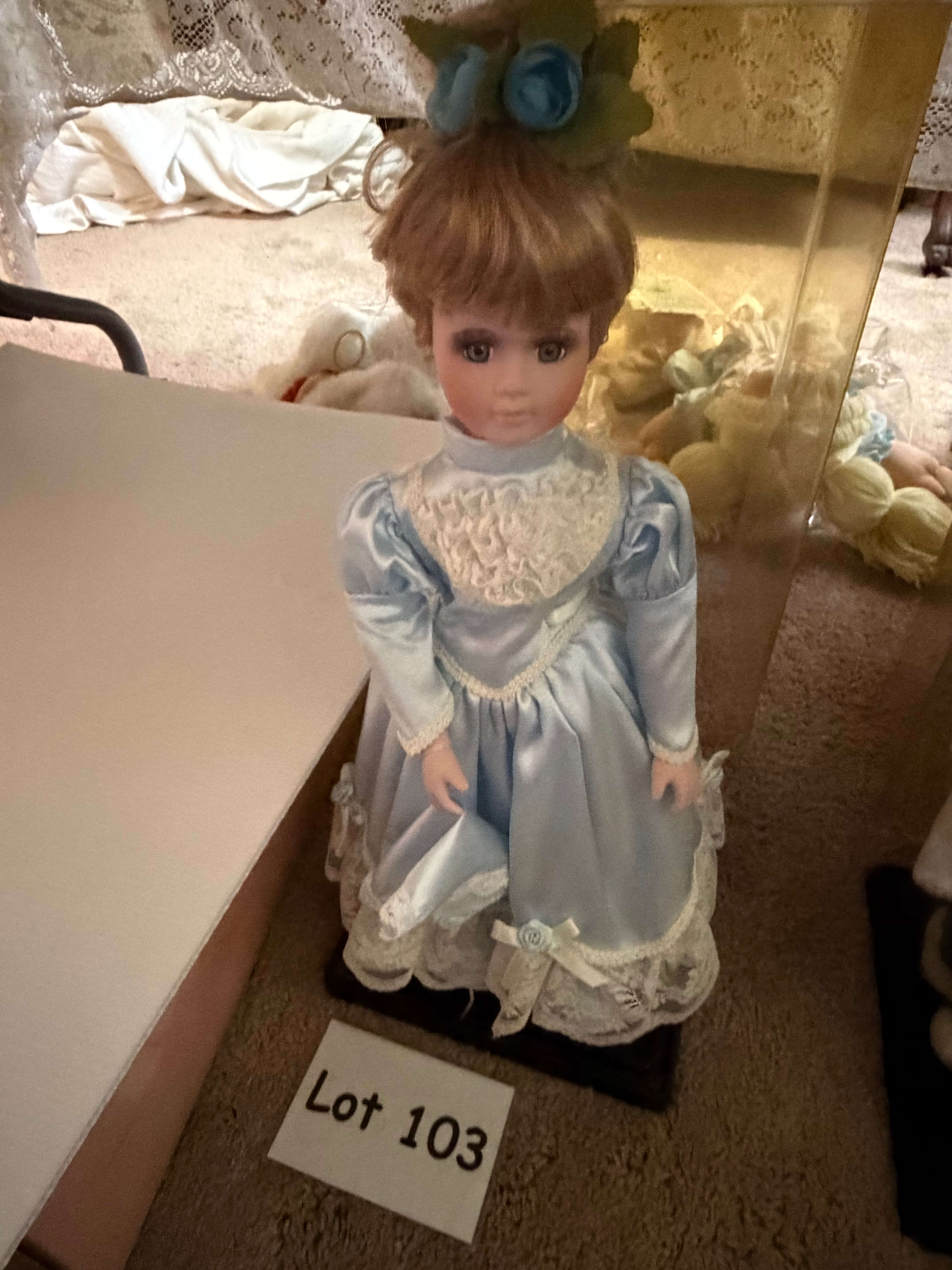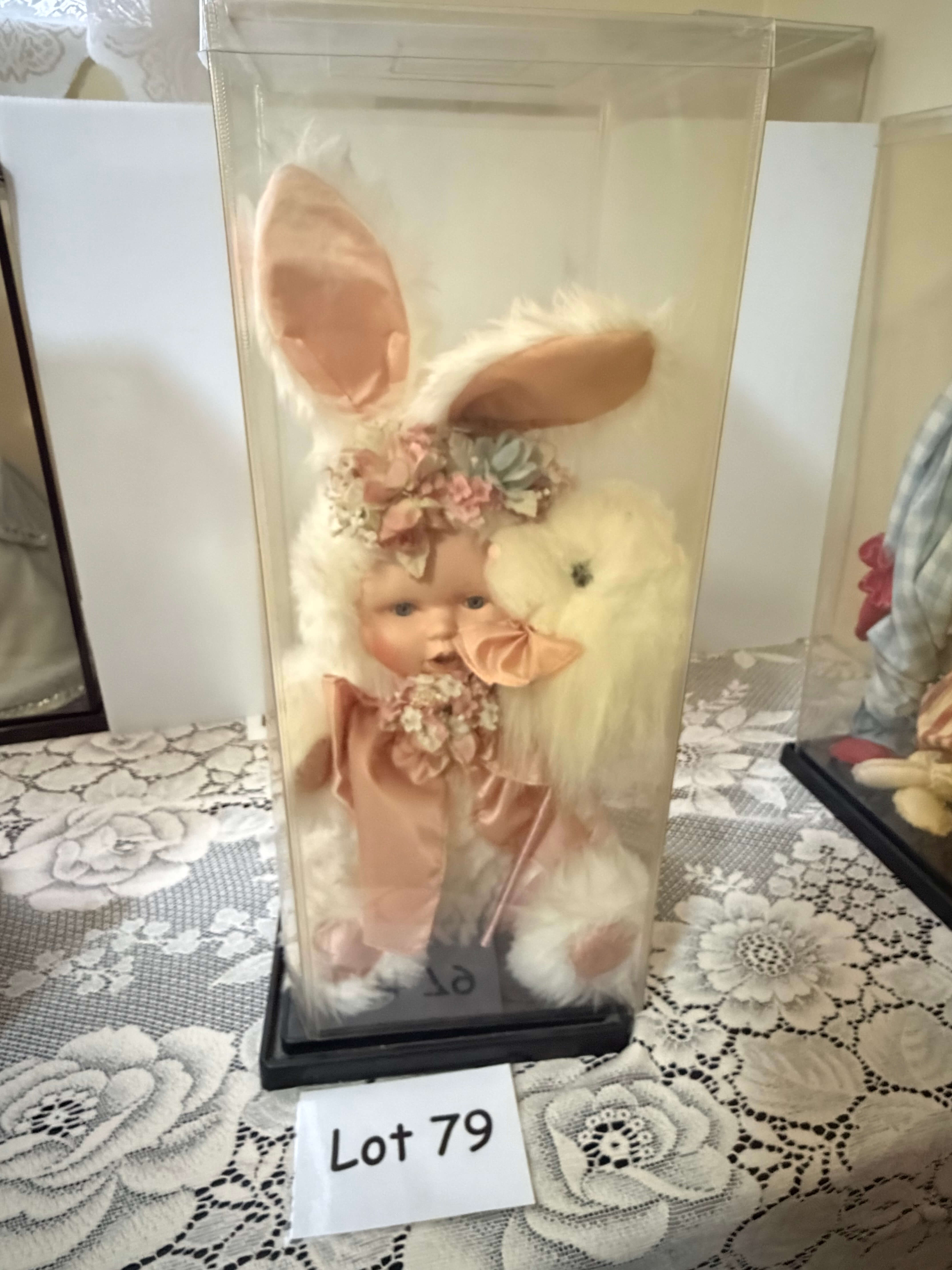 Porcelain Easter Bunny Baby Doll, 18"h, w/ thin plastic case.