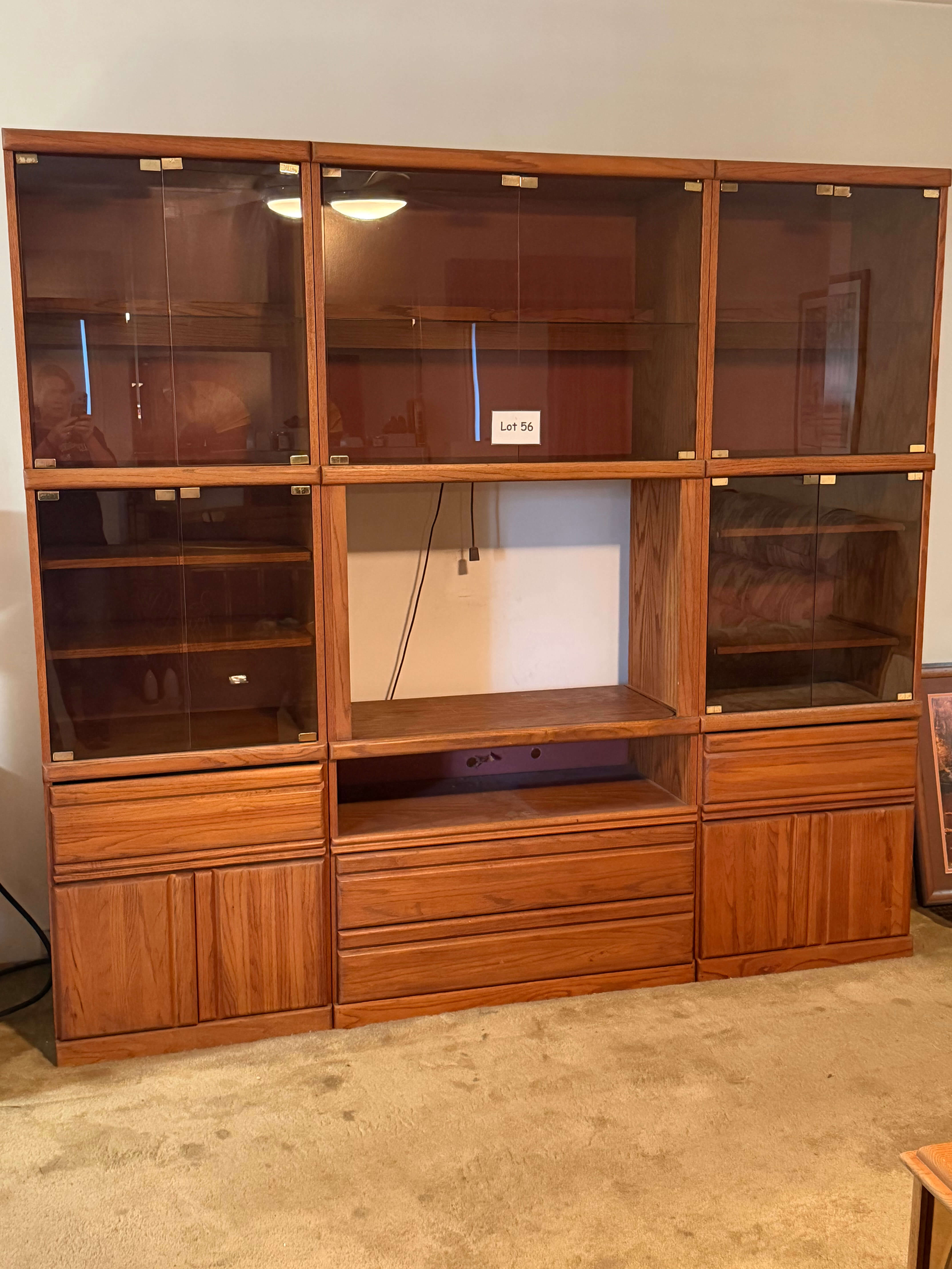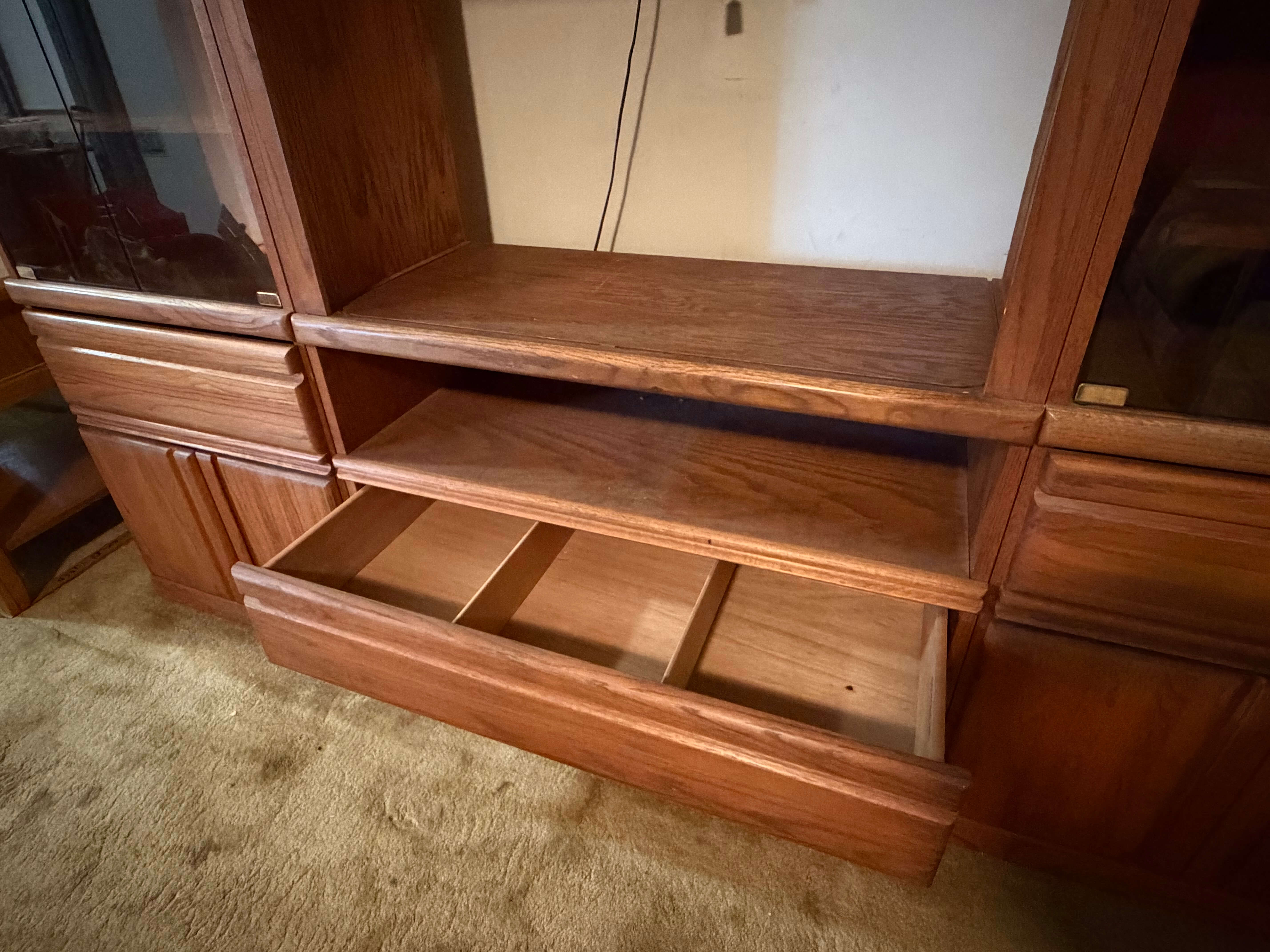 3-Piece Oak Entertainment Center. The 2 sides measure 24"w x 16"d x 64"h and the middle section measures 36"w.