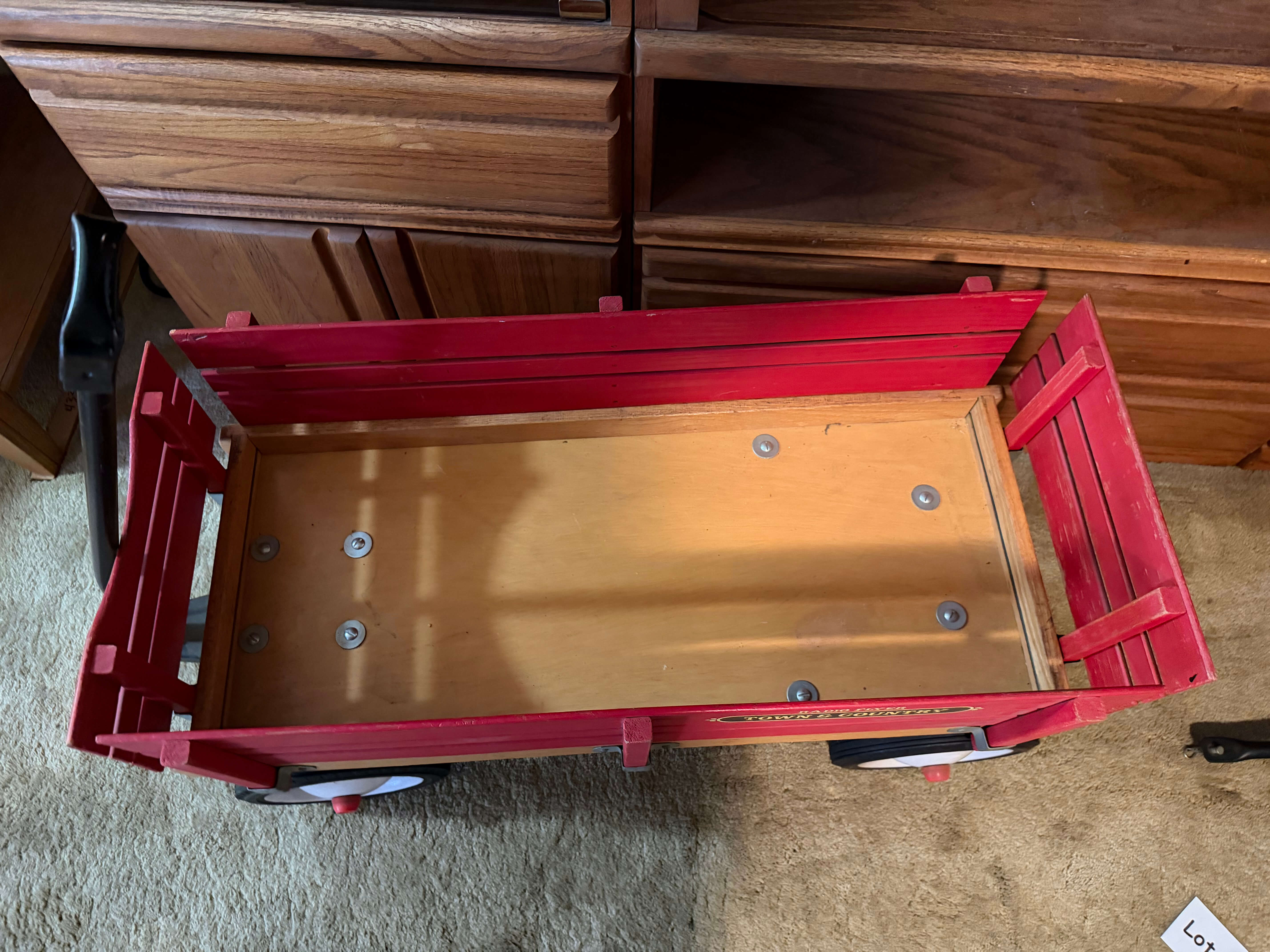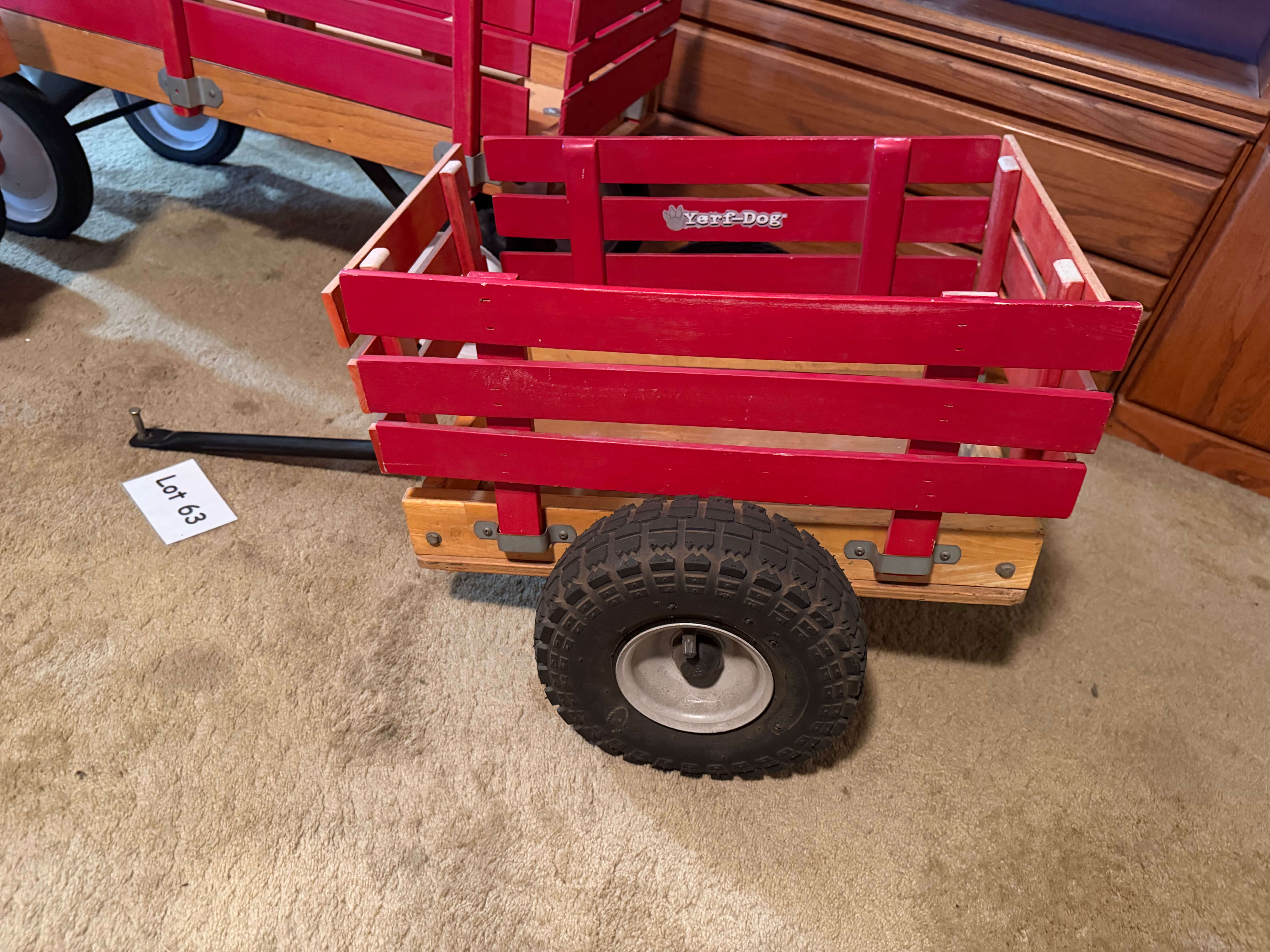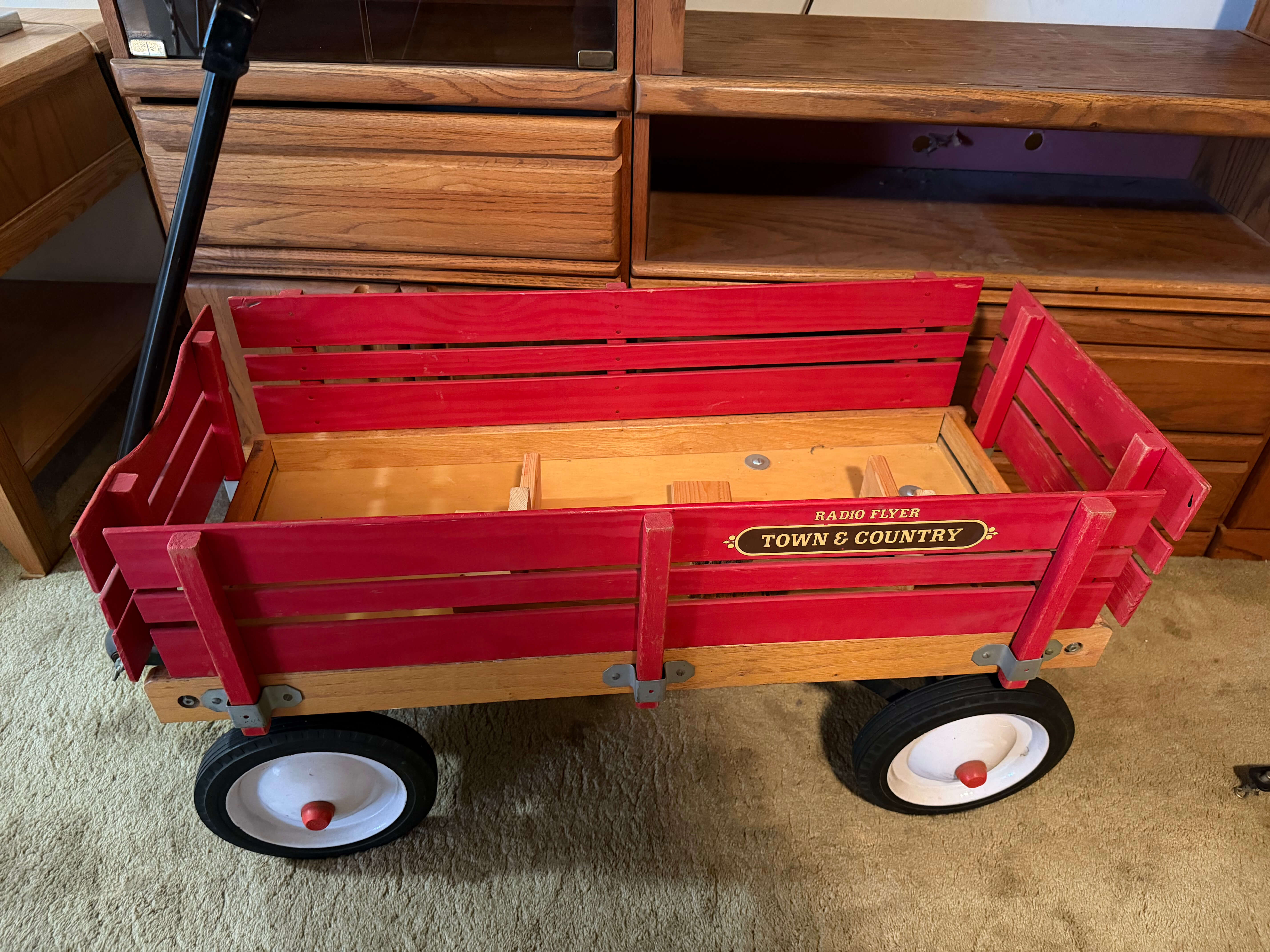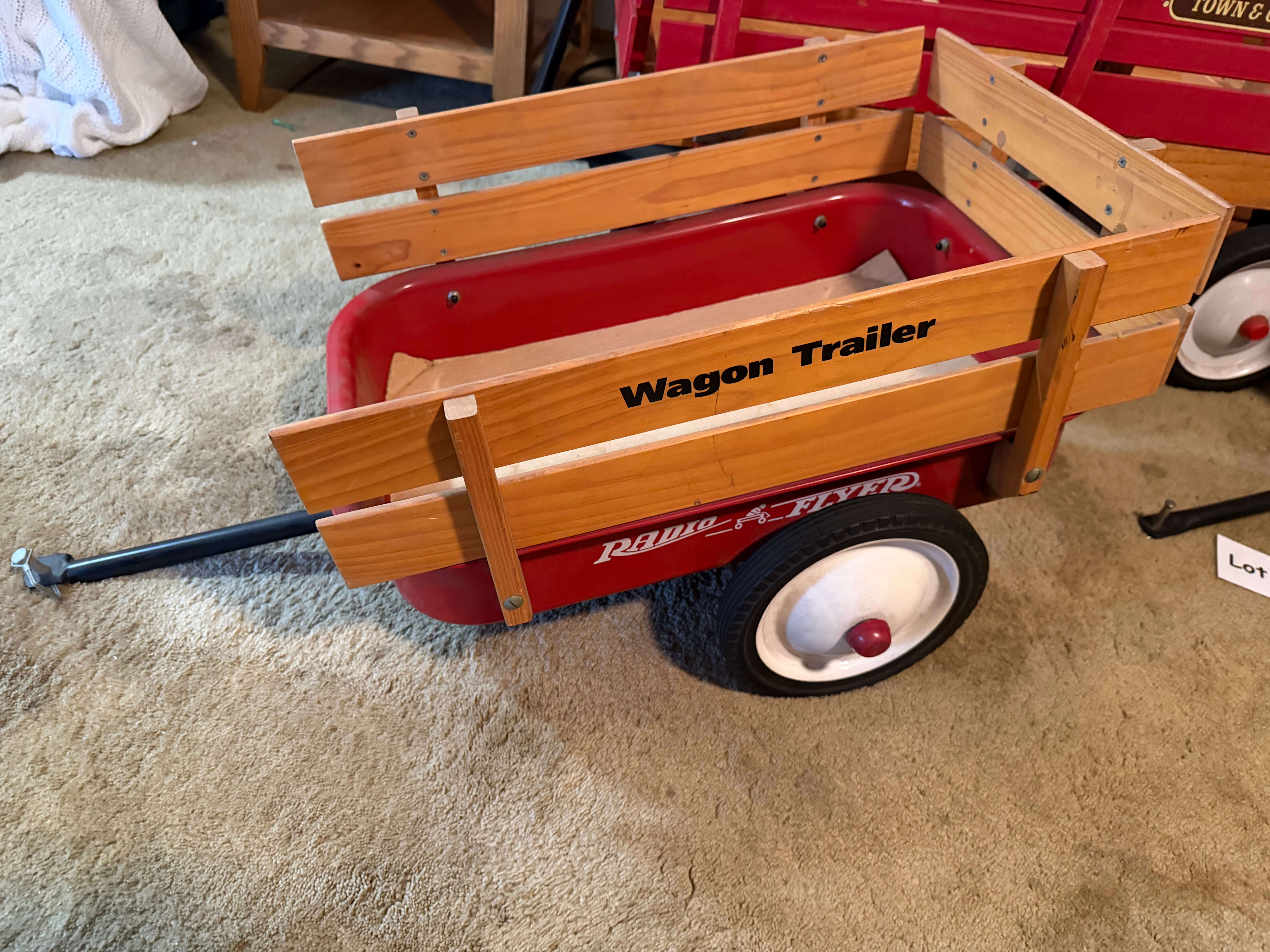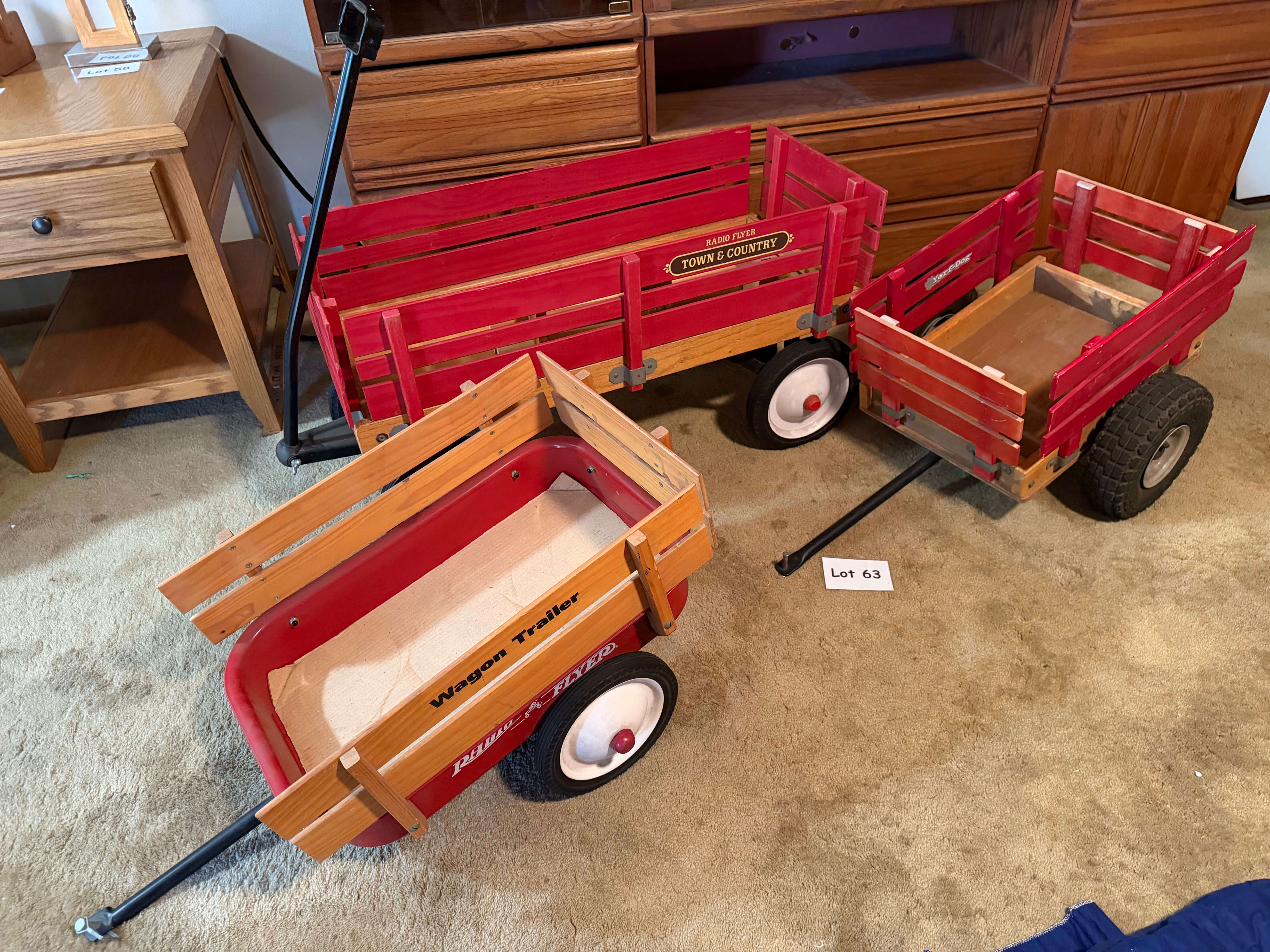 Radio Flyer Large Wood Wagon (36"l x 19"w x 15"h) PLUS 2 Wagon Trailers -- 1 has a wood base & the other has a metal base.