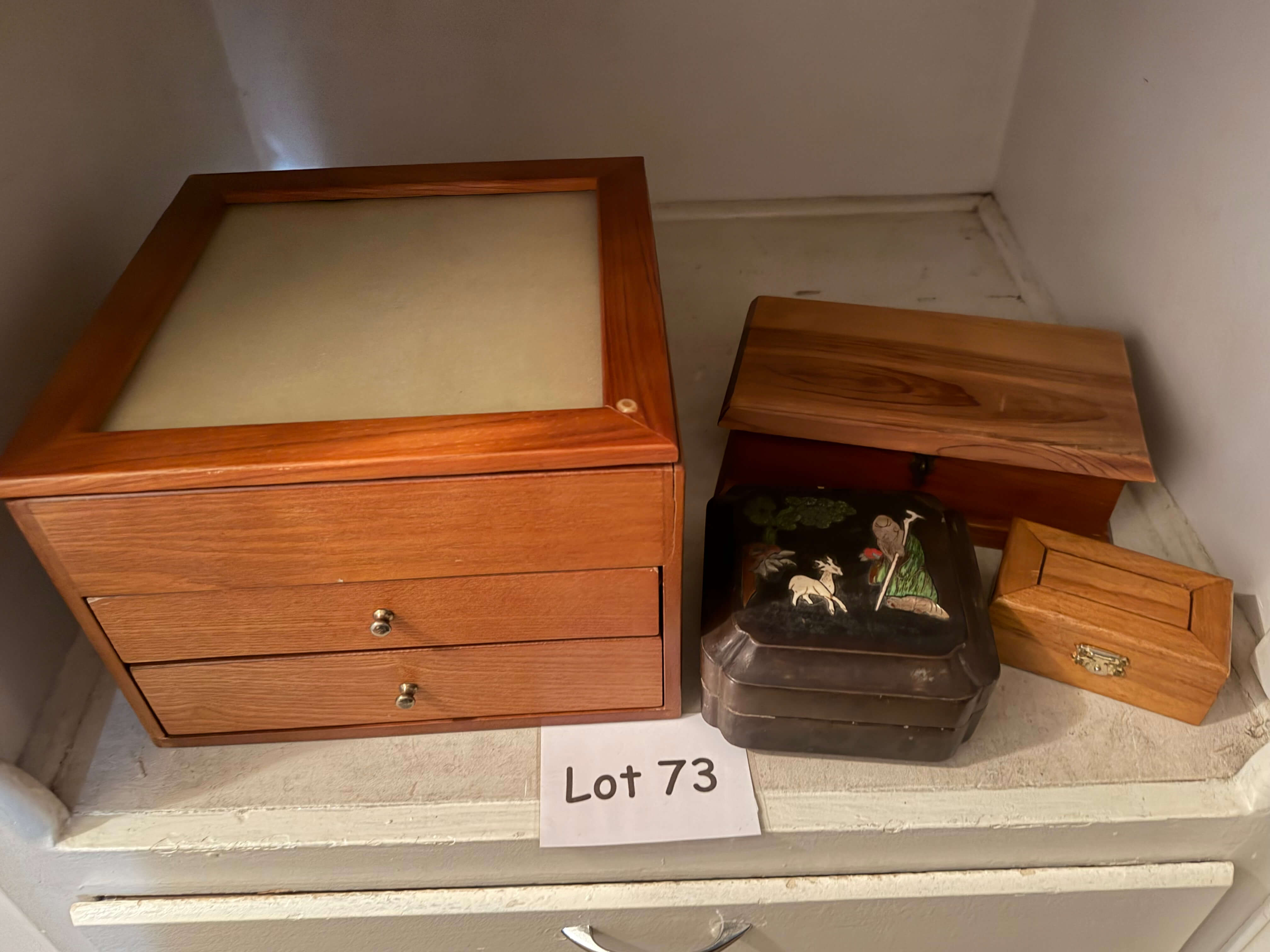 Variety of Wooden Jewelry Boxes, largest is 11"w x 11"d x 8"h