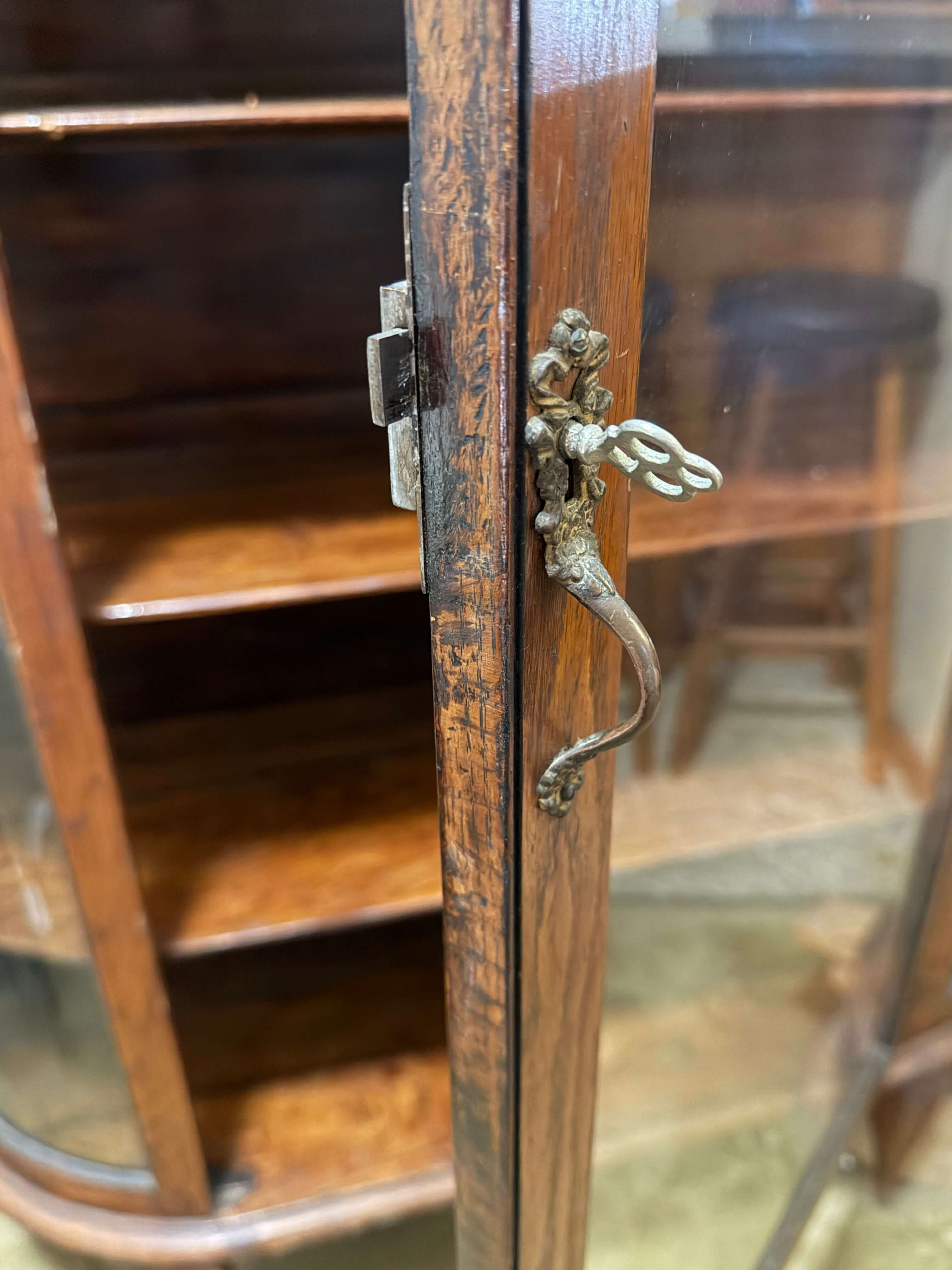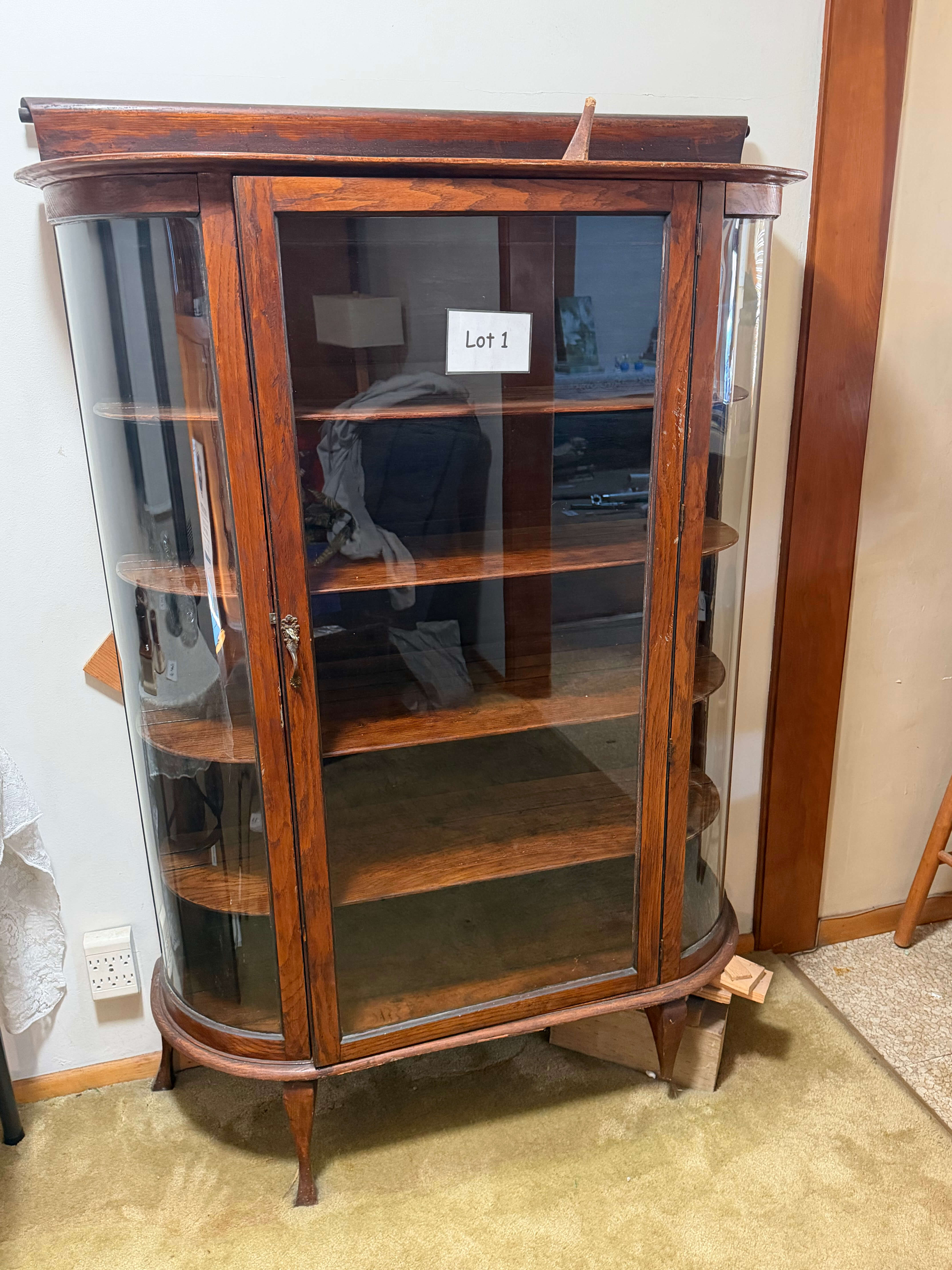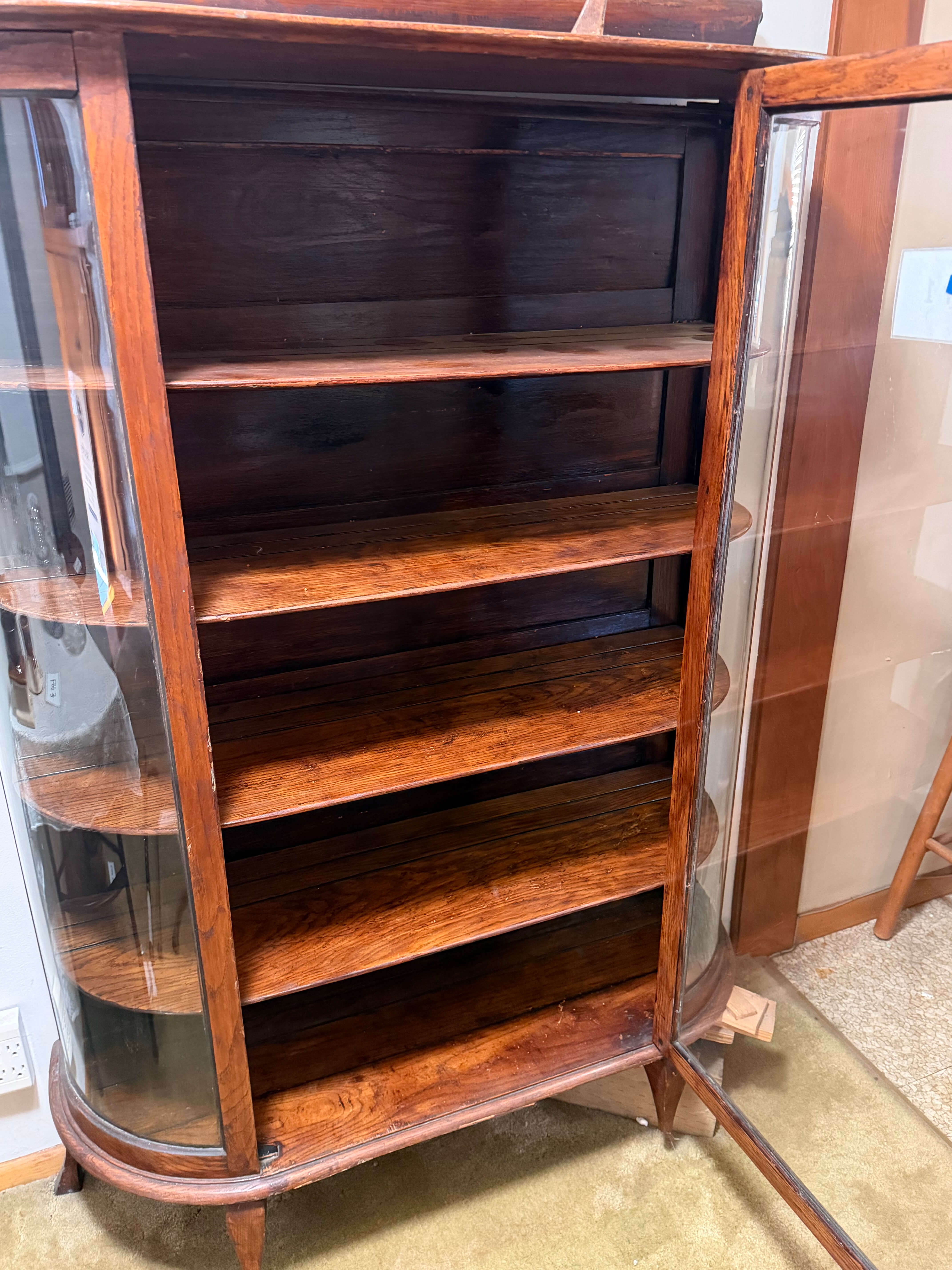 Antique Curved-side Curio Cabinet, 42"w x 14"d x 64"h. One of the front legs is broken (broken piece is still present)
