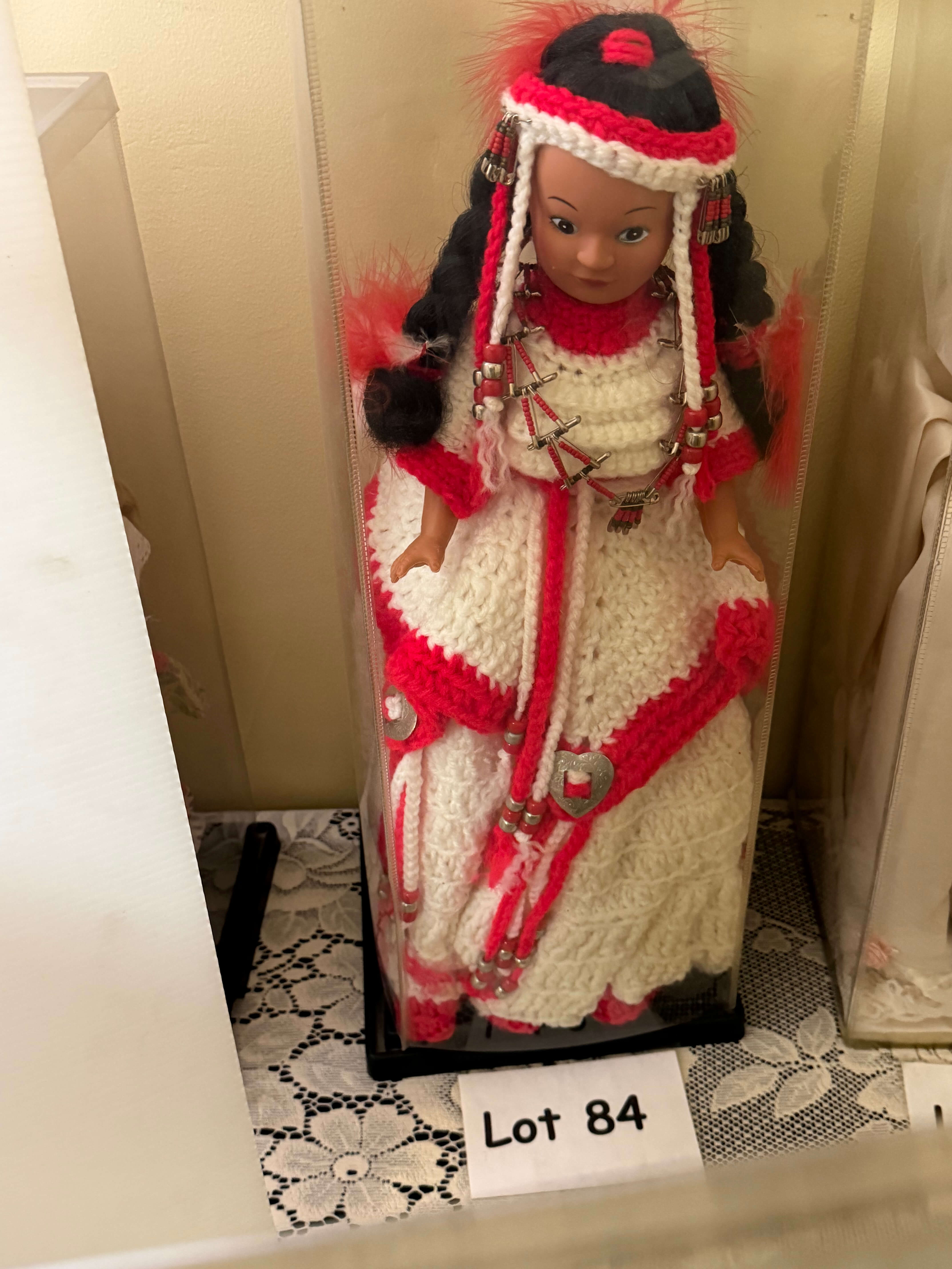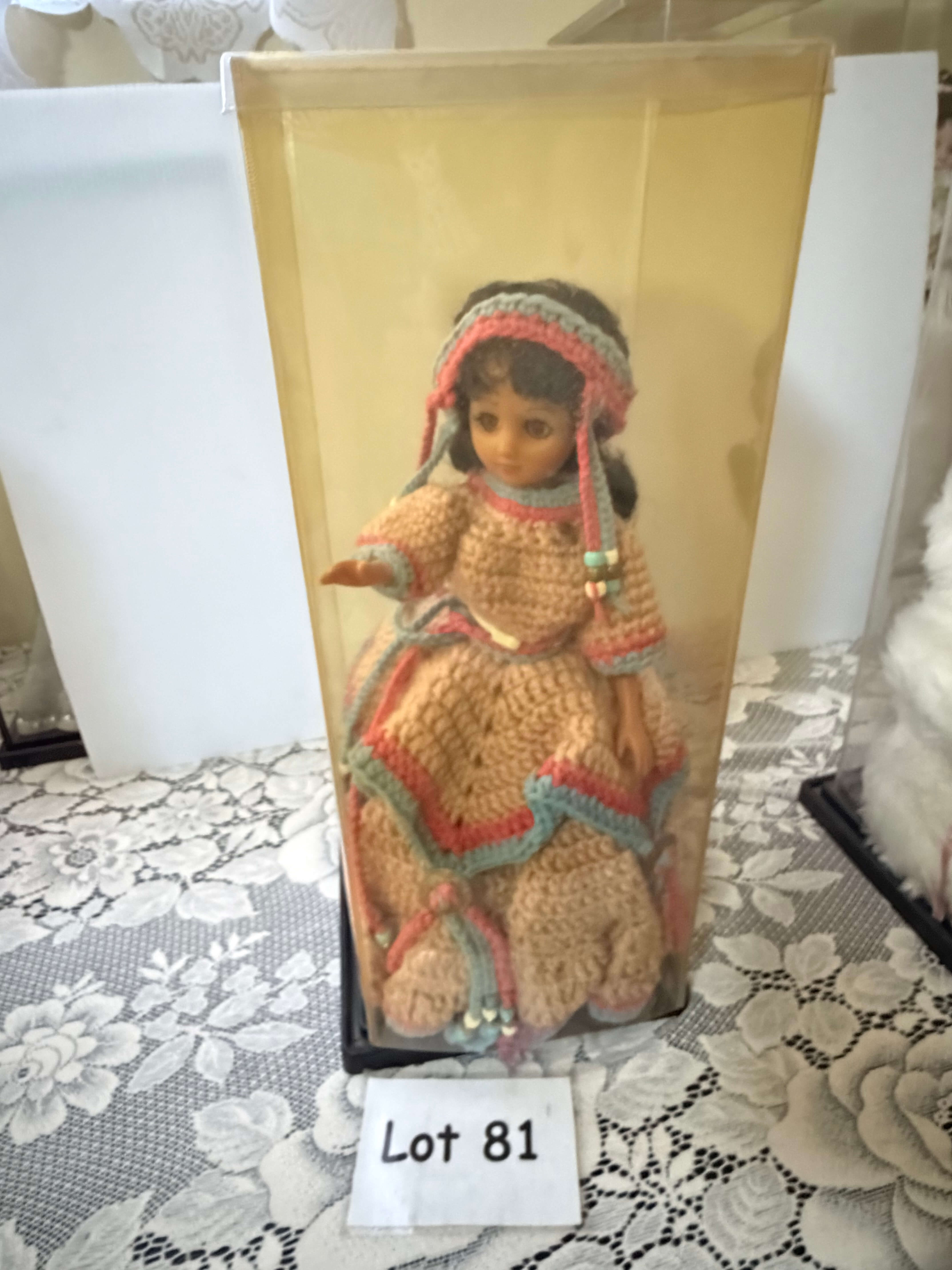 Vinyl Indigenous Girl Doll w/ Knitted Clothing, 19"h, in thin plastic case.