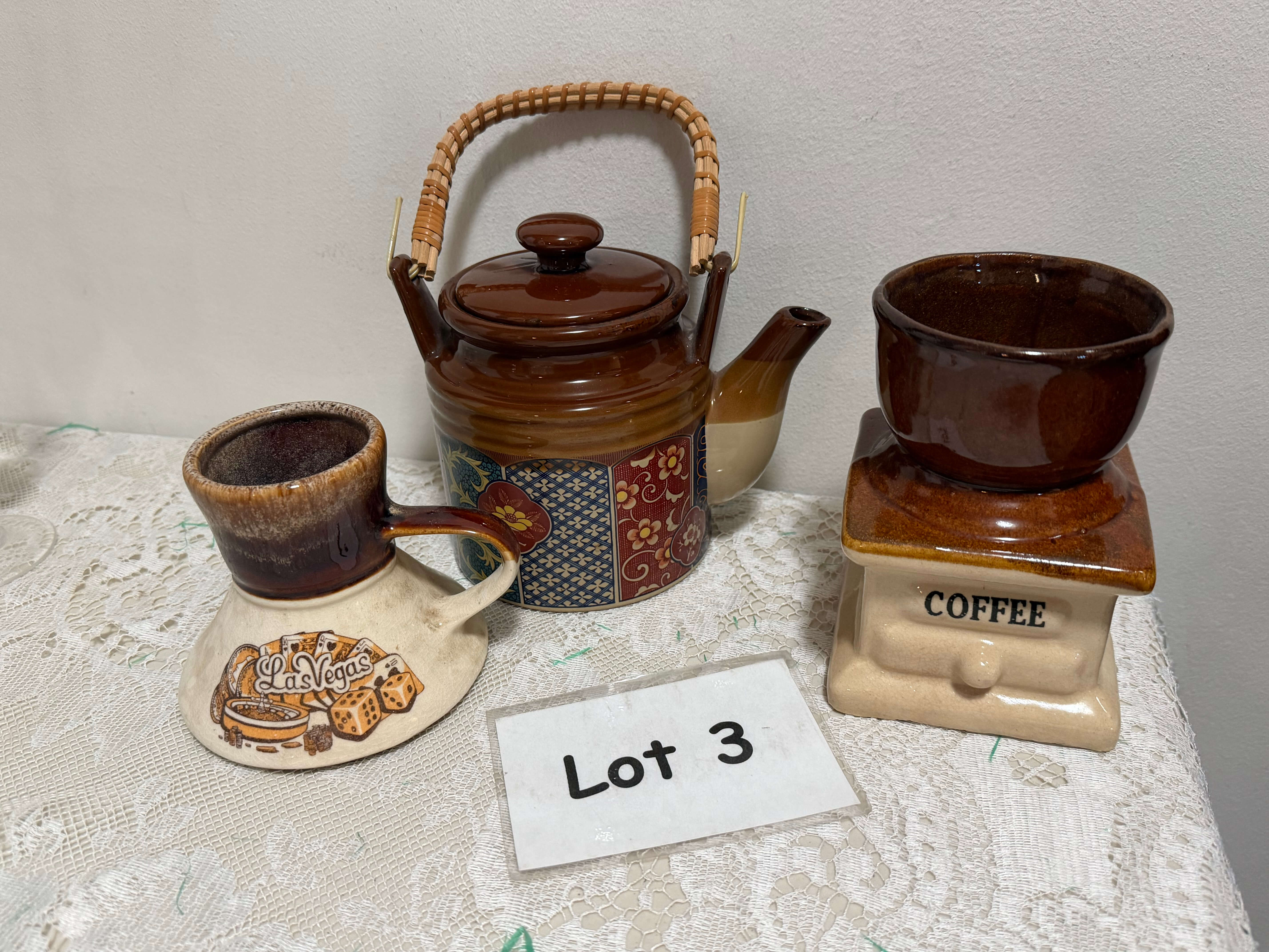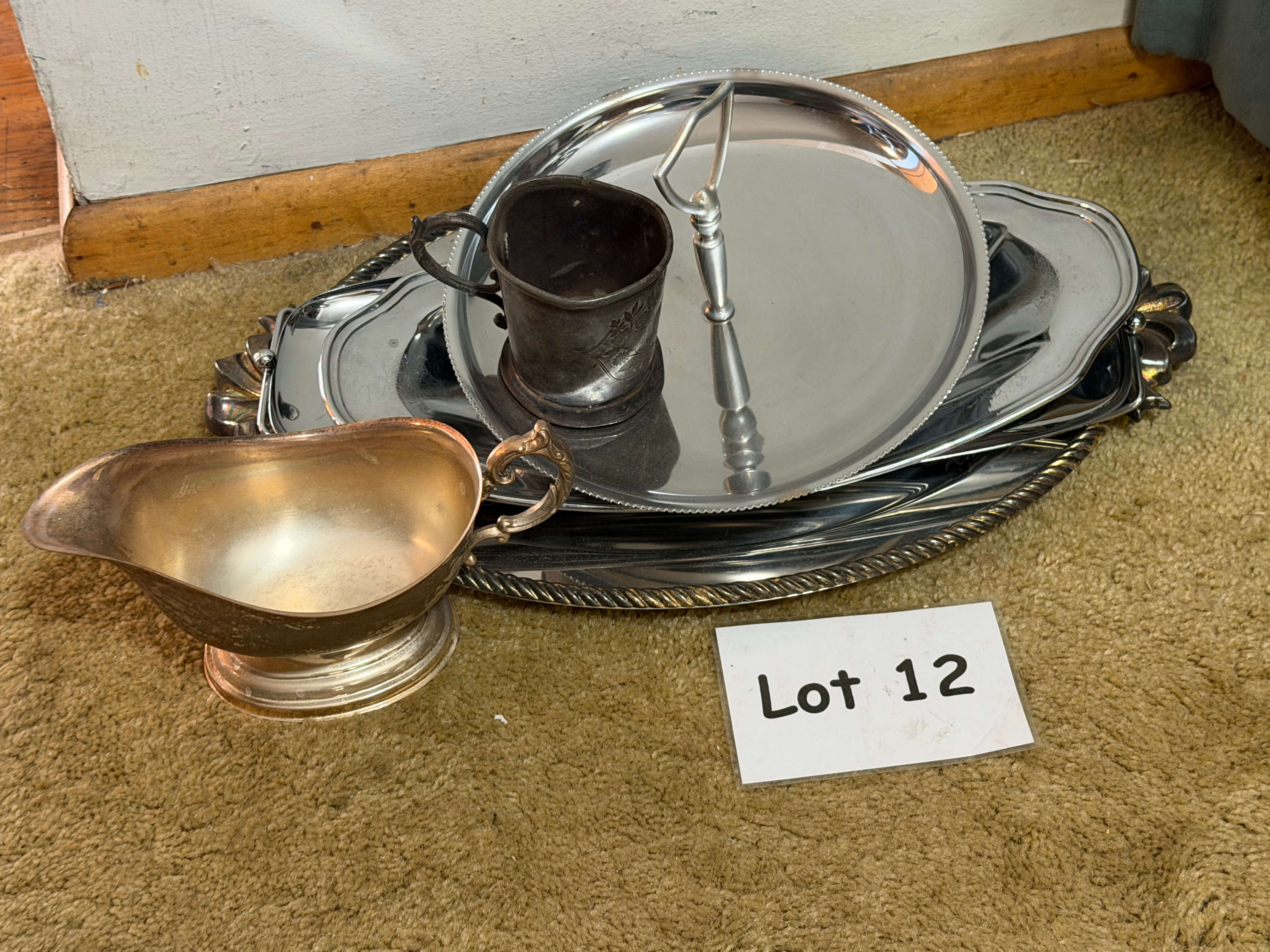 Variety of Metalware. Handle on the mug is broken, largest tray is 16"l