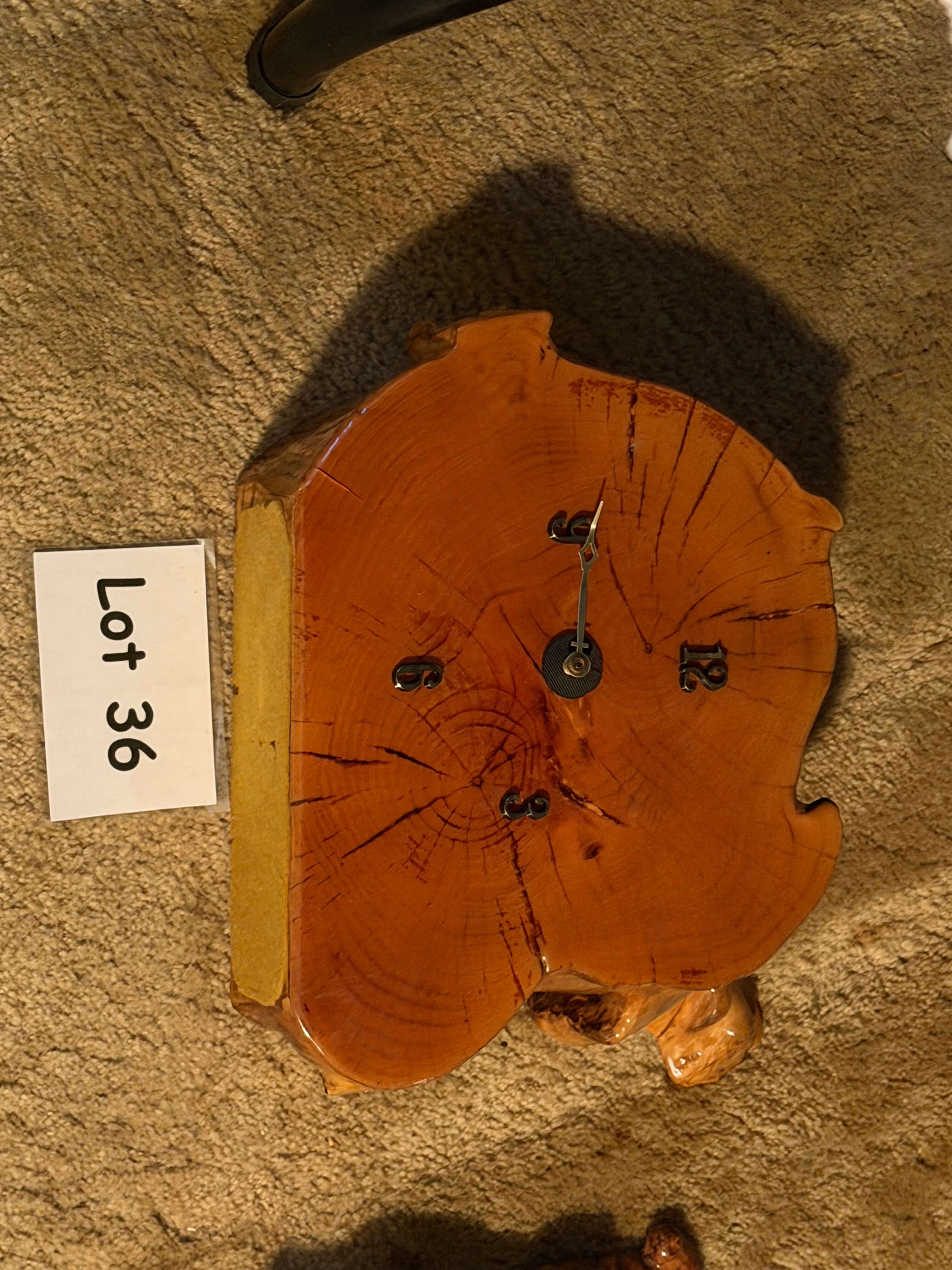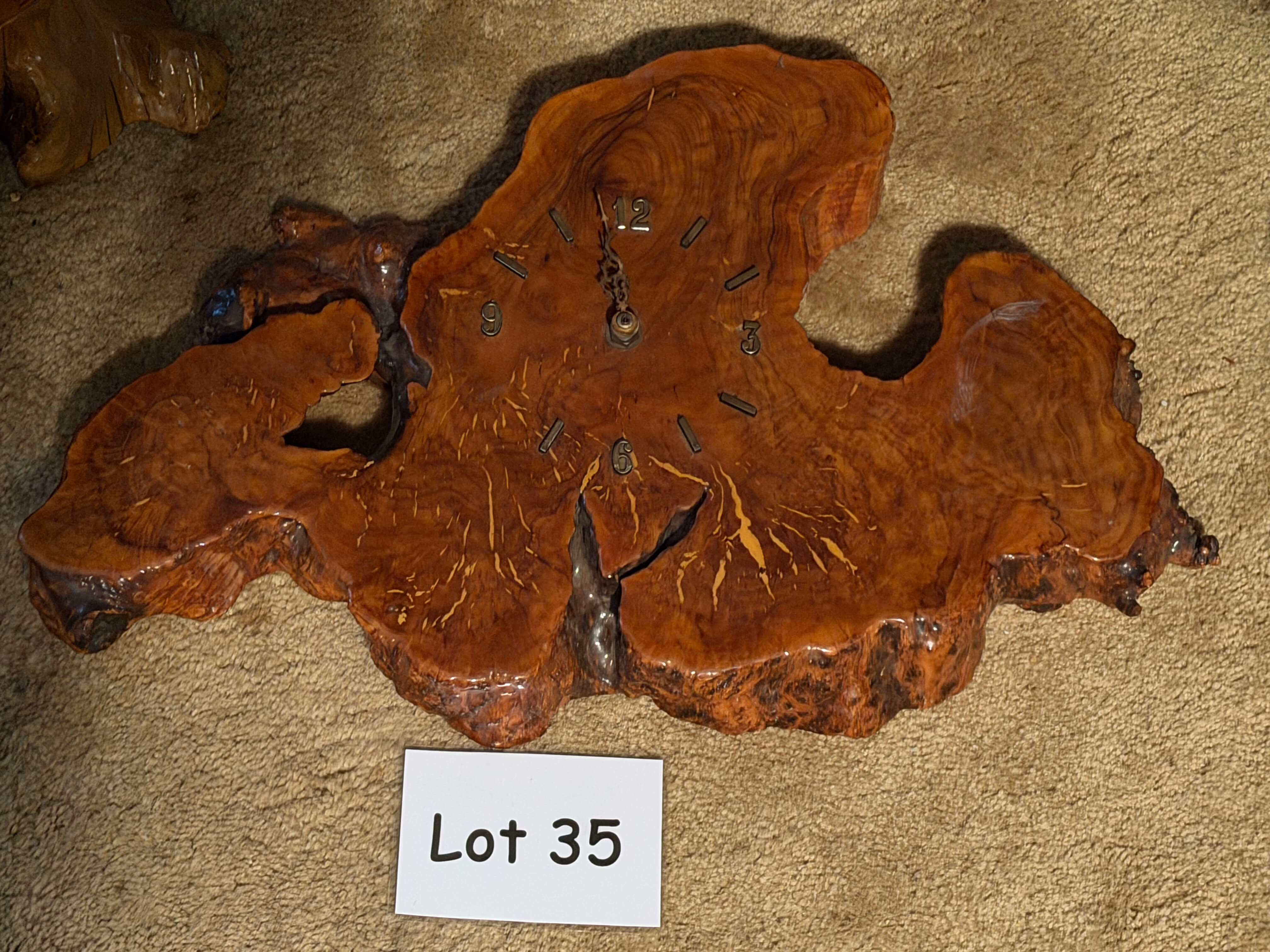 Natural Edge Wood Clock, @19" across. Missing a time marker and battery cover