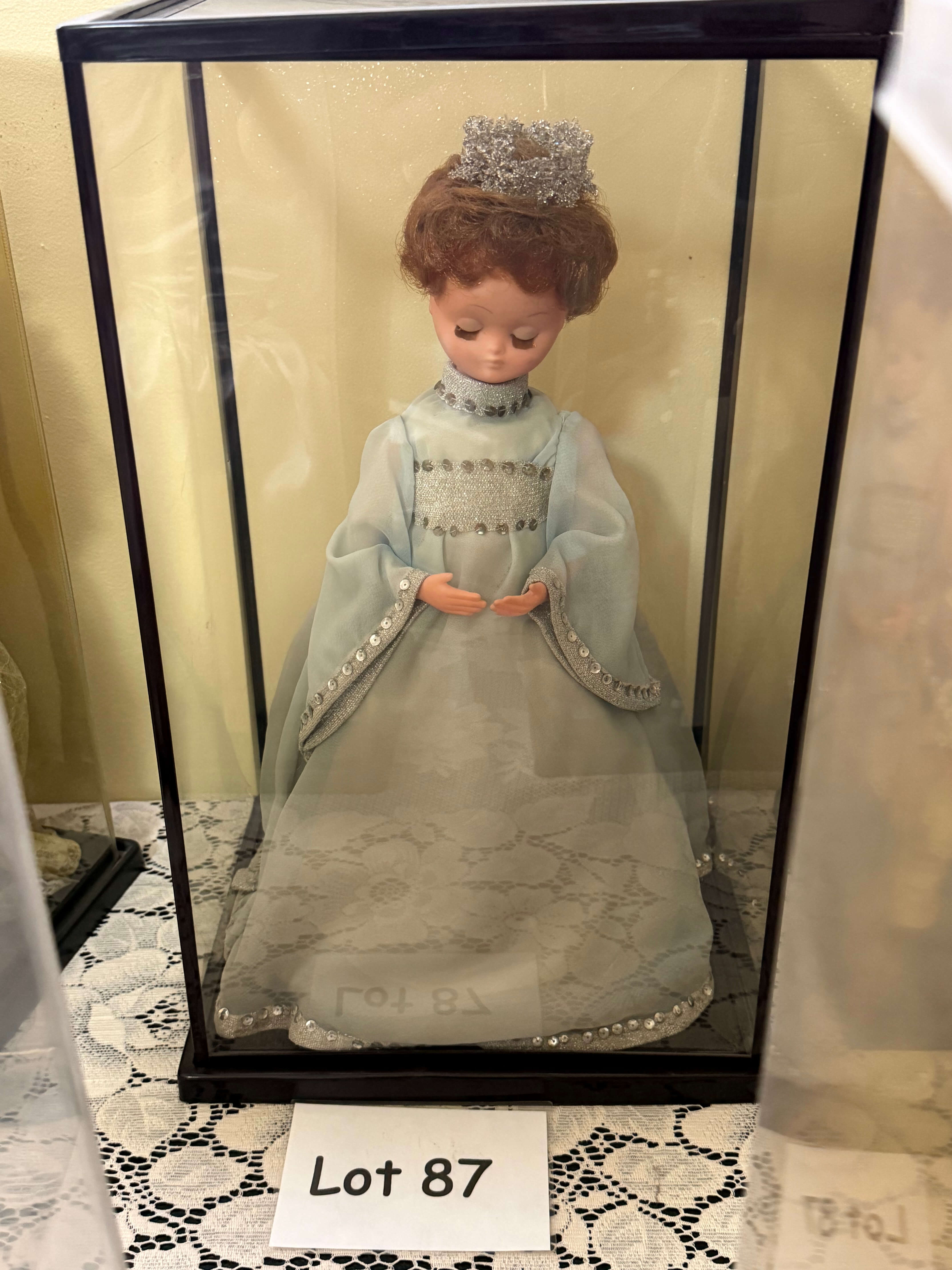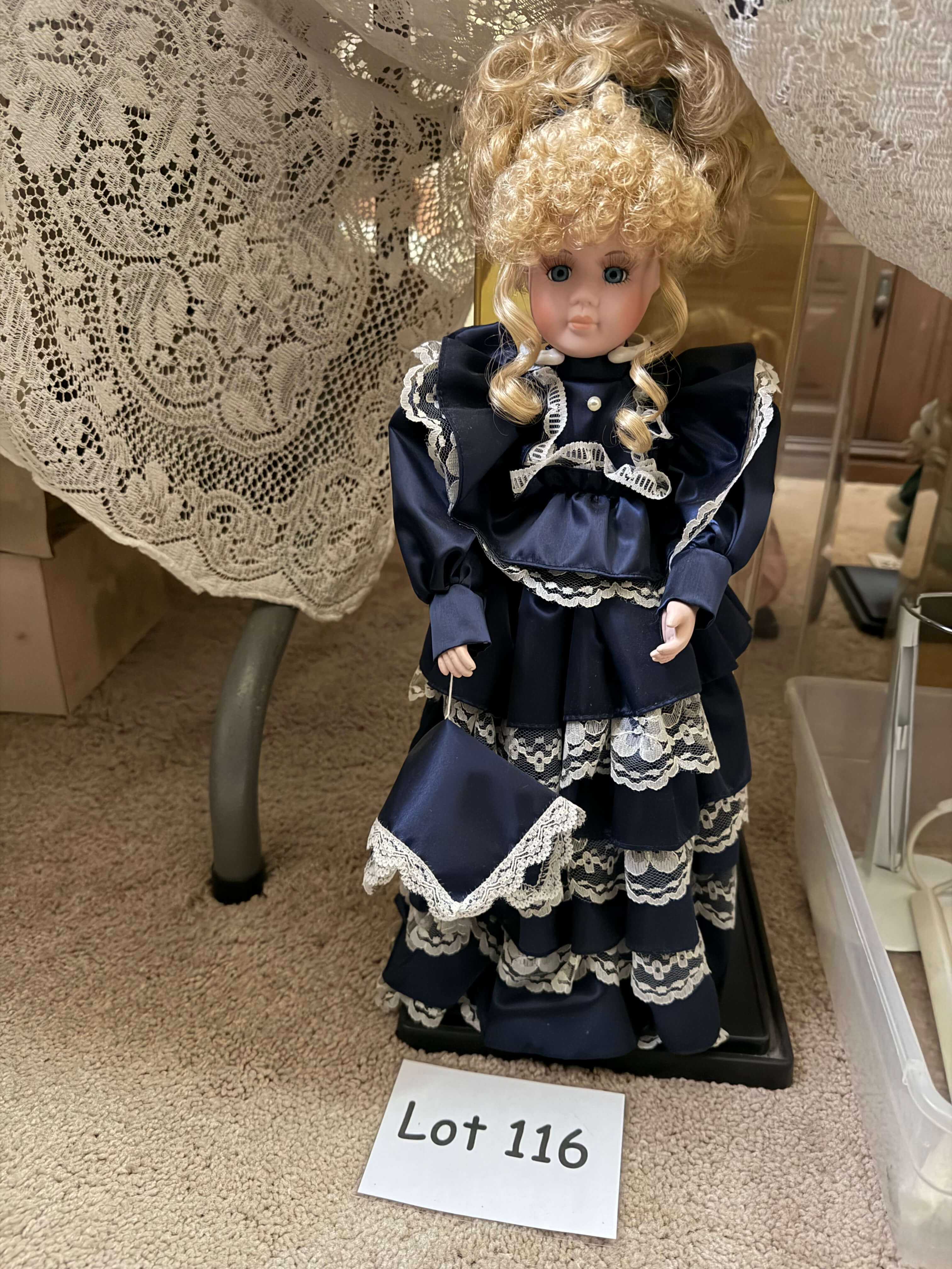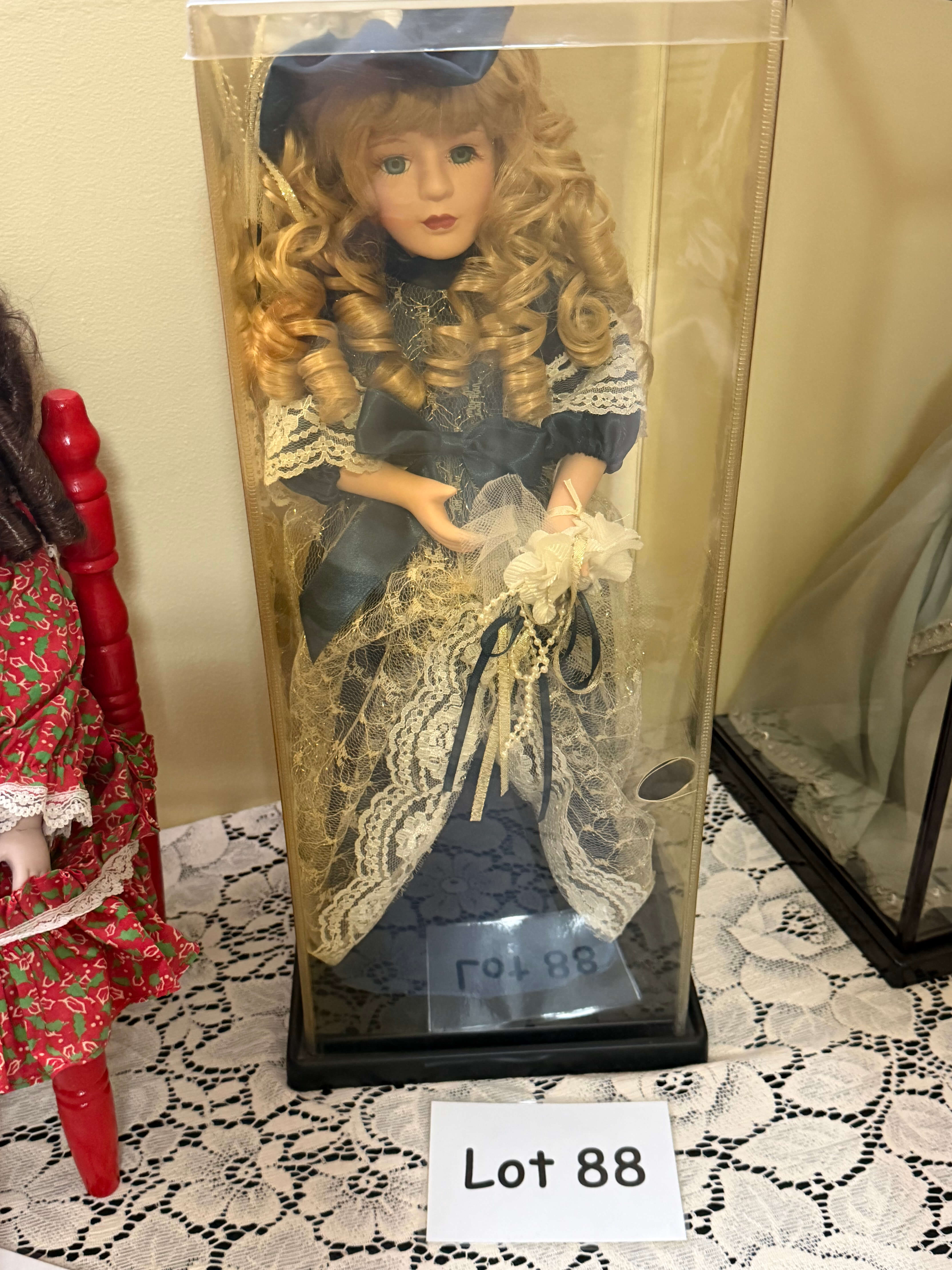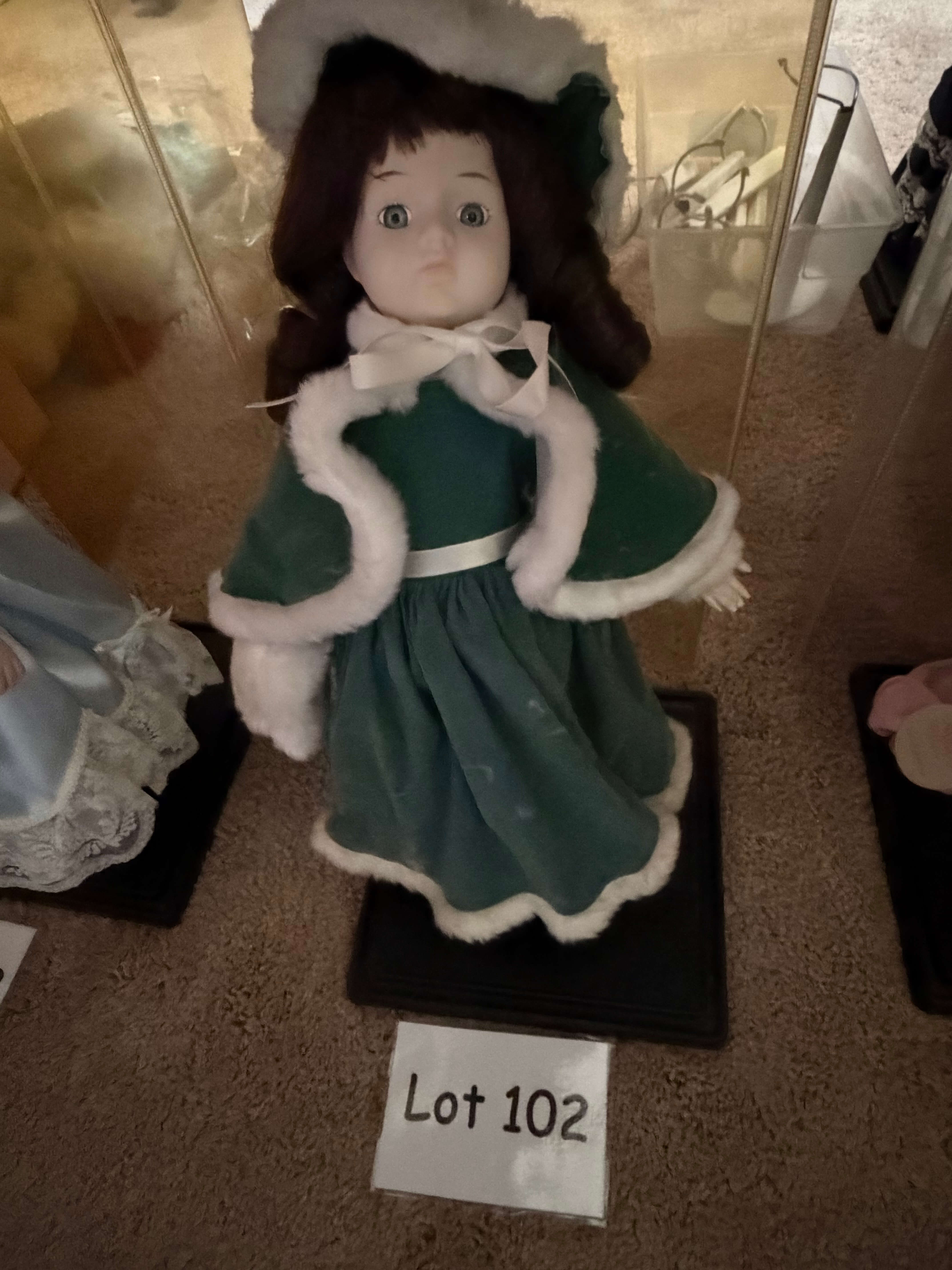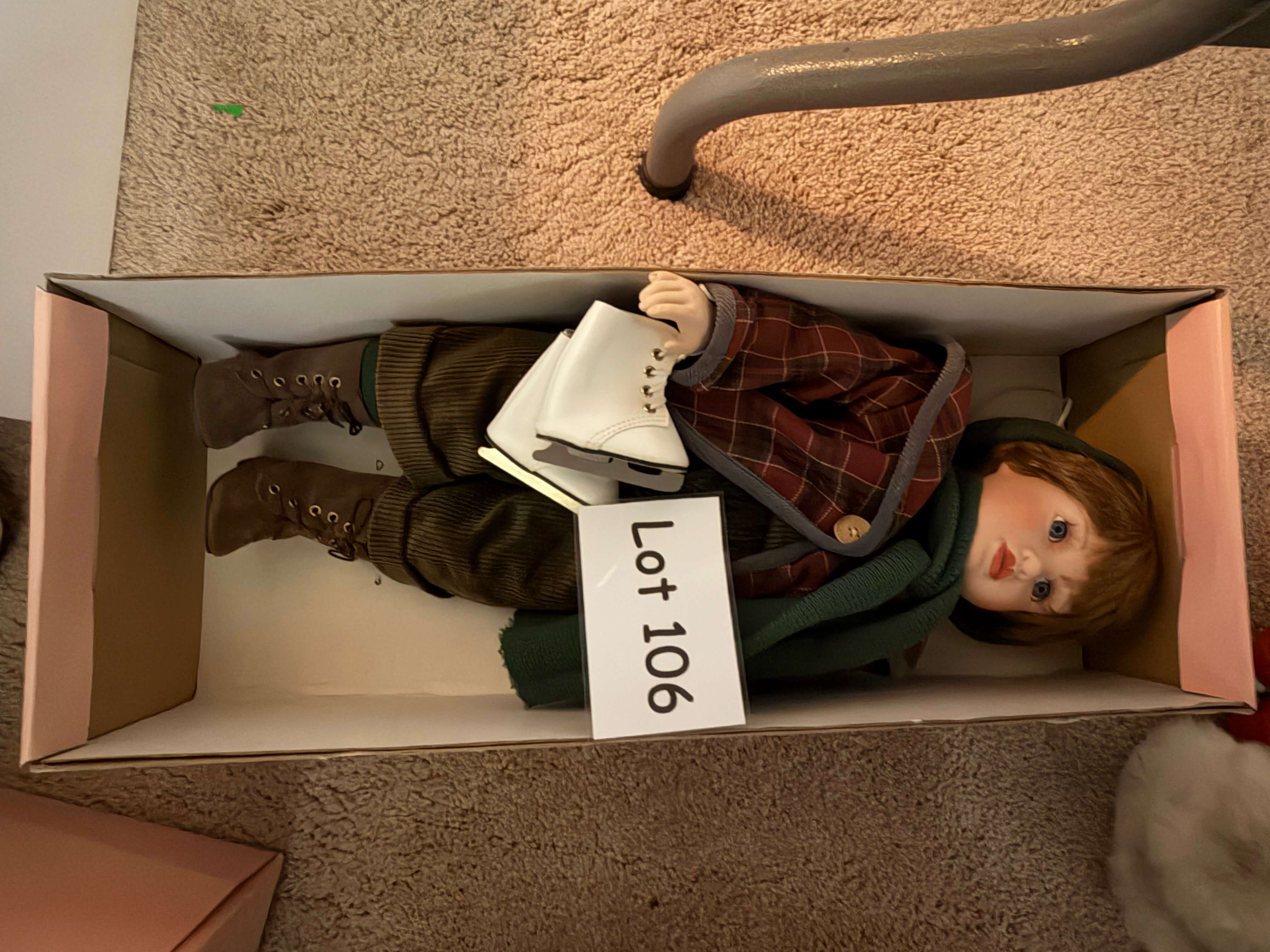Victorian Christmas Porcelain Doll, 16" w/ thin plastic case