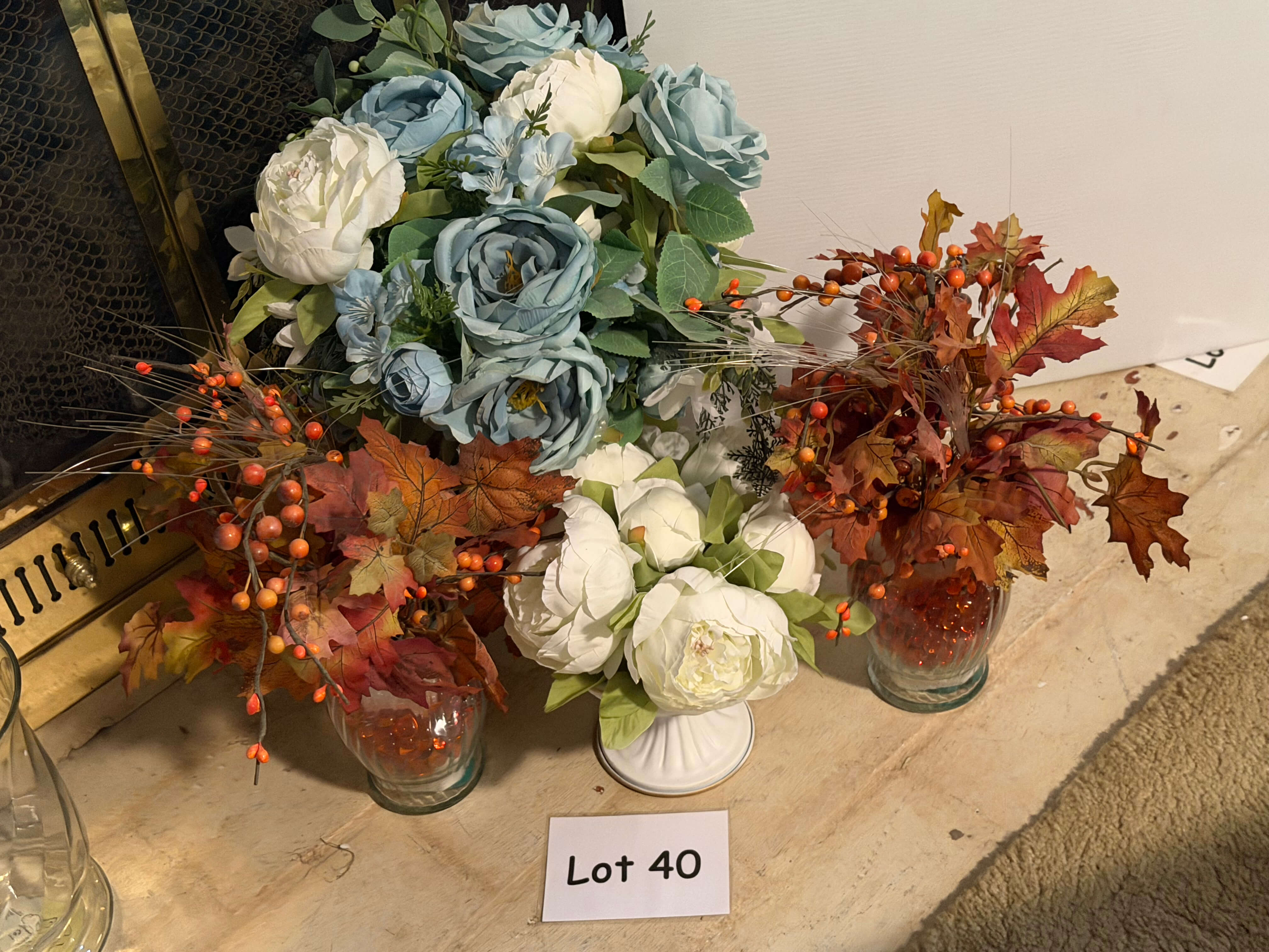 4 Faux Flower Arrangements in vases, tallest is 16"