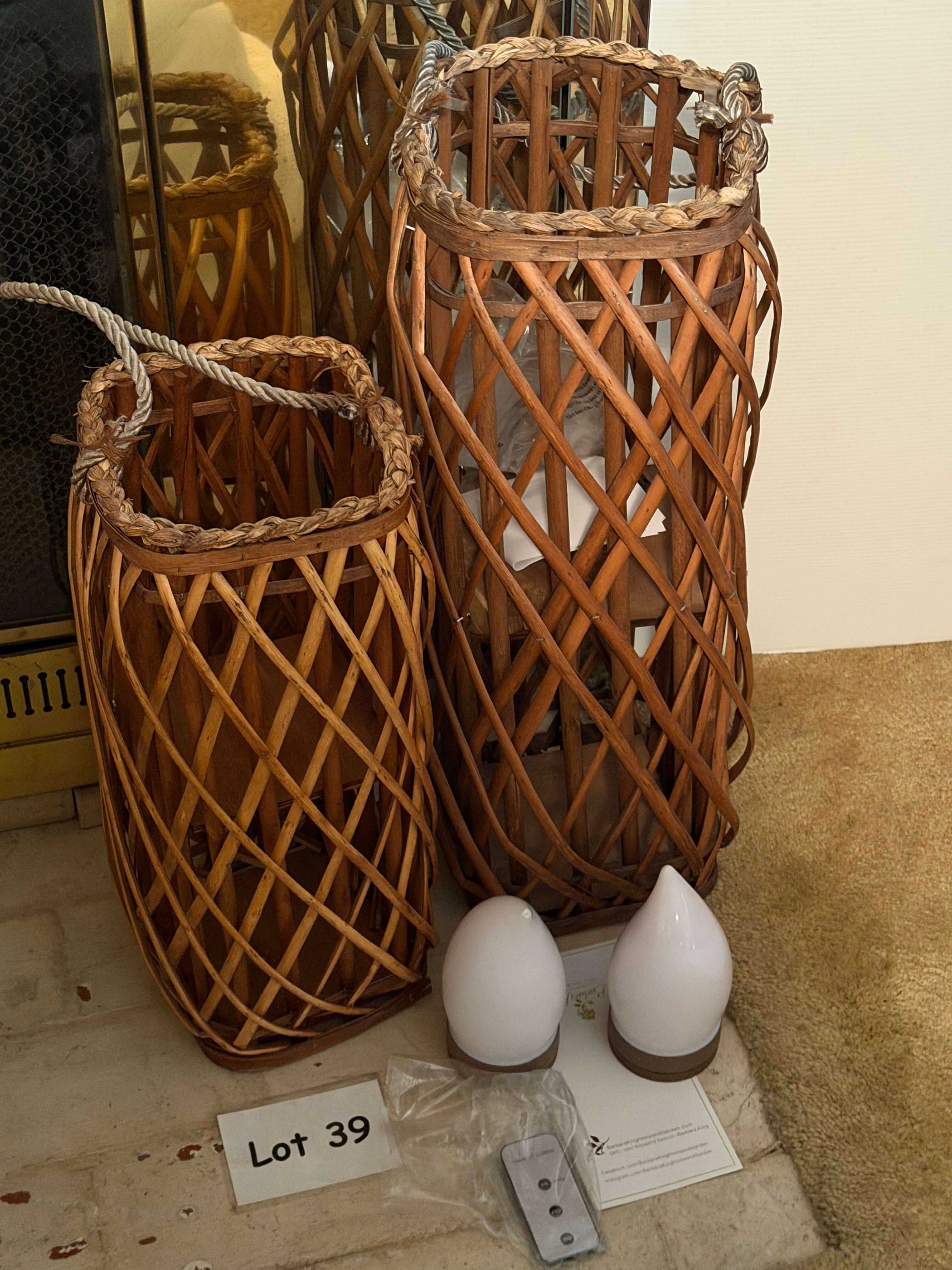 Pair of Large Woven Bamboo Lanterns, 18" & 23 1/2" tall. Includes 2 battery op flame lights. From Barbara King Home & Garden