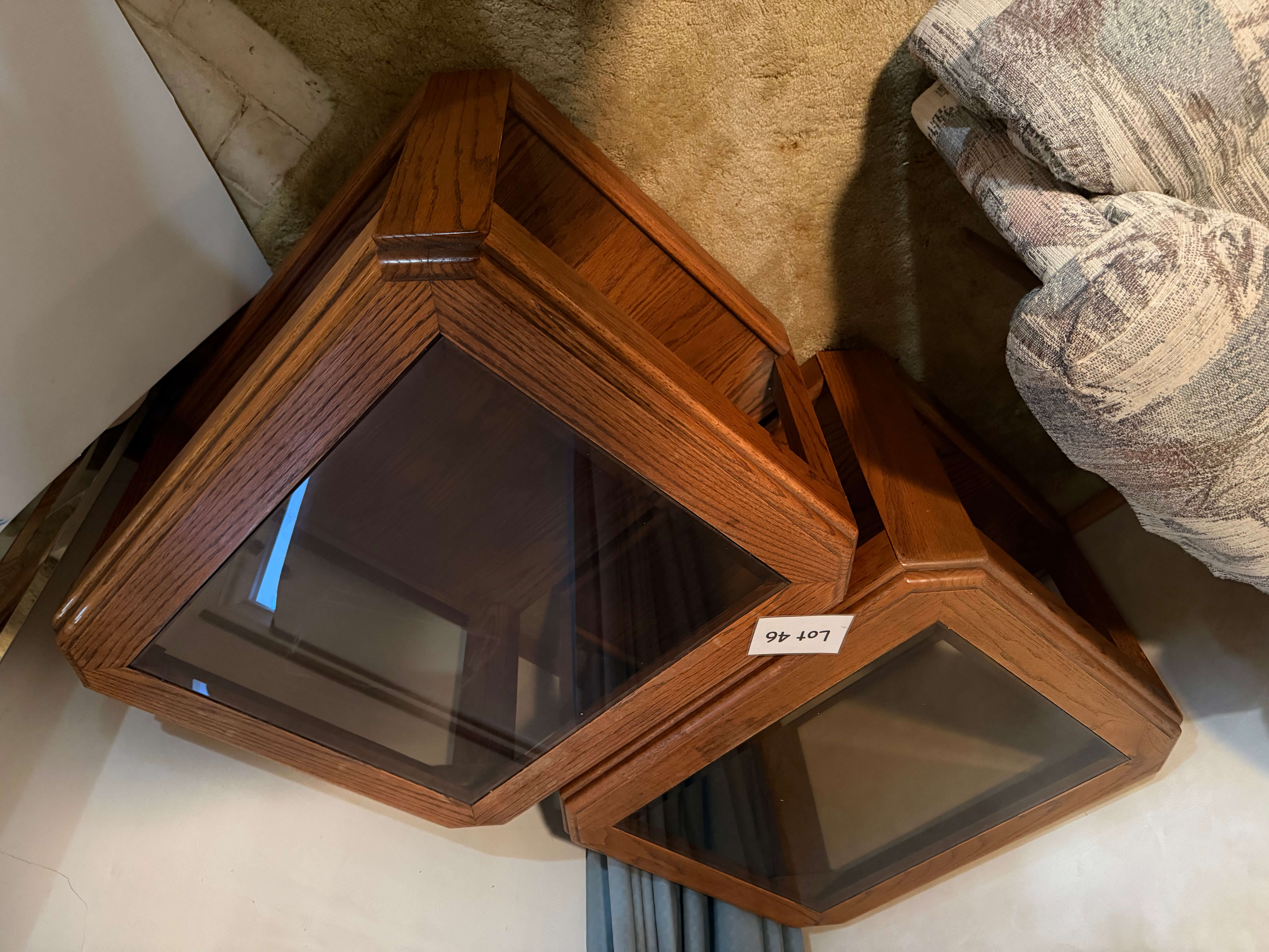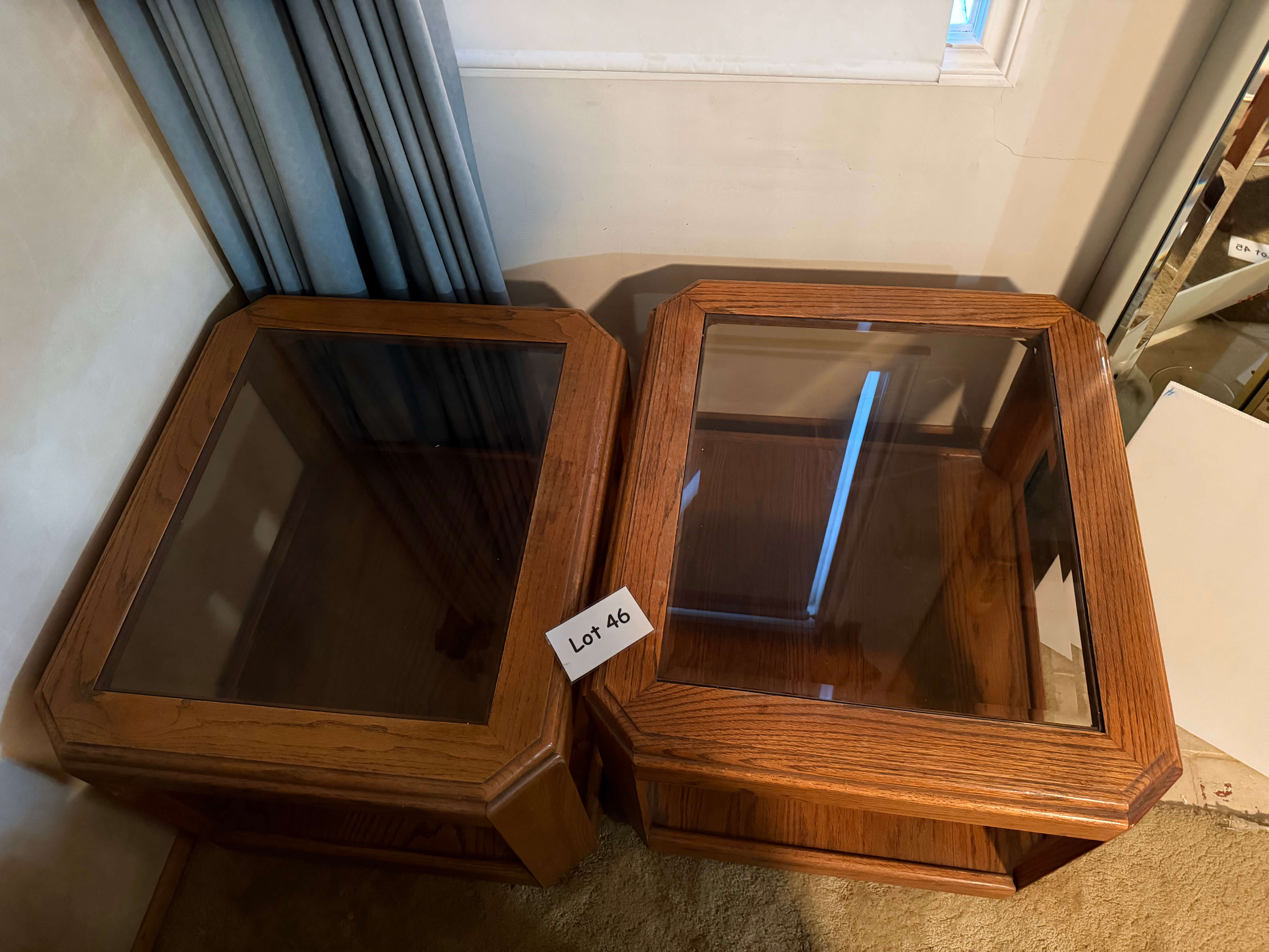 Pair of Oak End Tables with Glass Tops. 24"w x 28"d x 20"h