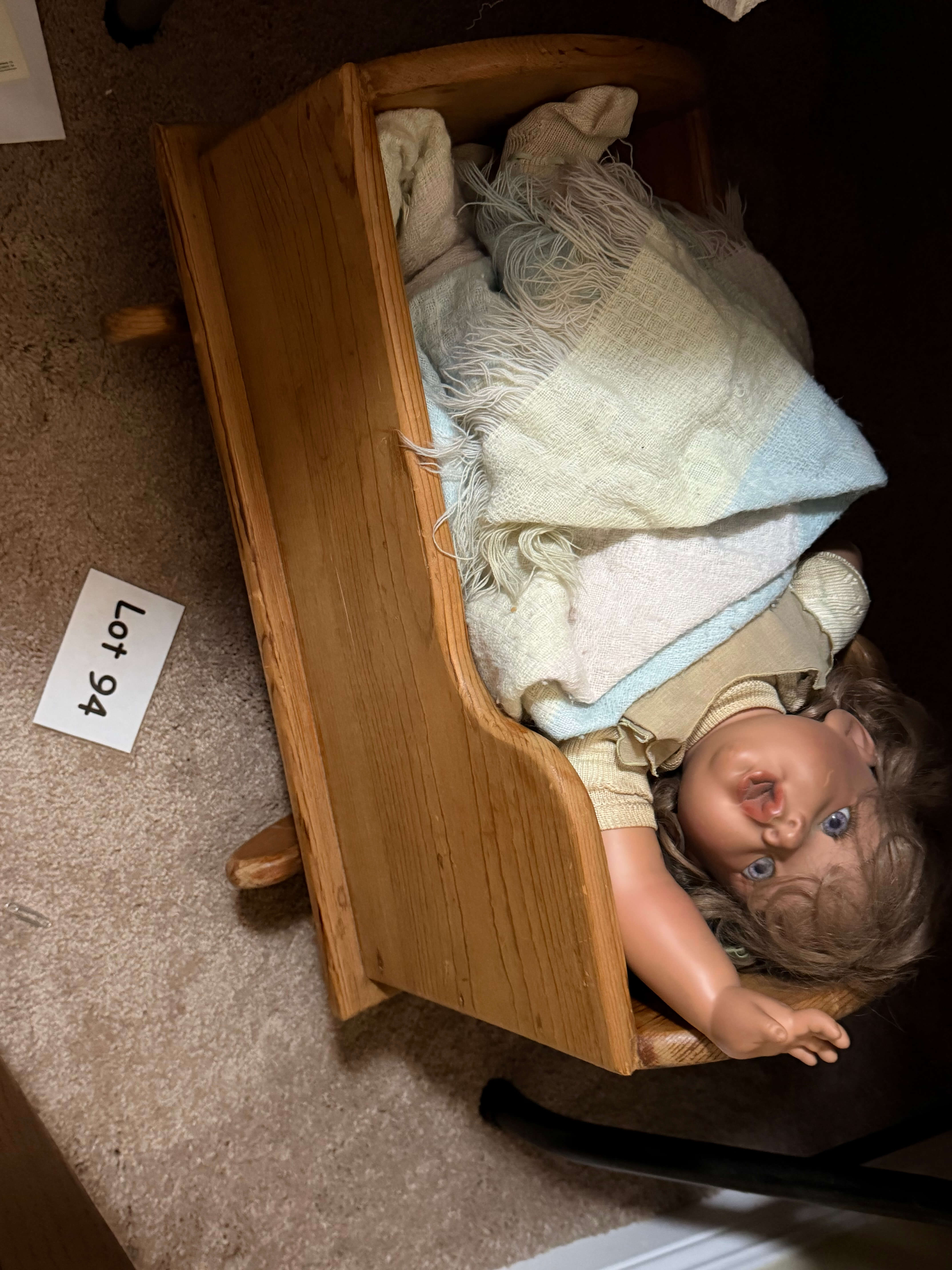 Baby Doll in Wood Cradle, 20"l x 11"w x 16"h