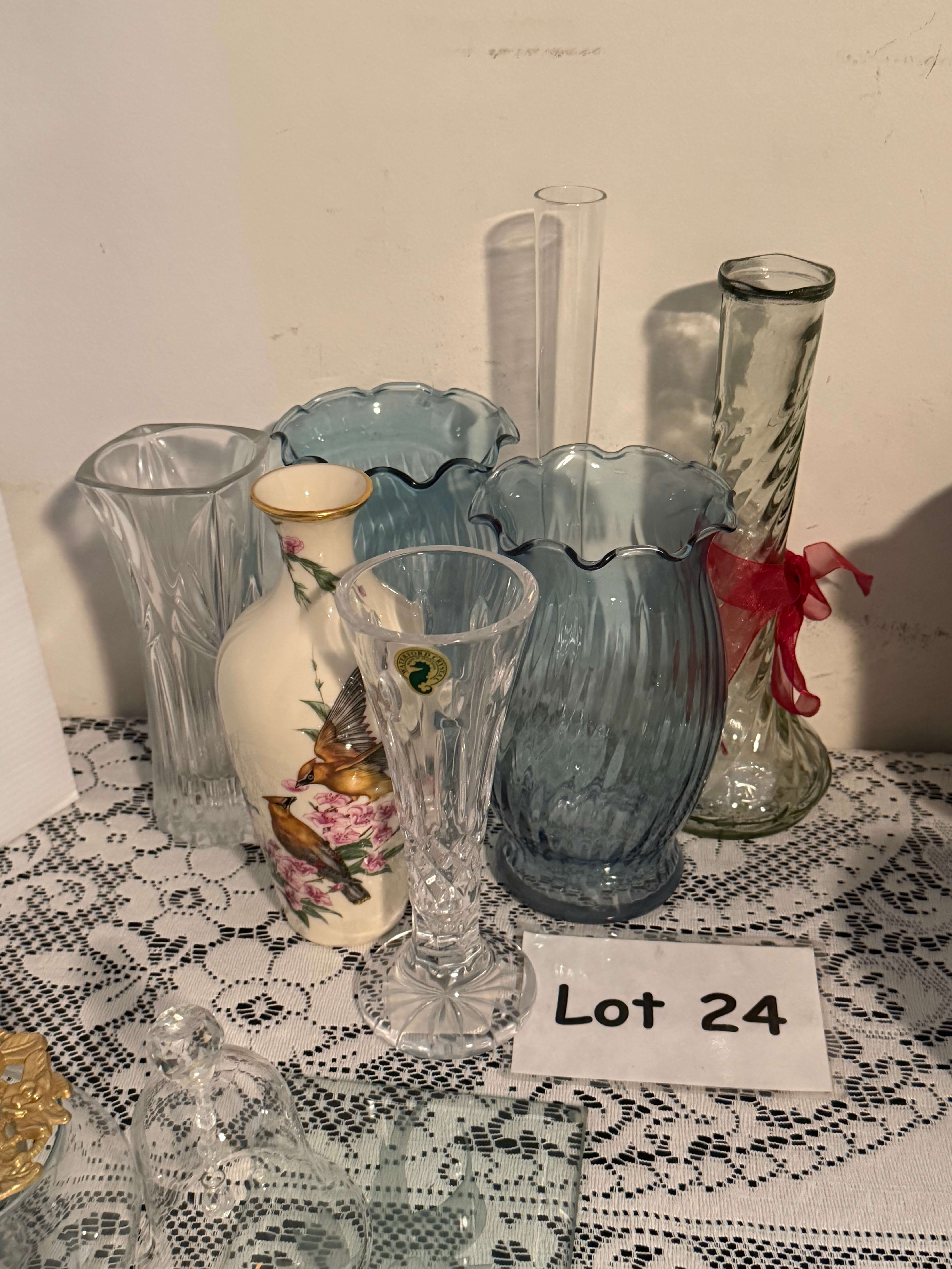 Variety of 7 Small Vases, mostly glass (including 1 from Waterford). Tallest is 8"h