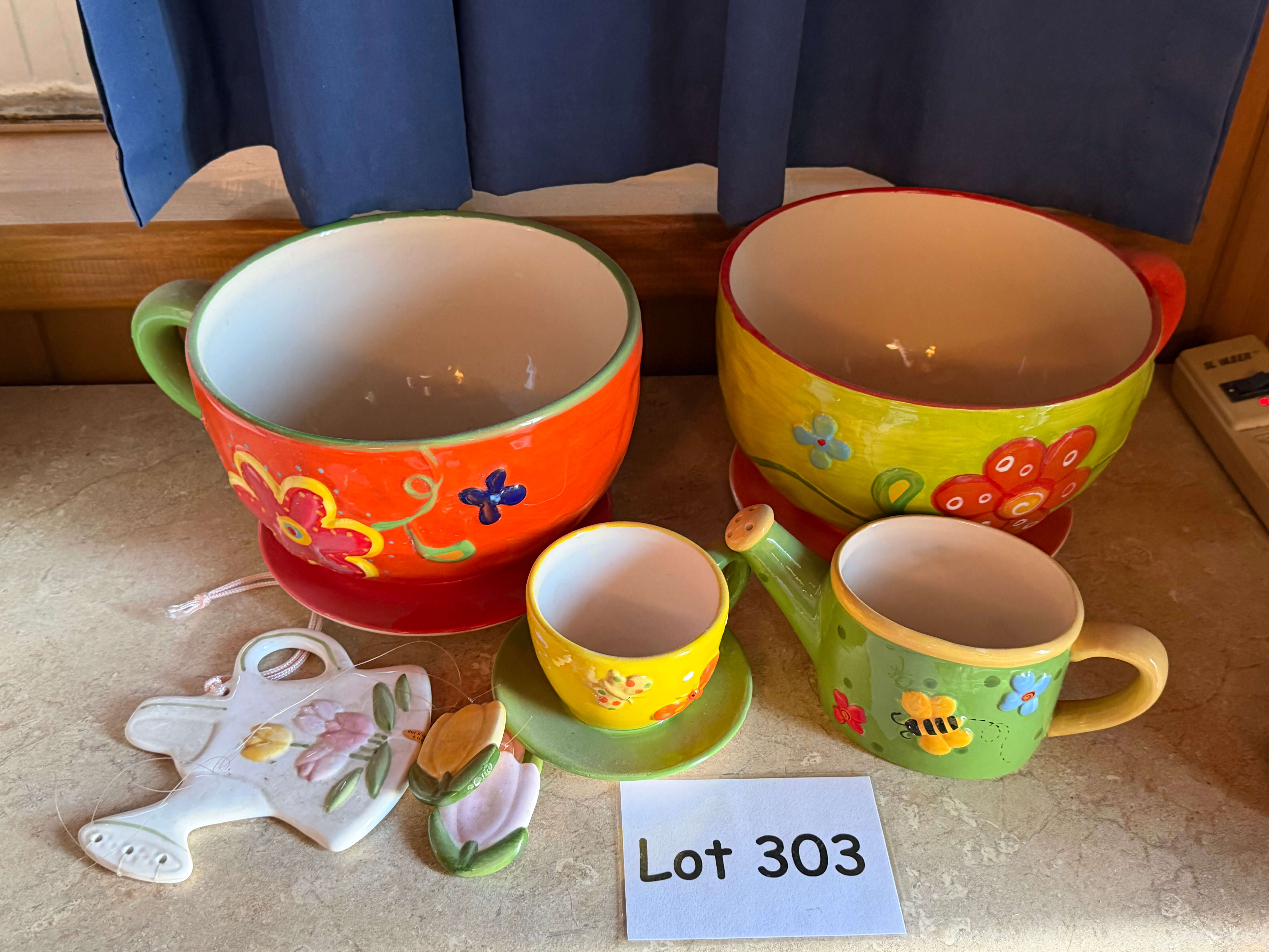 4 Ceramic Plant Pots & 1 Chime. Largest mugs are @ 6" diam