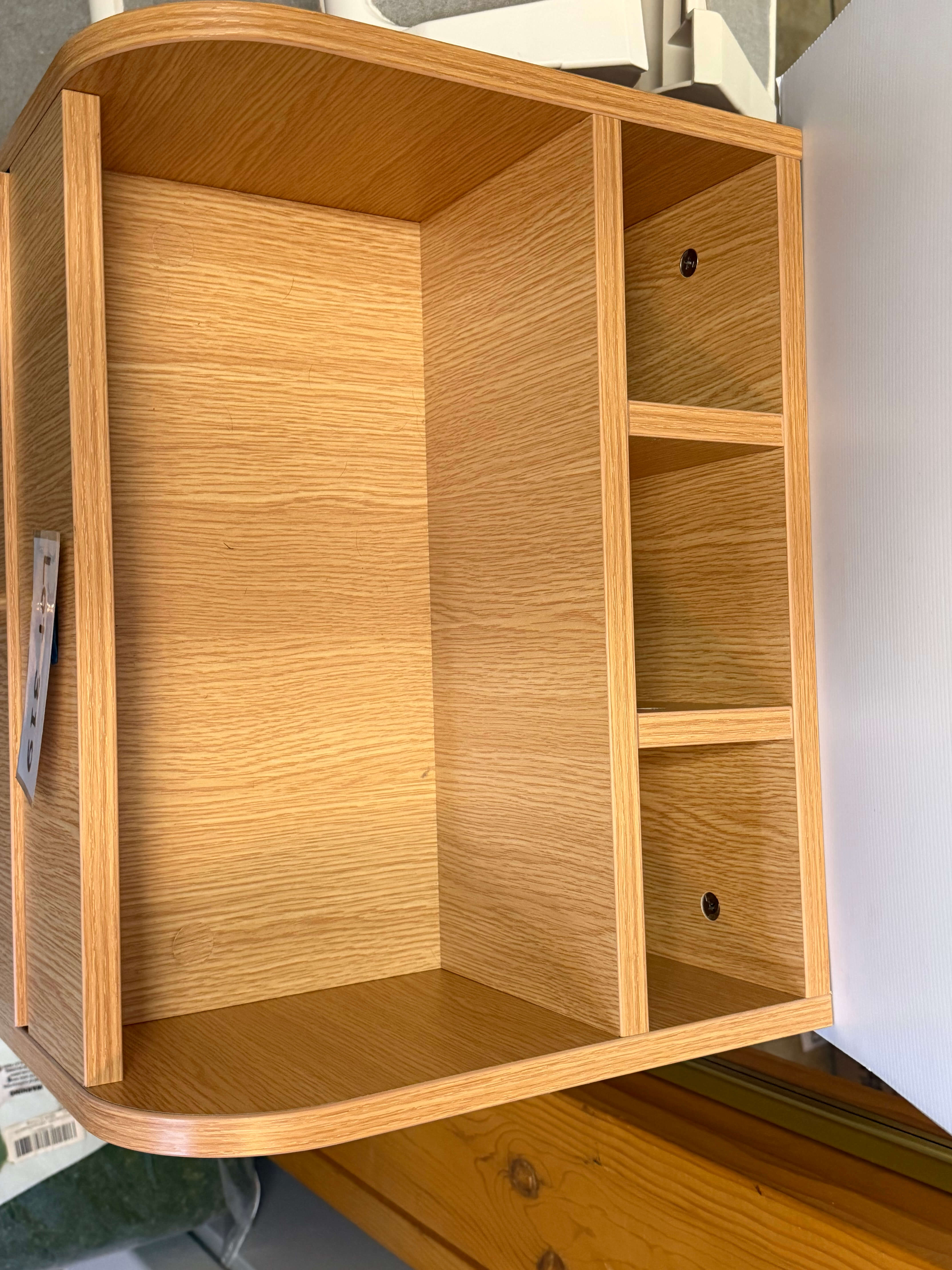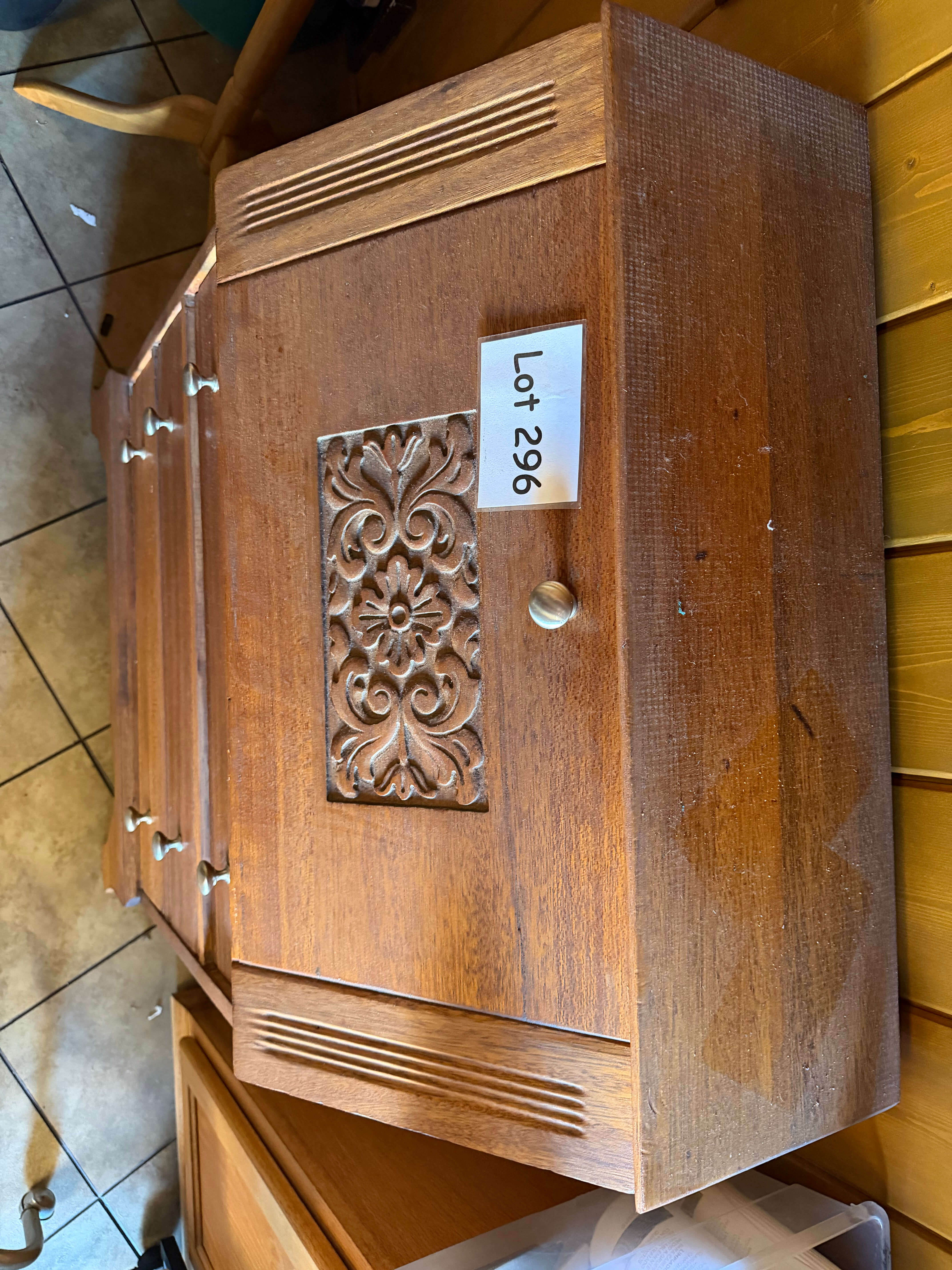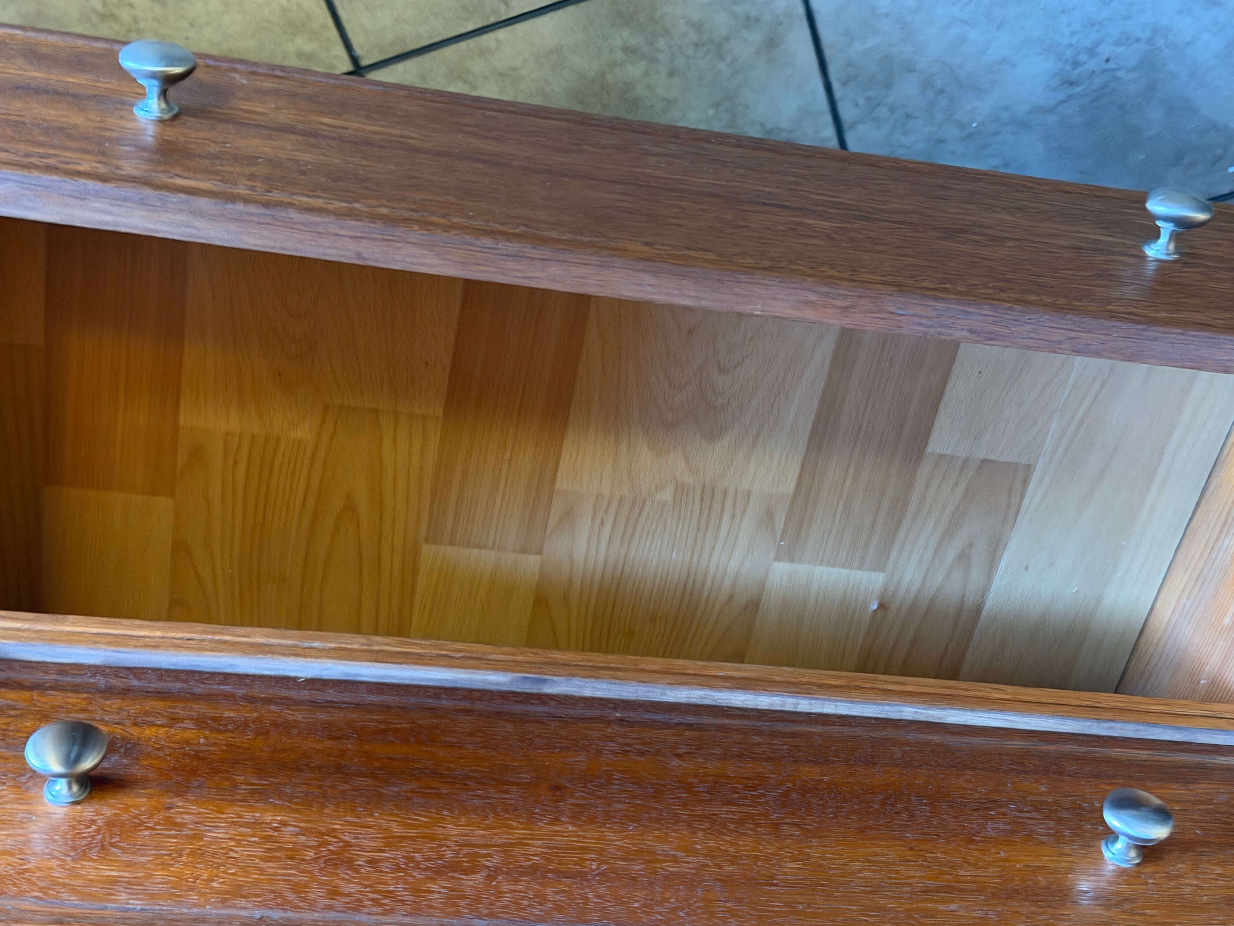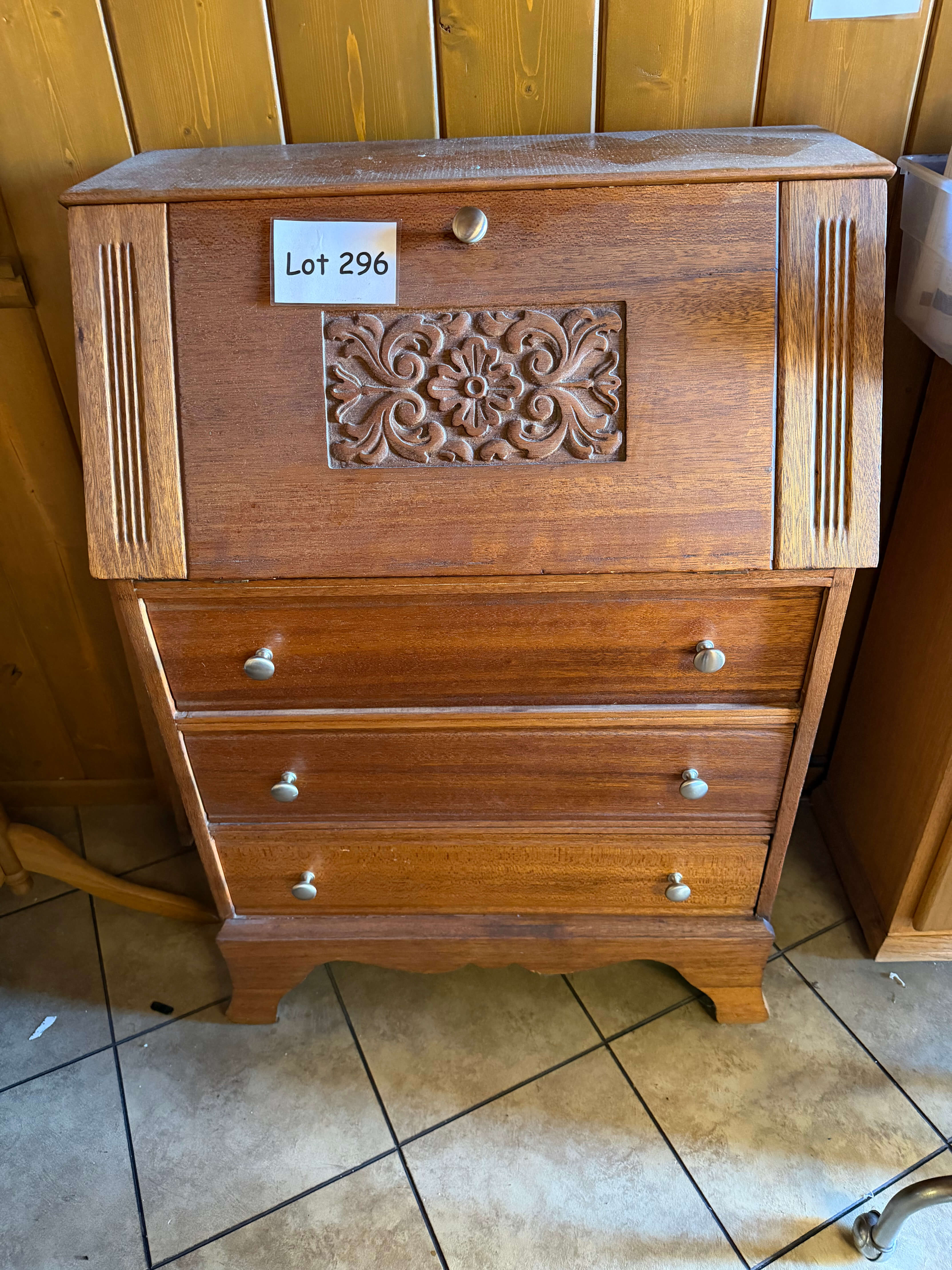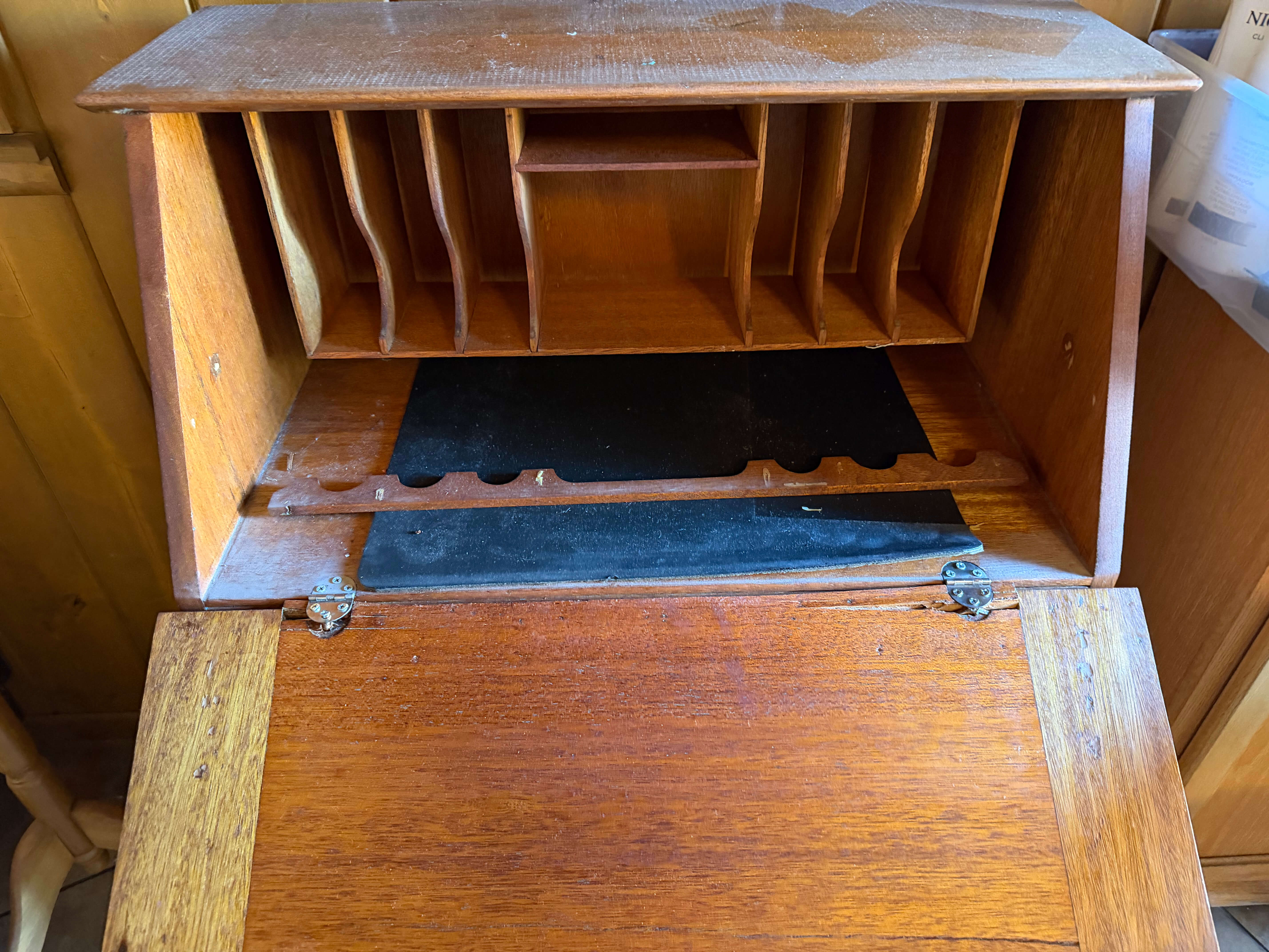 Wood Secretary / Desk, 28 1/2"w x 16"d x 41 1/2"h. Hinges are damaged on desk opening and surfaces have some minor scuffs
