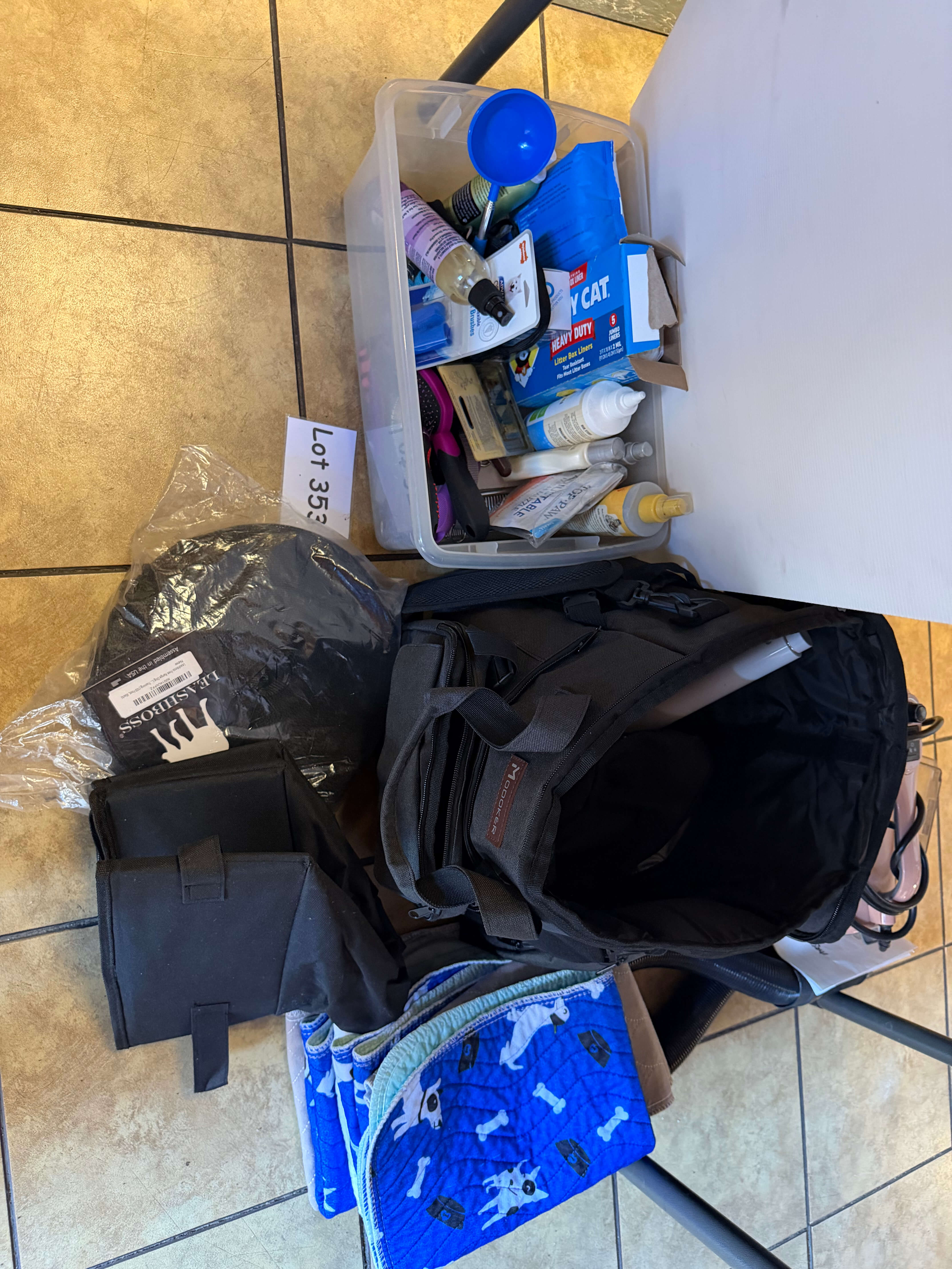 Variety of Dog Grooming Tools -- sprays, clips, extra long leash, bag, dog pads...