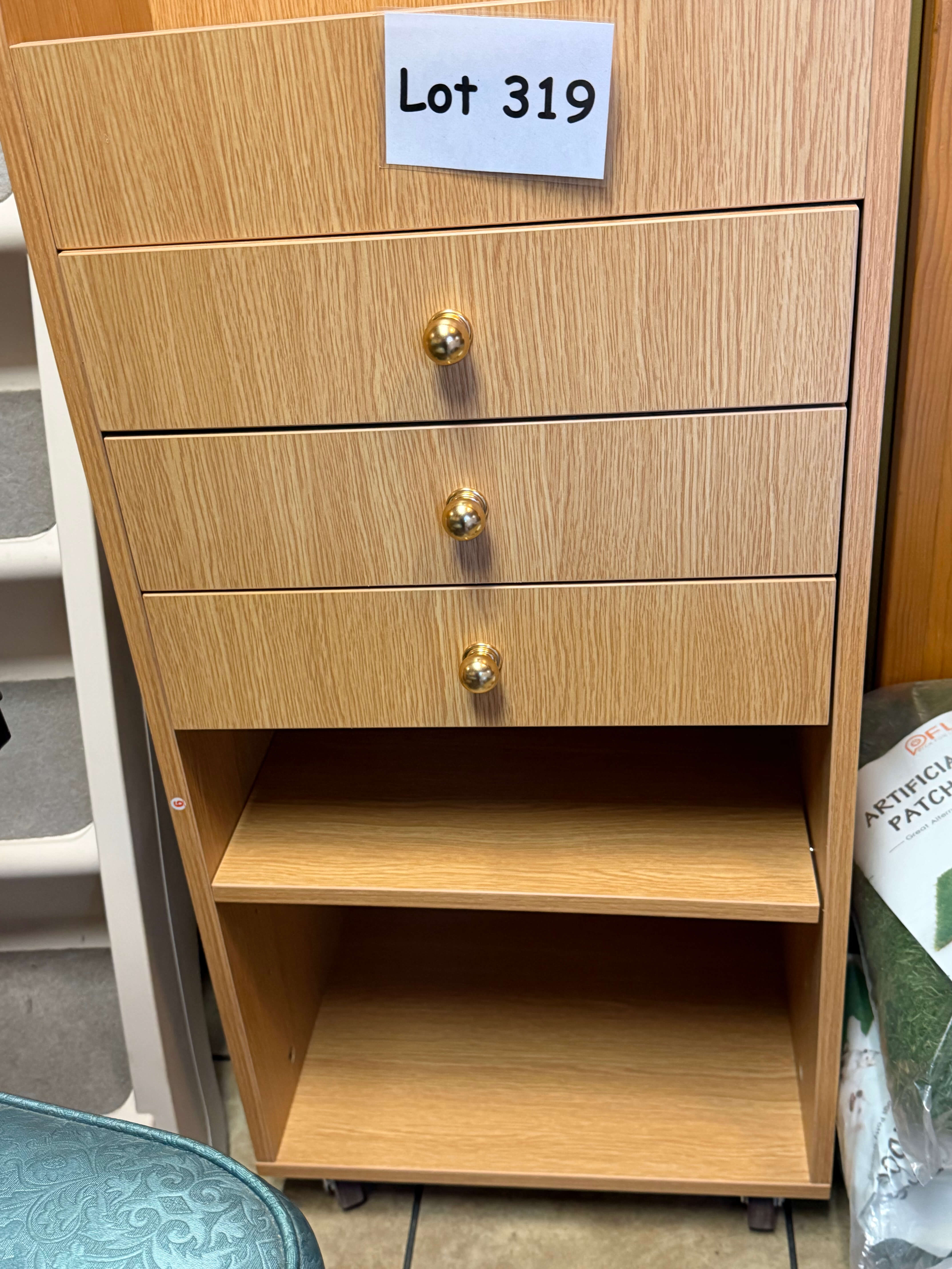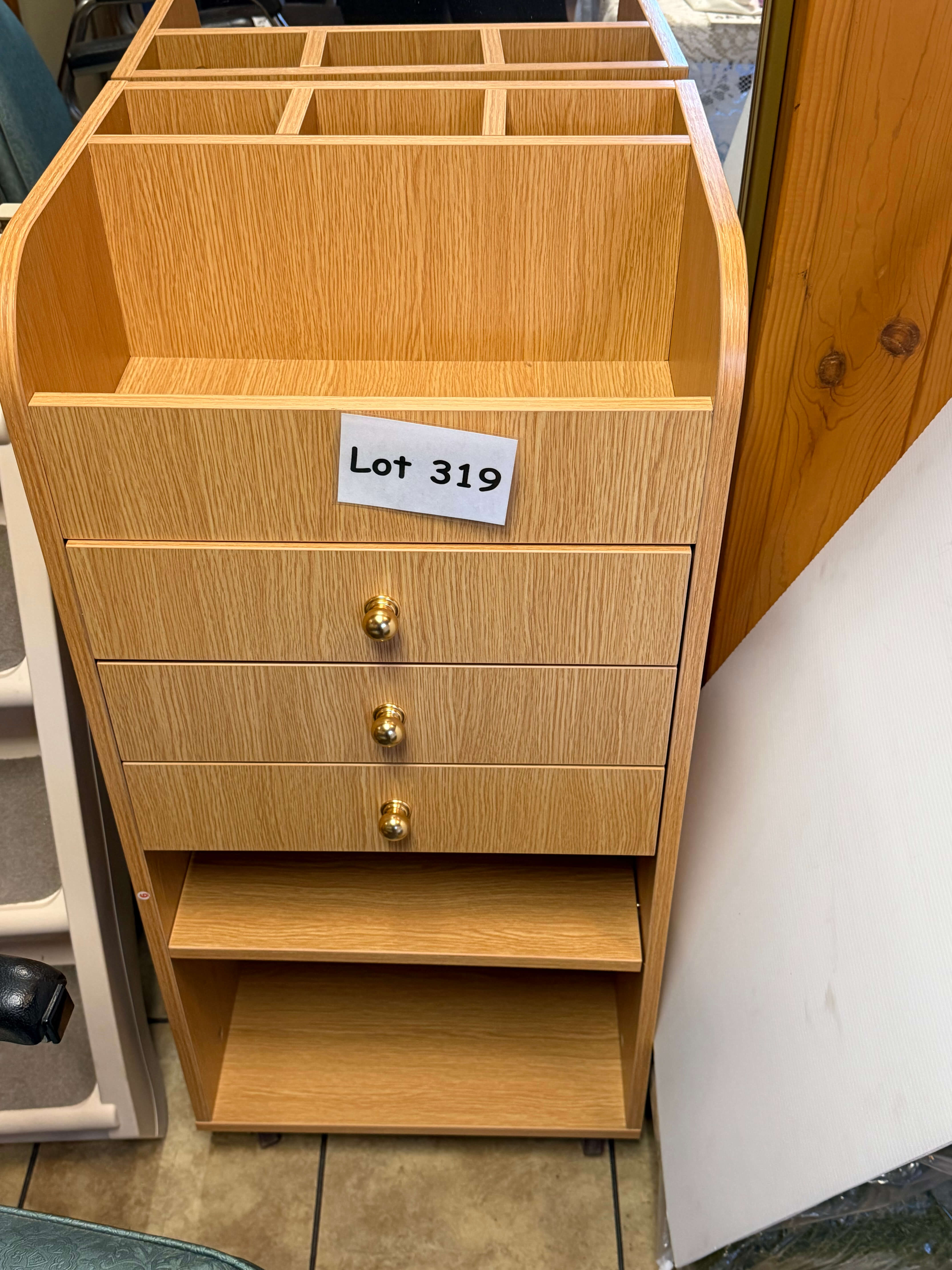 Salon Equipment Trolley, 18"w x 13 1/2"d x 36 1/2"h. Wood laminate finish, good condition