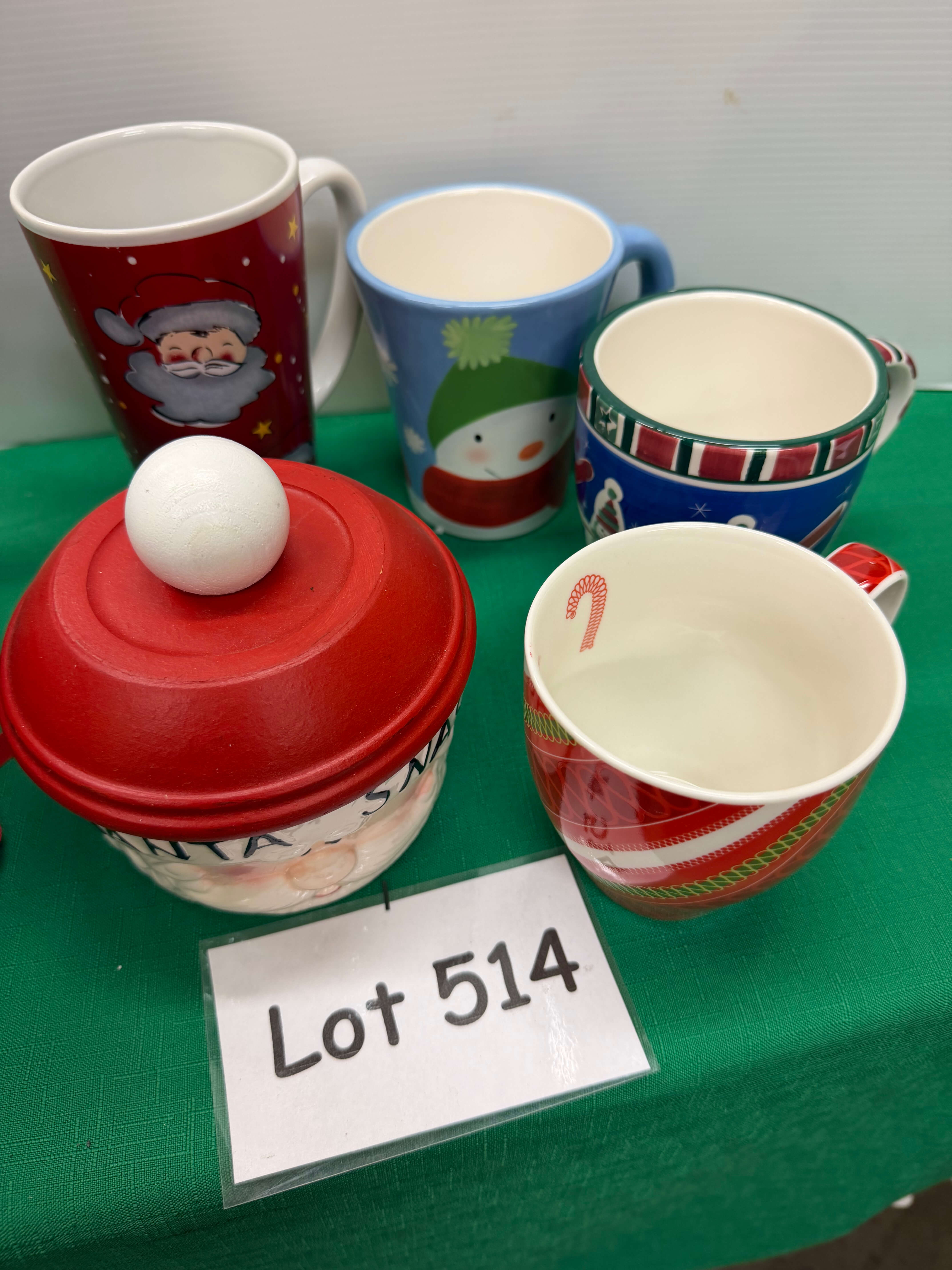 4 Holiday Mugs (1 is from starbucks) & Ceramic Santa Container