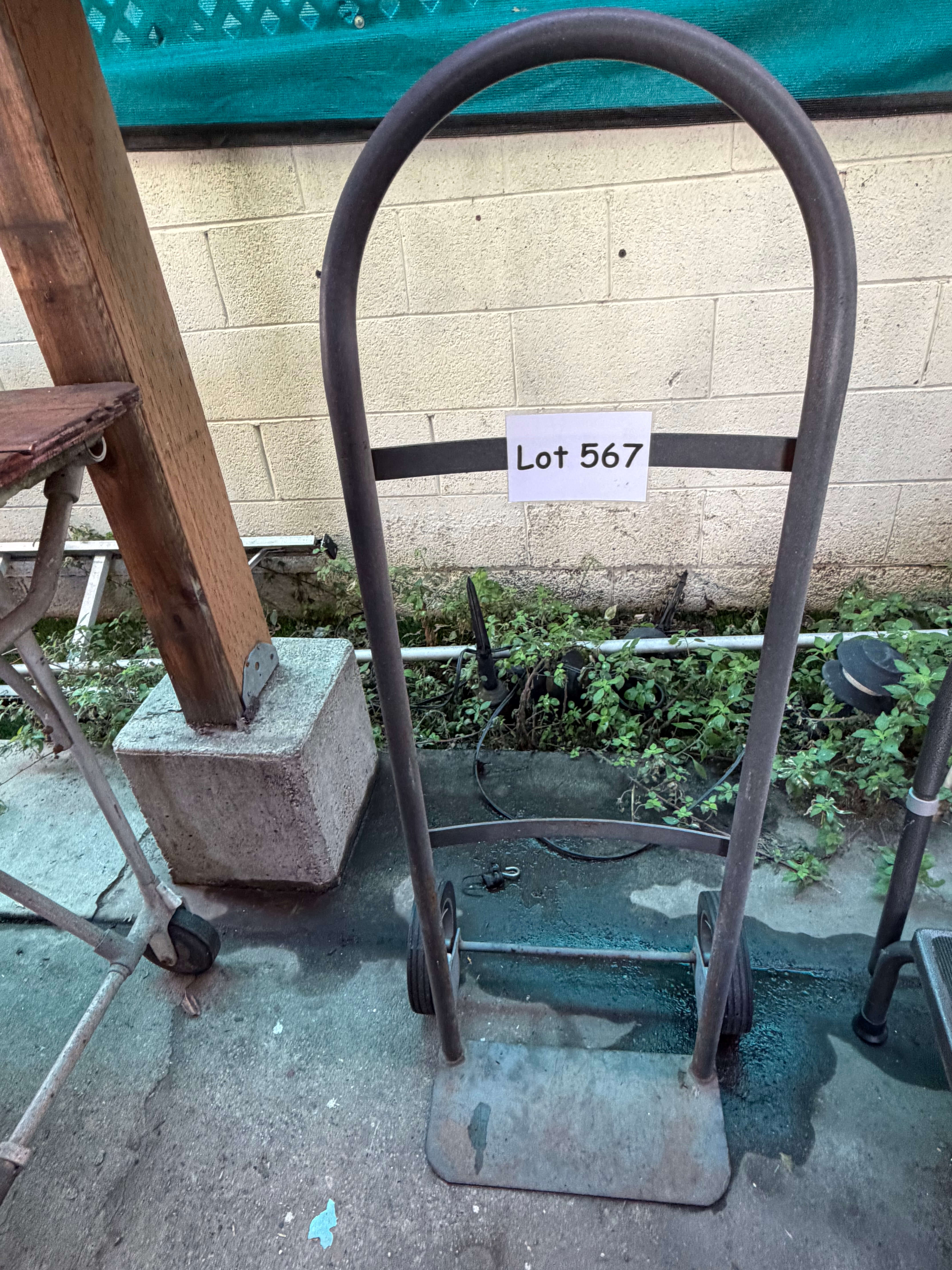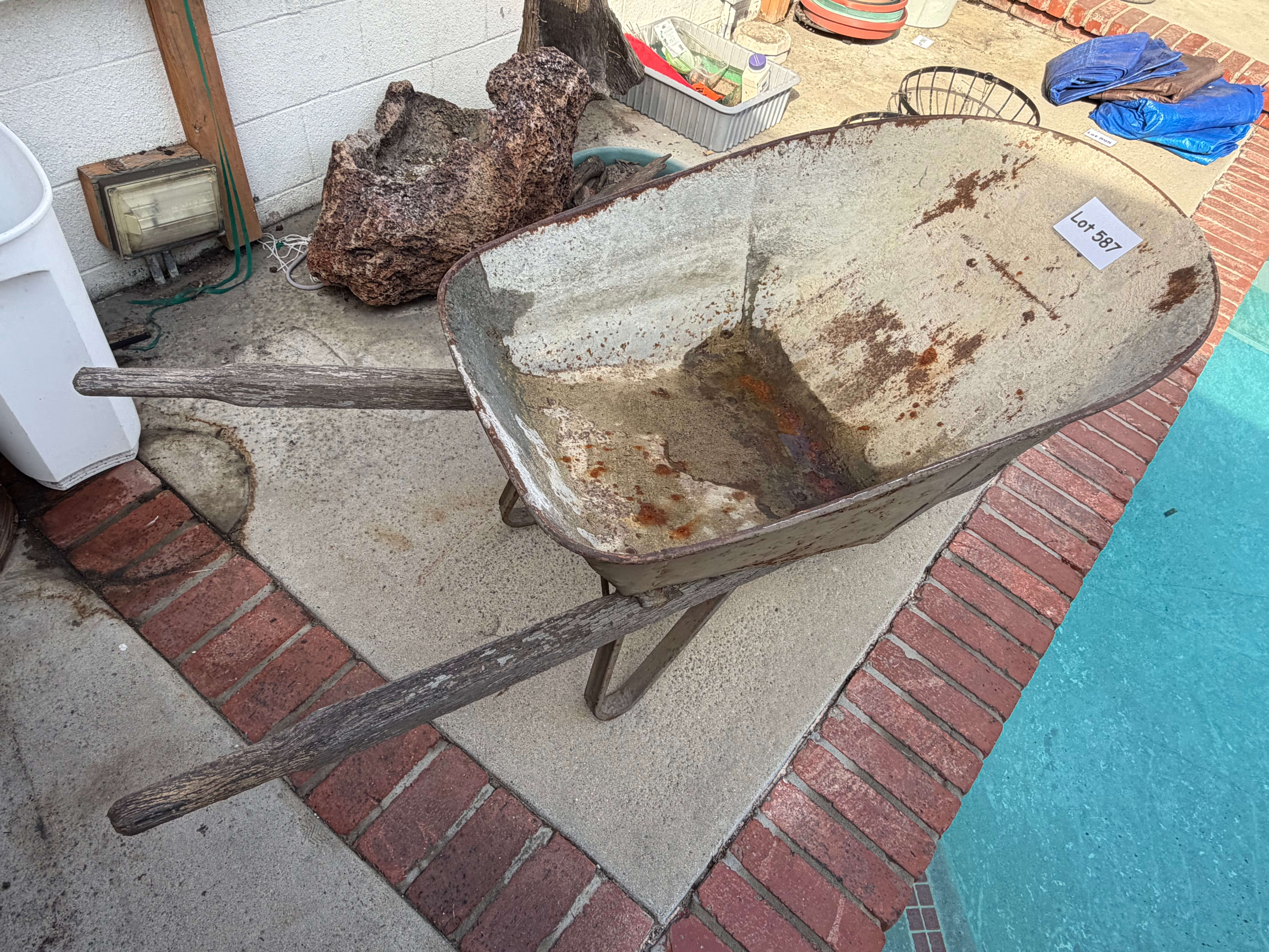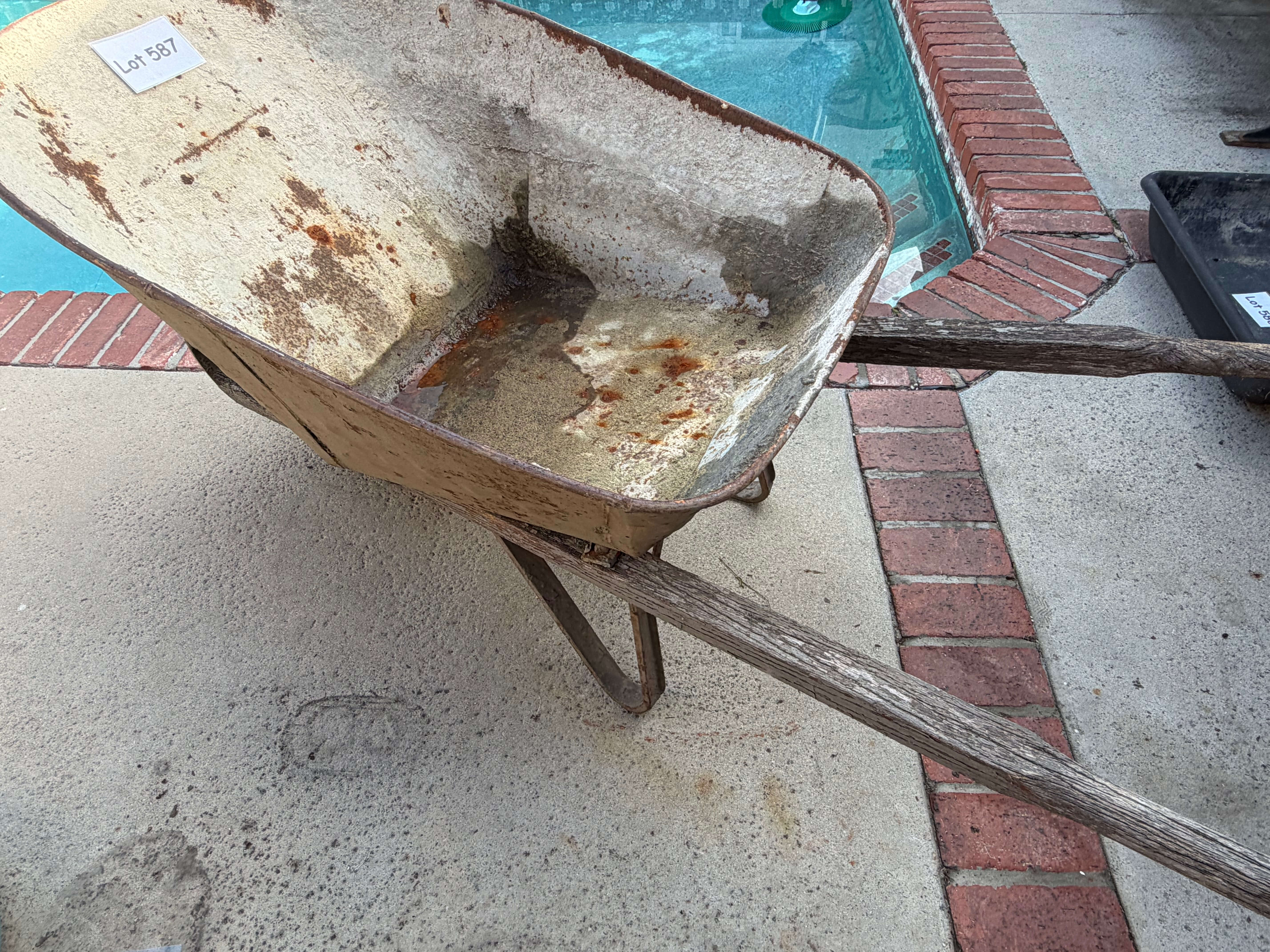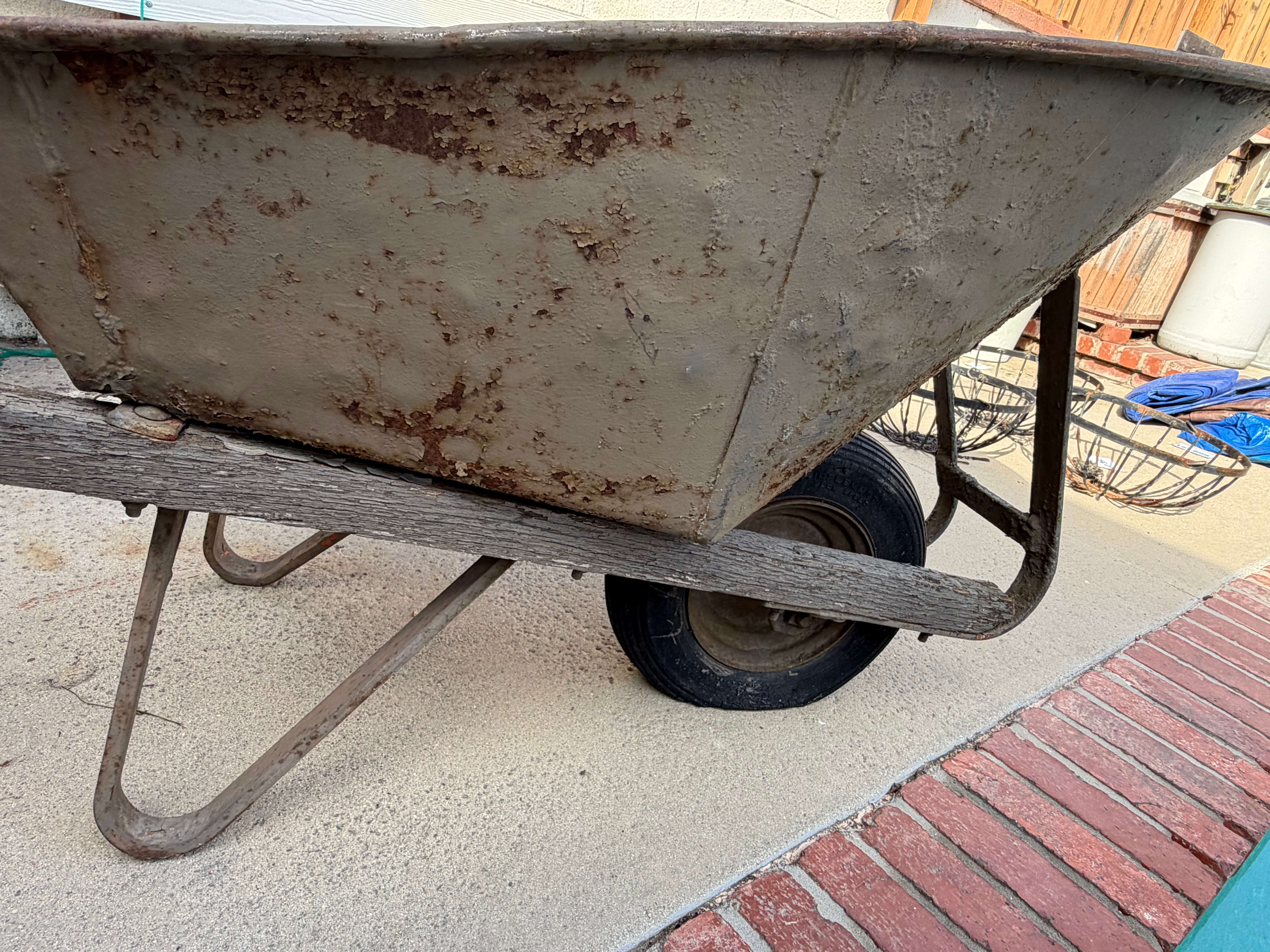 Older Metal Wheelbarrow (w/ concrete stuck to the edges), Bowl is 26"w x 43"l x 15"d. Tire is flat