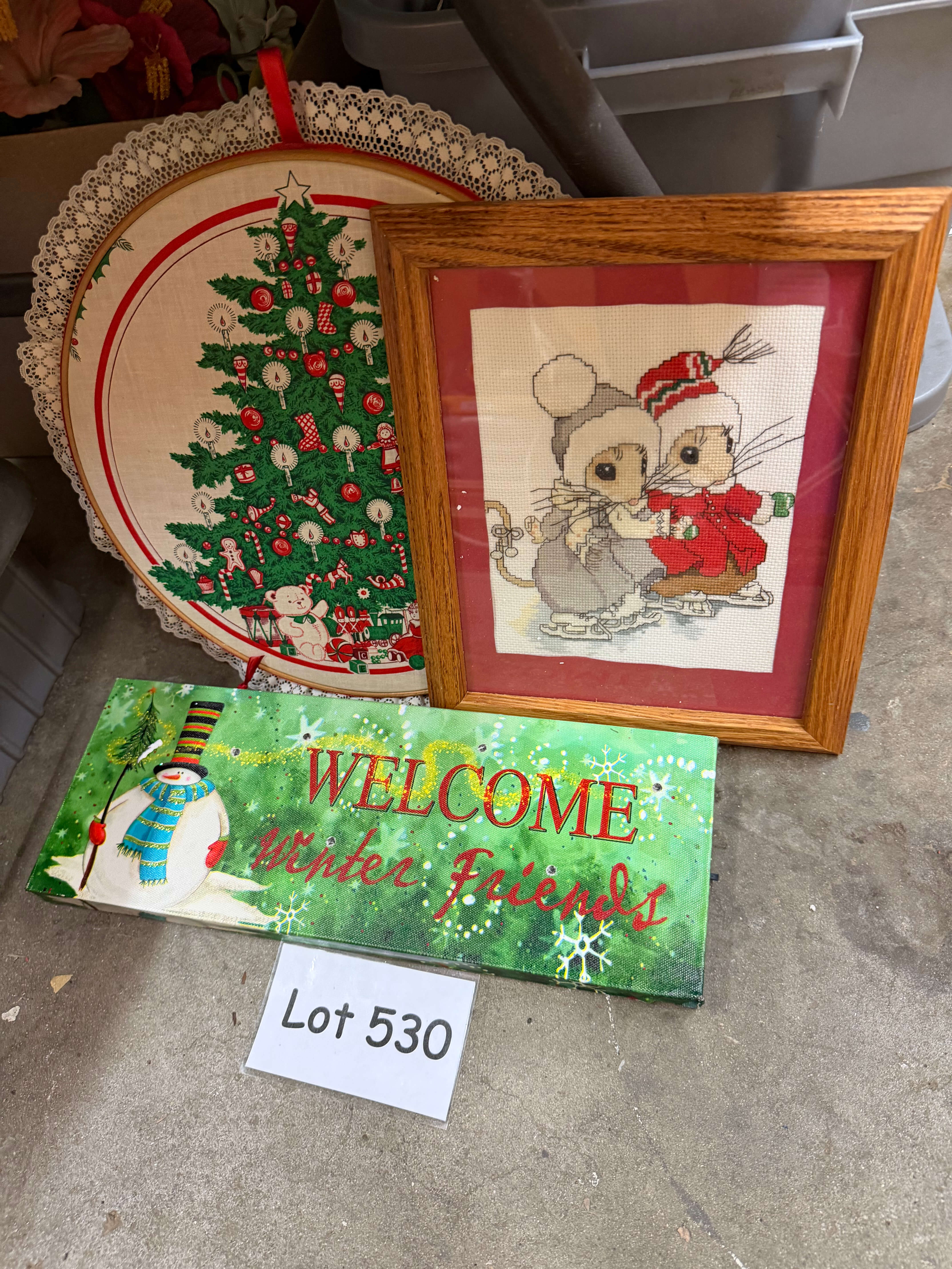 Holiday Wall Decor -- prints & Mouse Needlepoint. Largest measures @ 12" diam