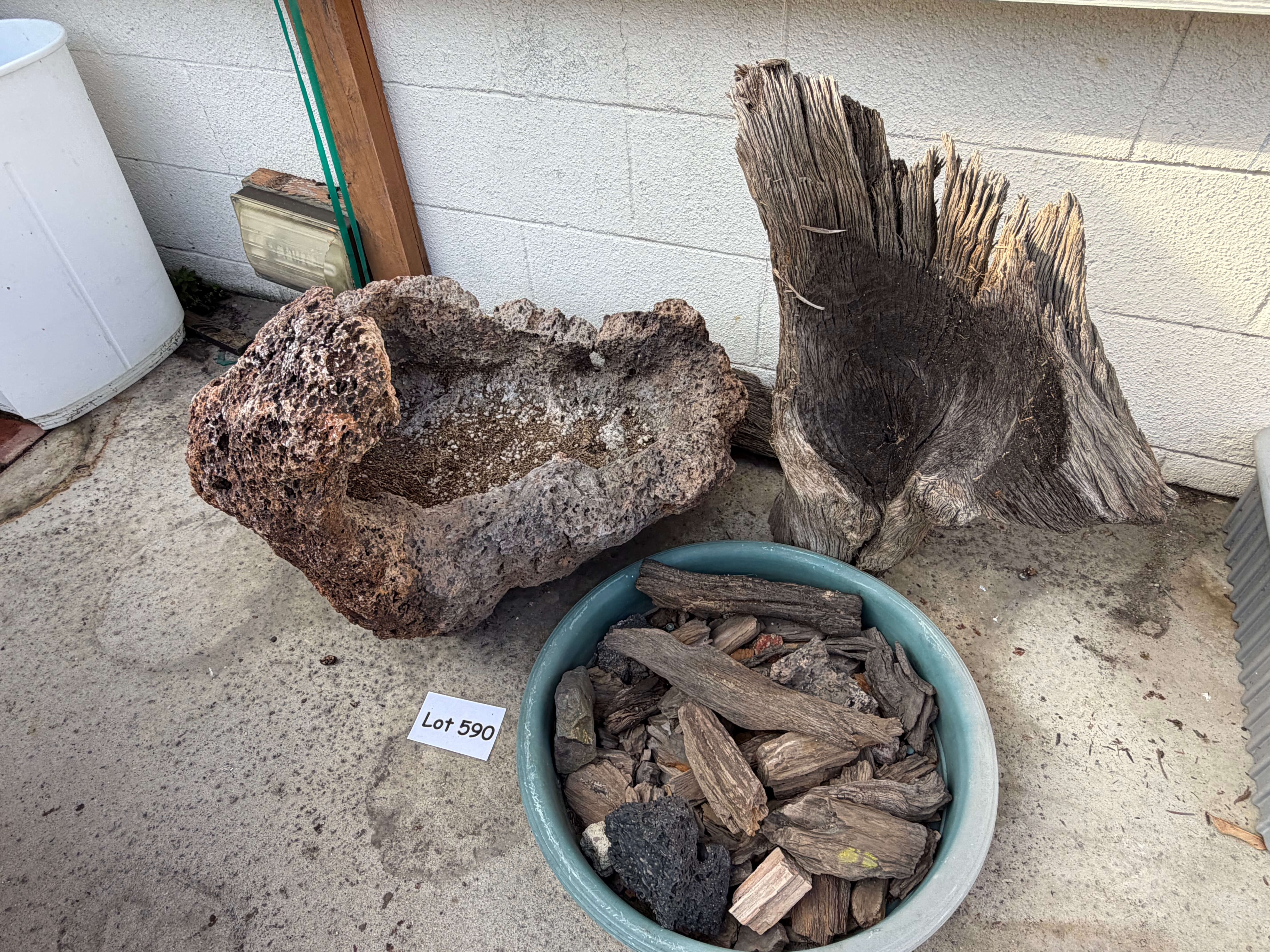 Yard Art -- Natural Wood Pieces, Stone & Petrified Wood. Largest stone piece is 28"l x 23"h