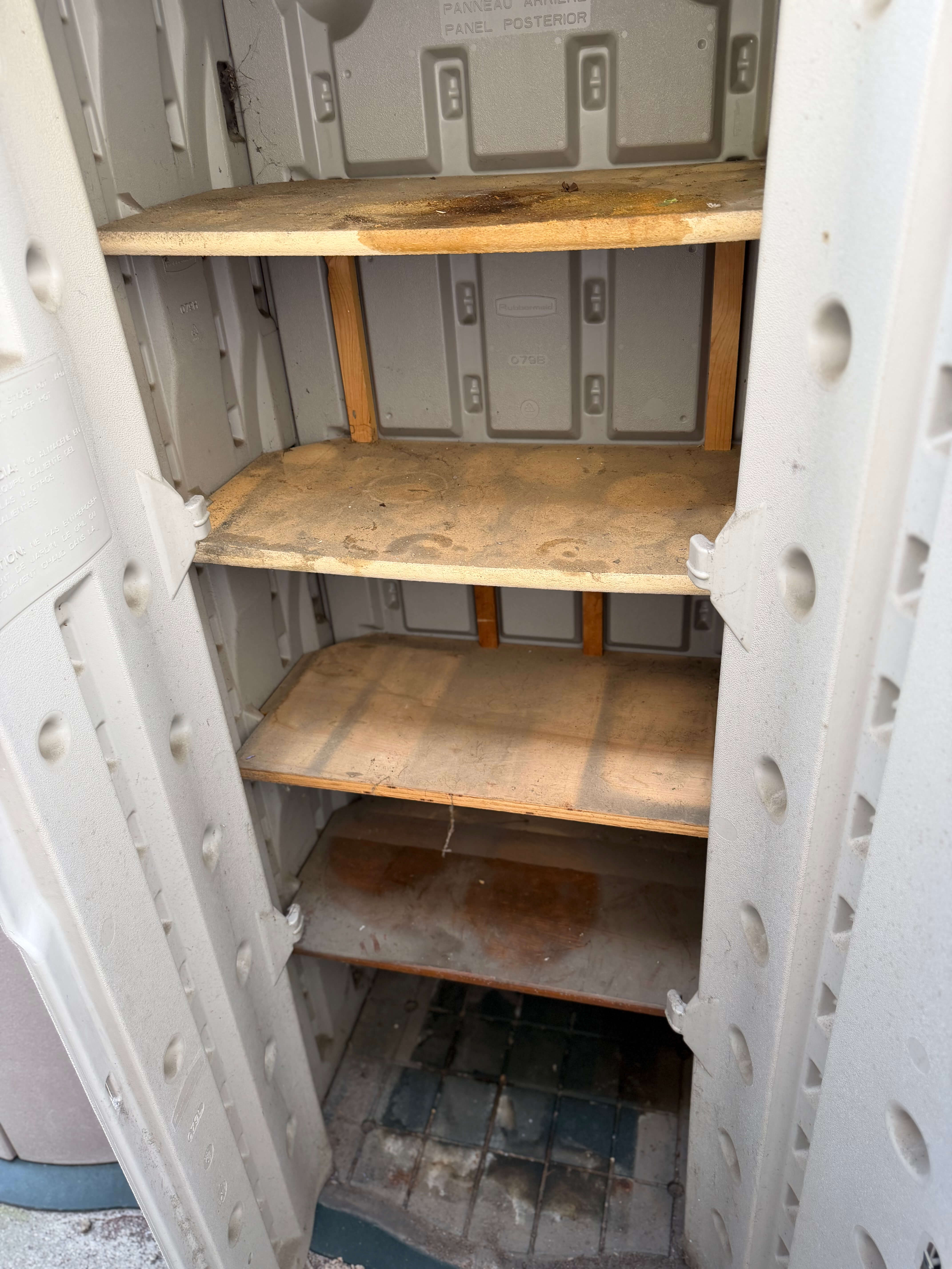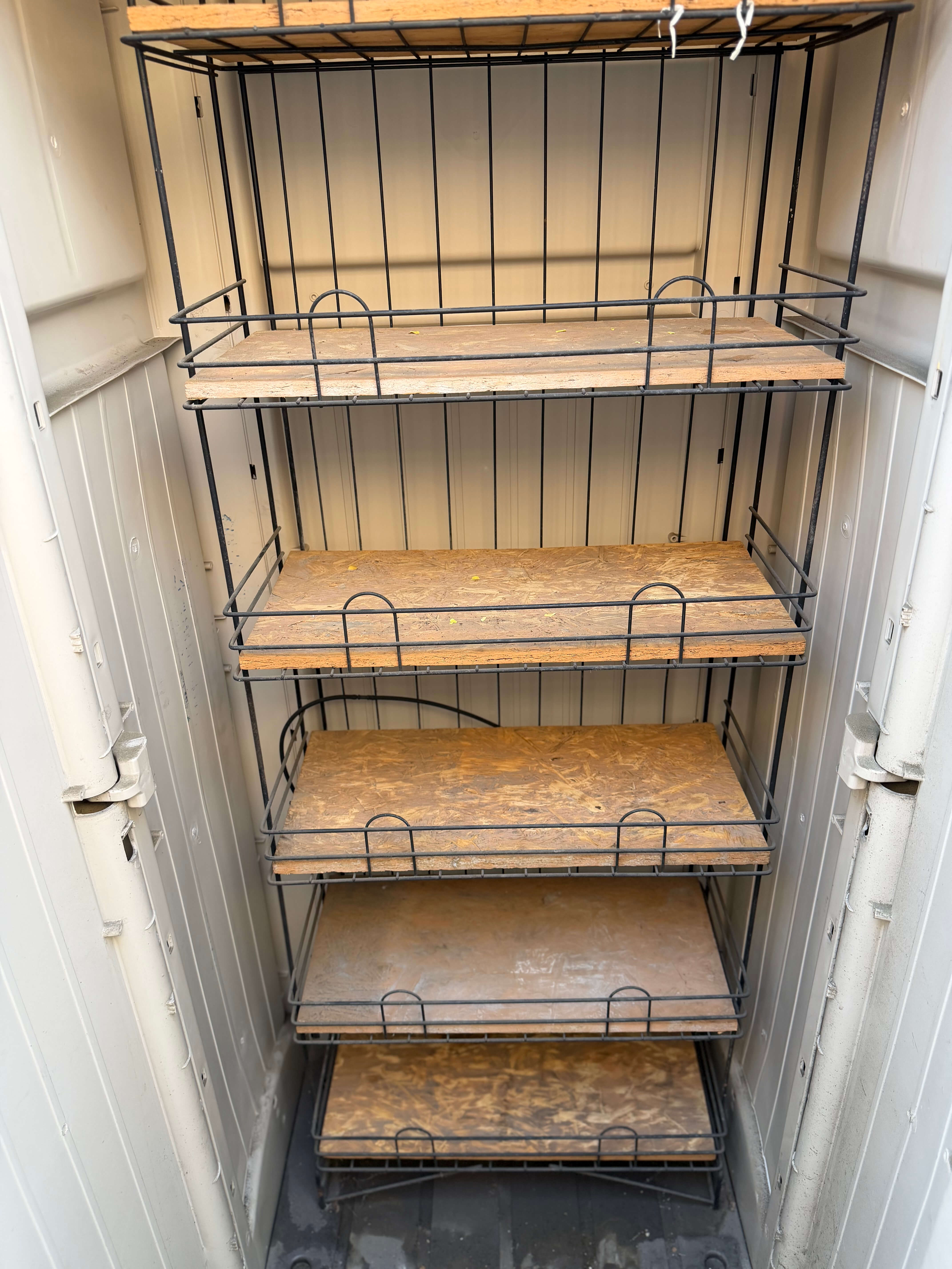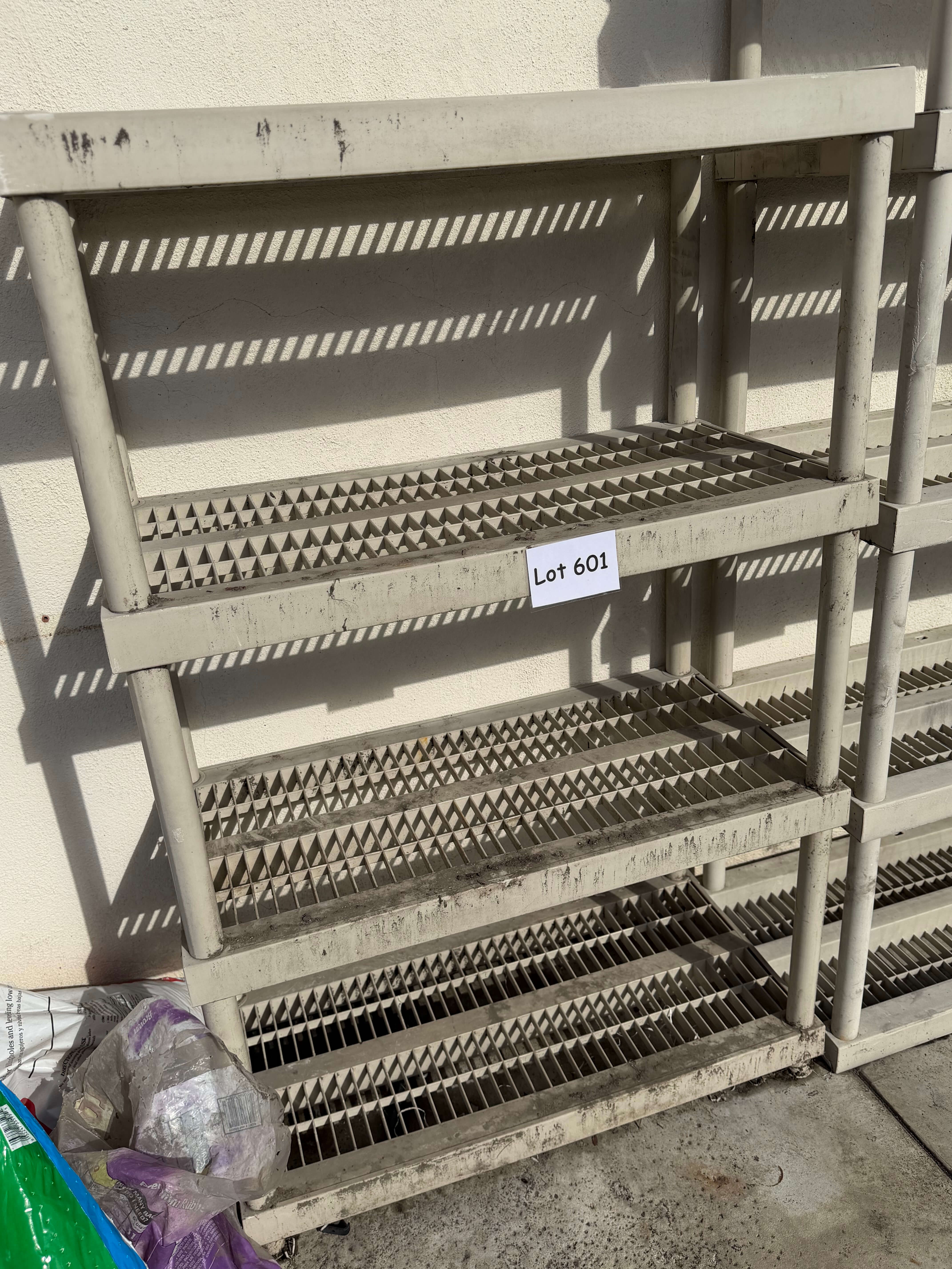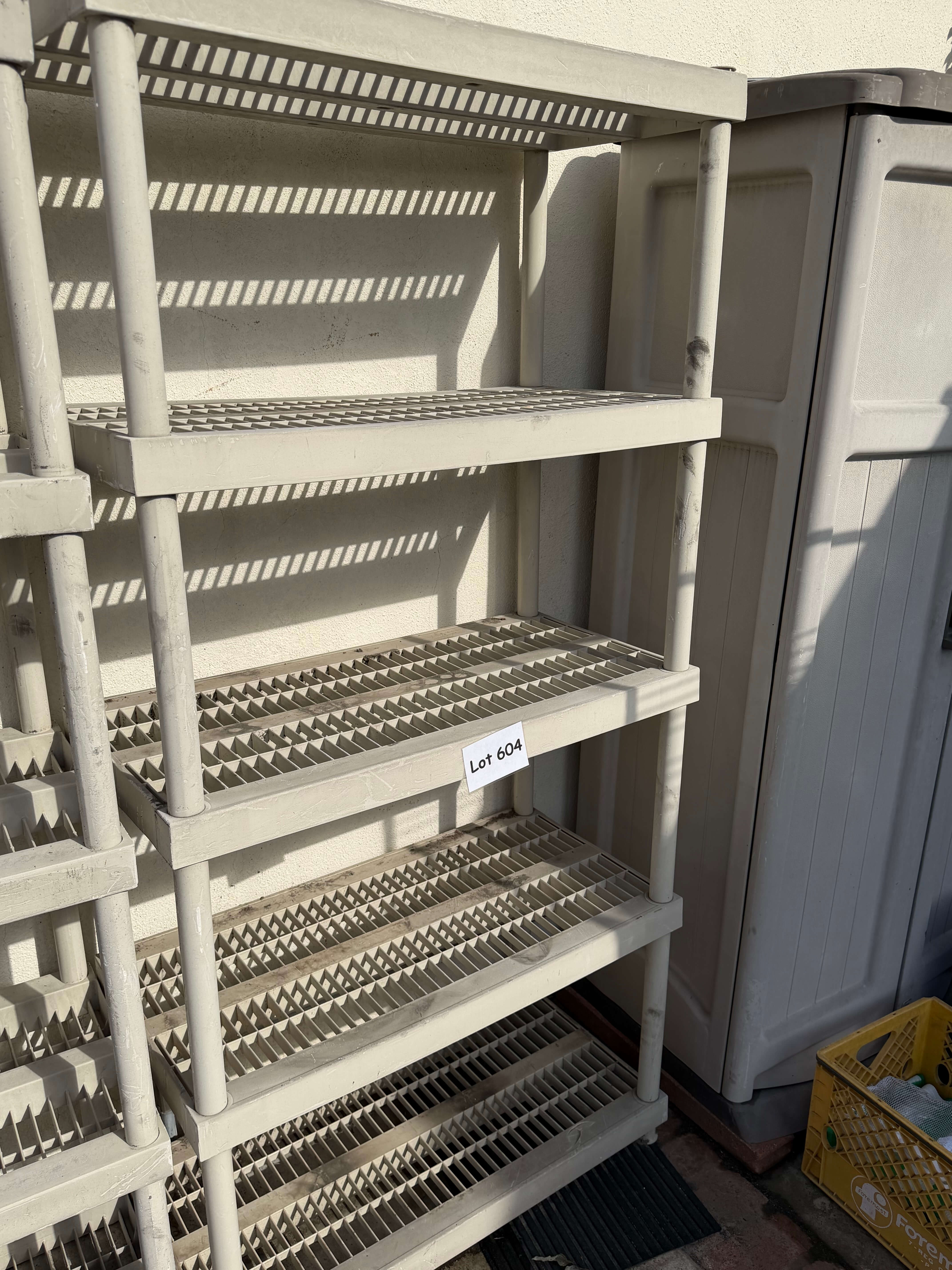 Plastic Portable Shelf Unit, 36"w x 15"d x 60"h. Sun damaged & needs cleaning (but is still functional)