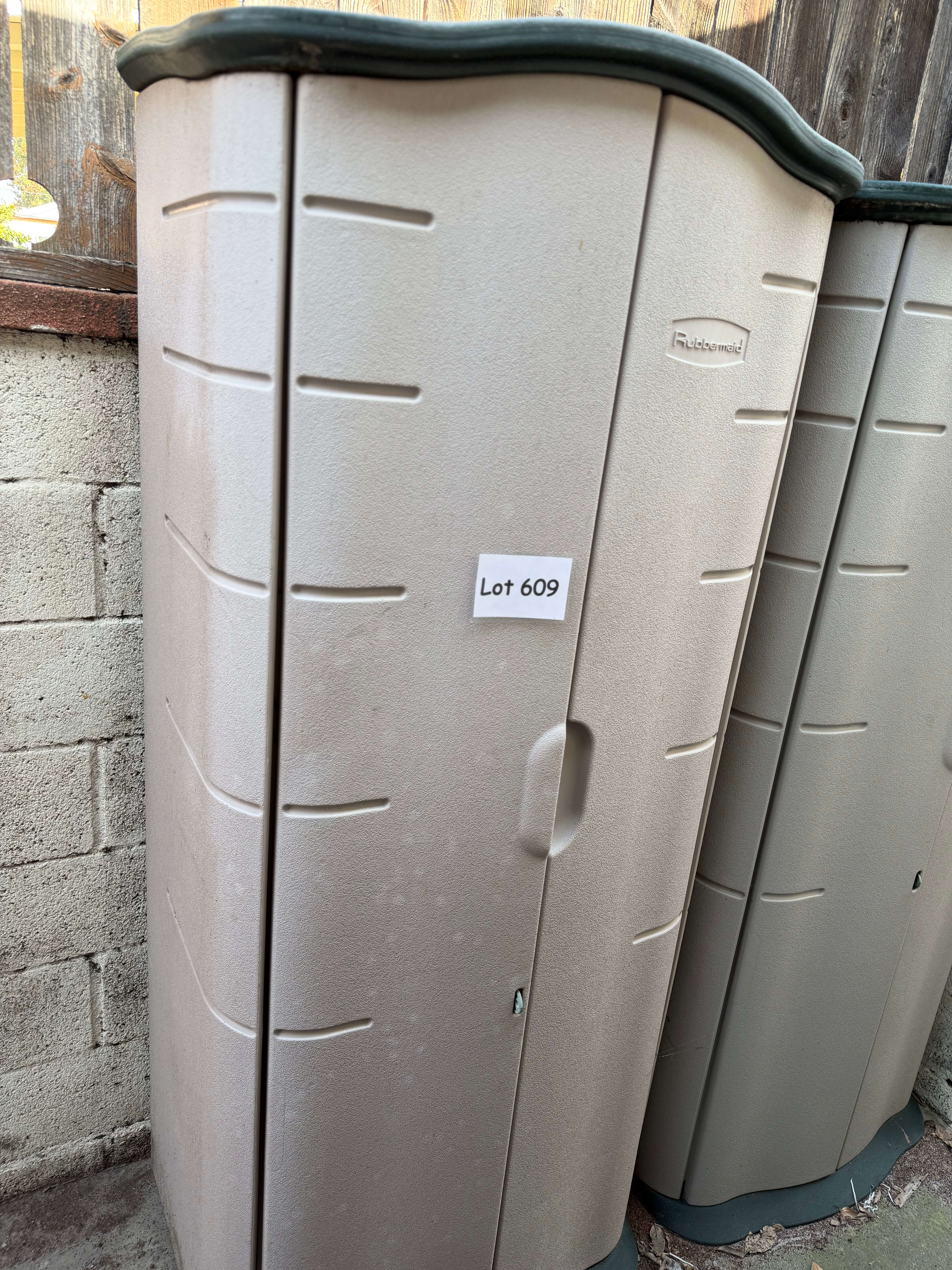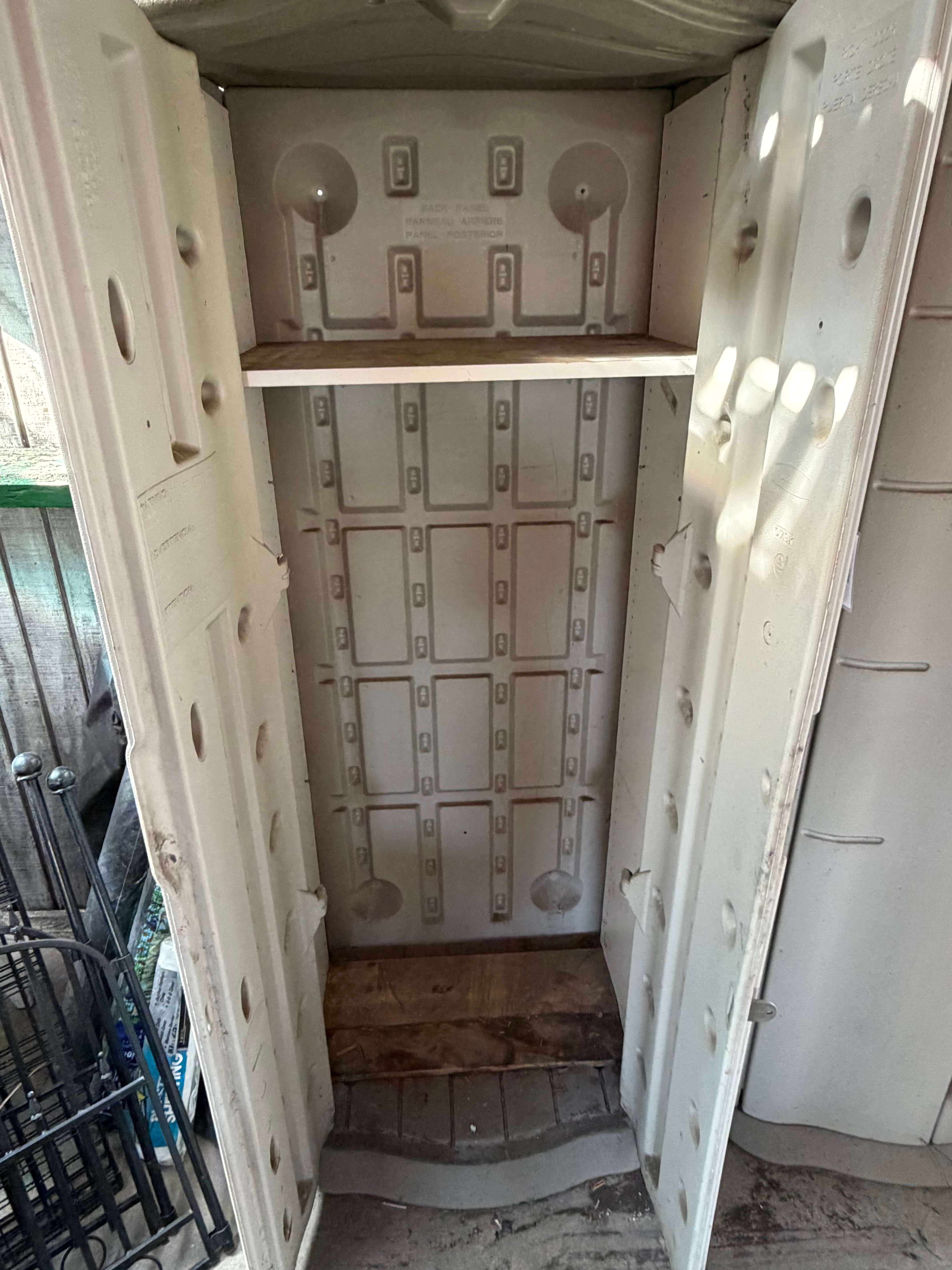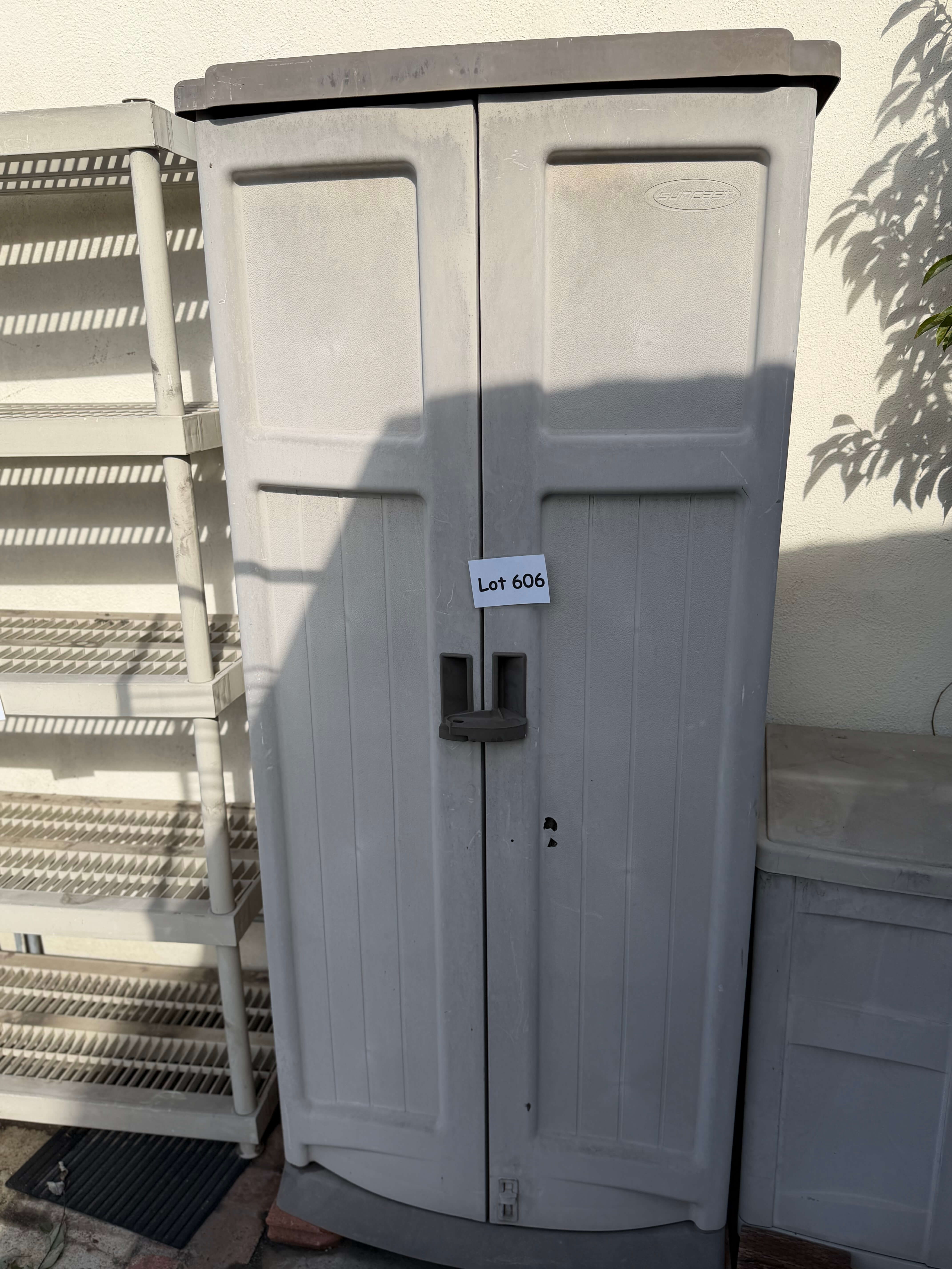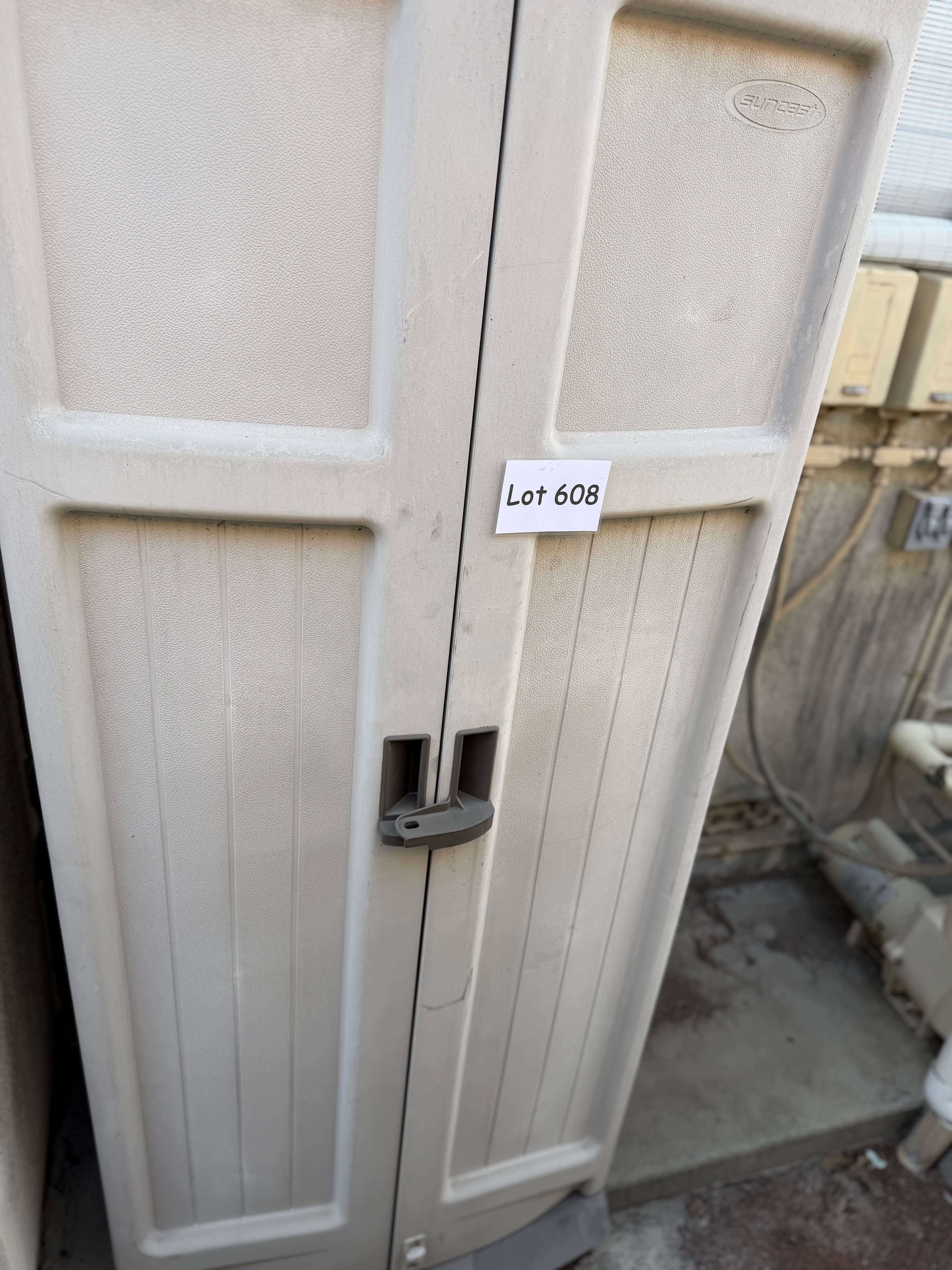 Sunset Plastic Storage Cabinet, 32"w x 25"d x 72"h (needs cleaning). Small hole in one of the doors