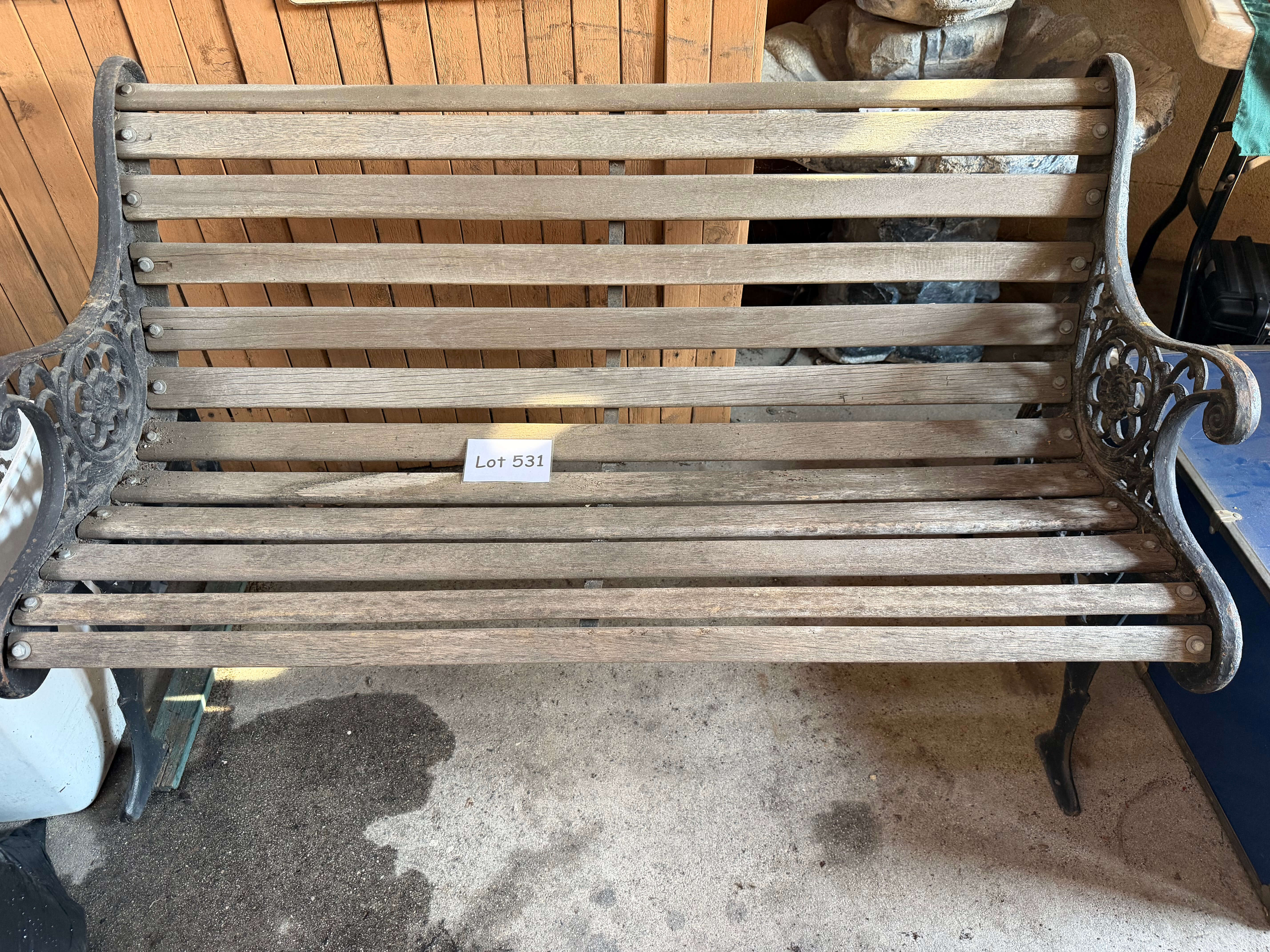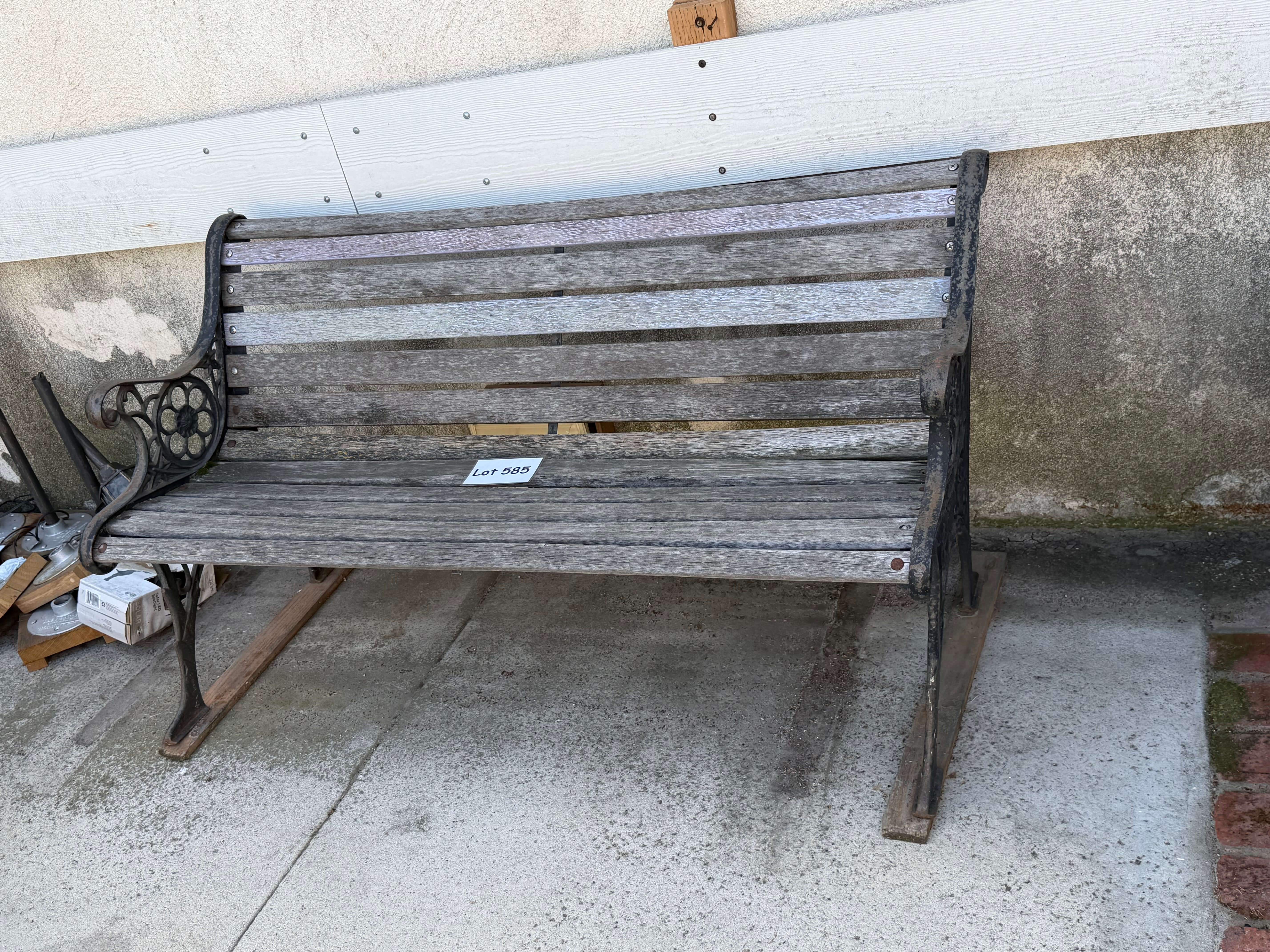 Cast Metal & Wood Park Bench, 49"w x 24"d x 32"h. Wood needs refinishing and bench is a bit wobbly.