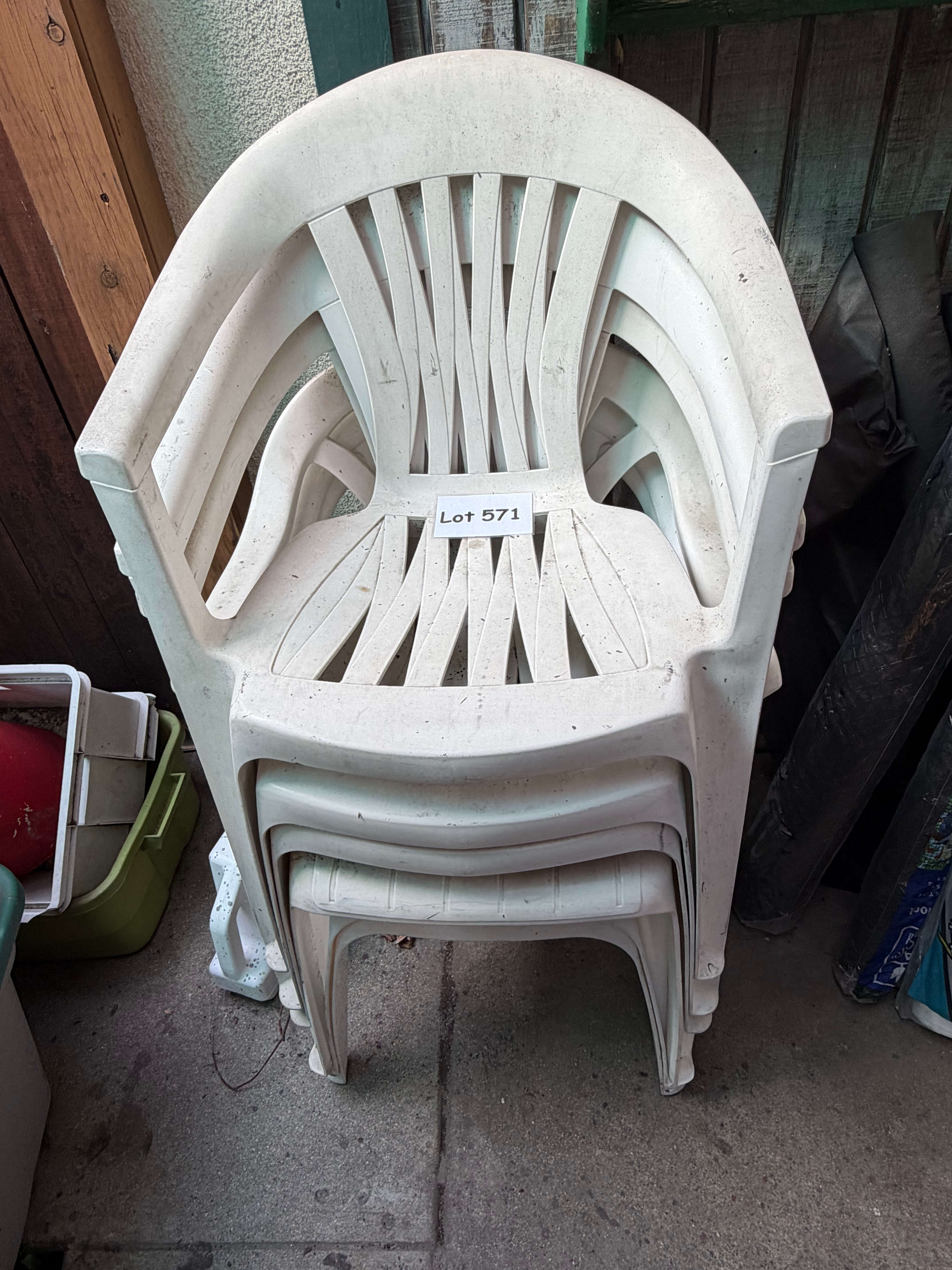 6 White Plastic Patio Chairs, need cleaning (they don't all match)