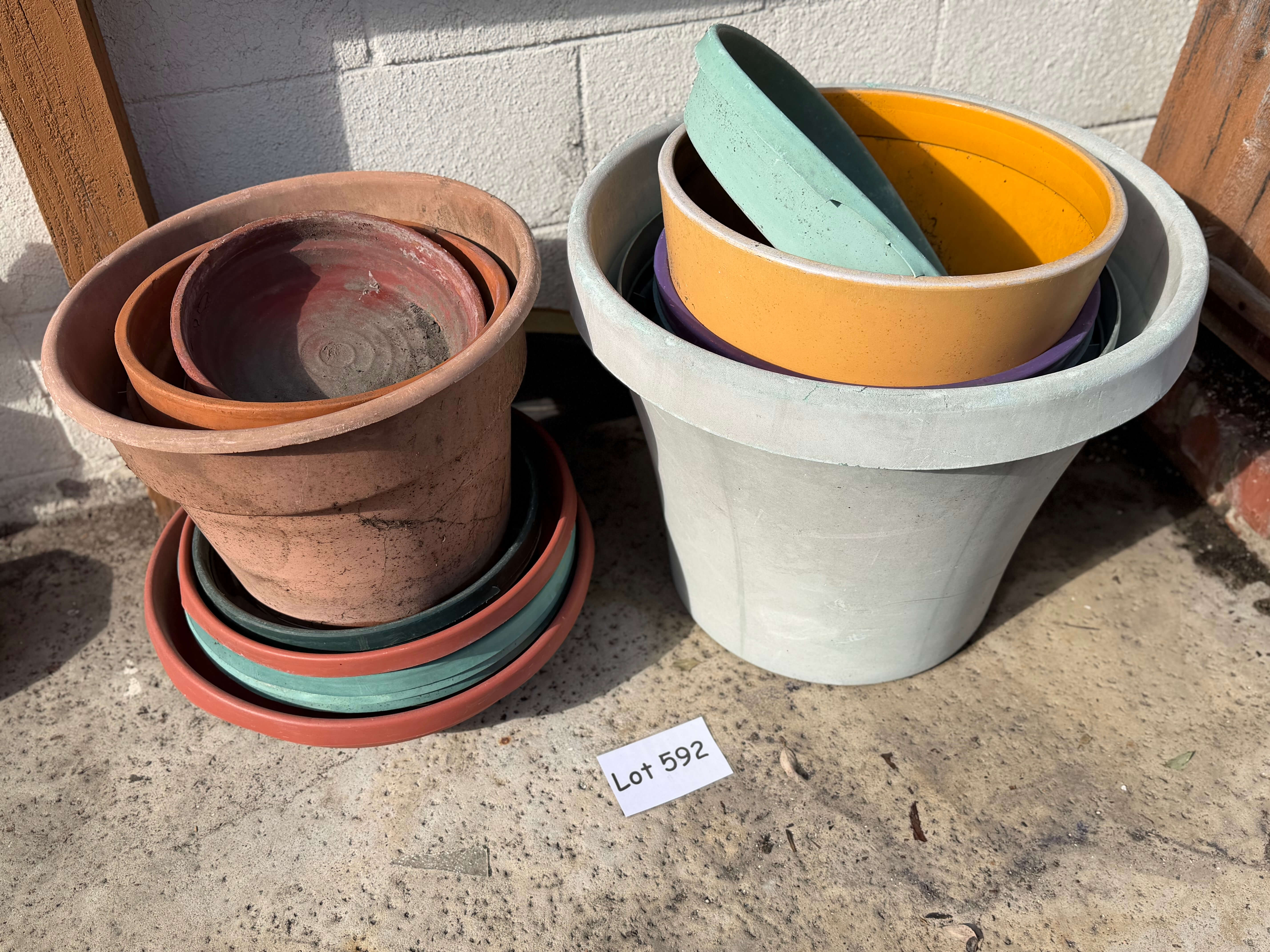 6 Plastic Plant Pots + Variety of plant saucers + 1 Terra Cotta Pot. Largest is 20" diameter x 17"h