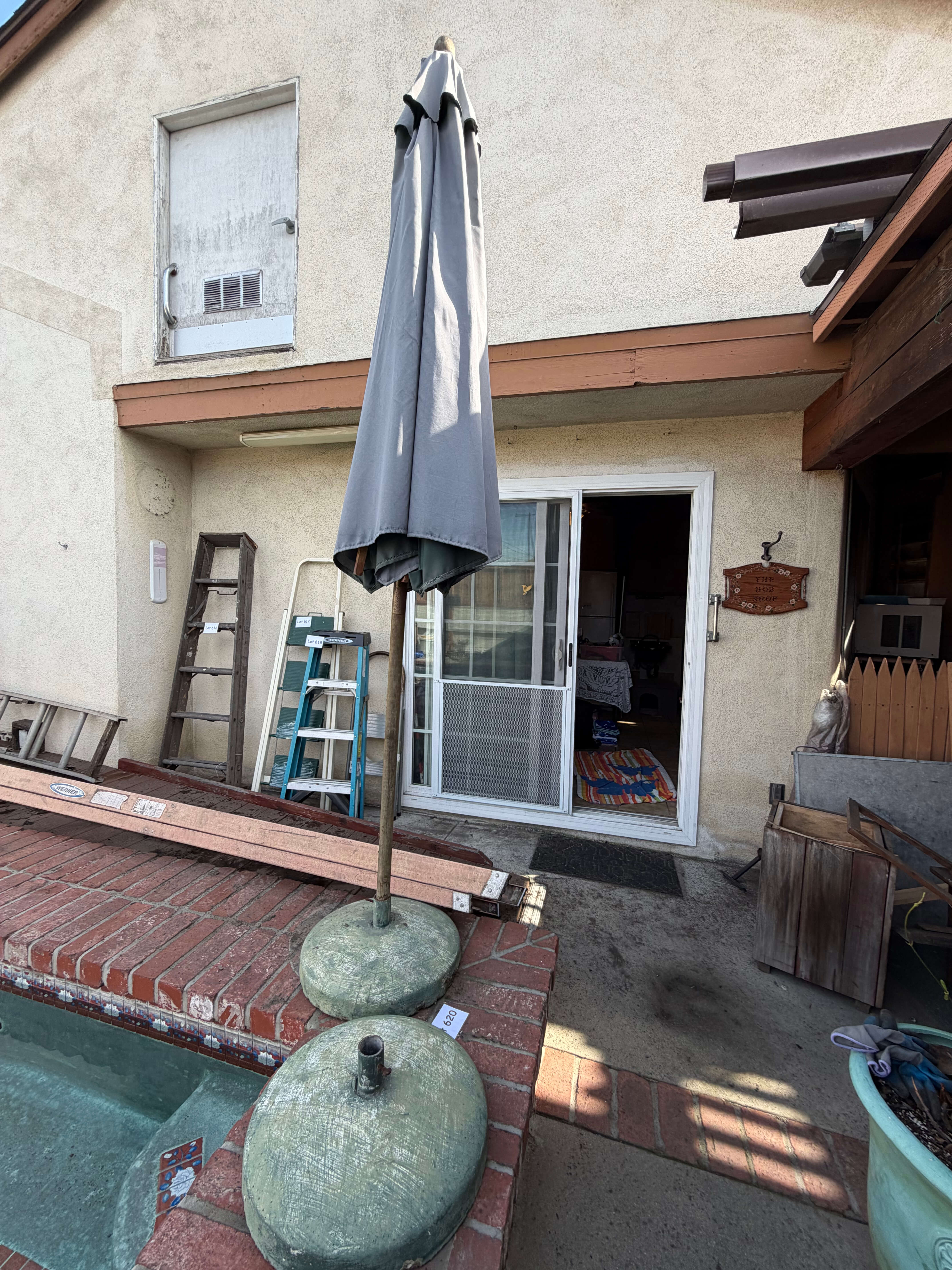 2 Concrete Patio Umbrella Bases (some surface cracking), 17" diameter. (1) 8' umbrella included (please note it has a 6" tear in the fabric)