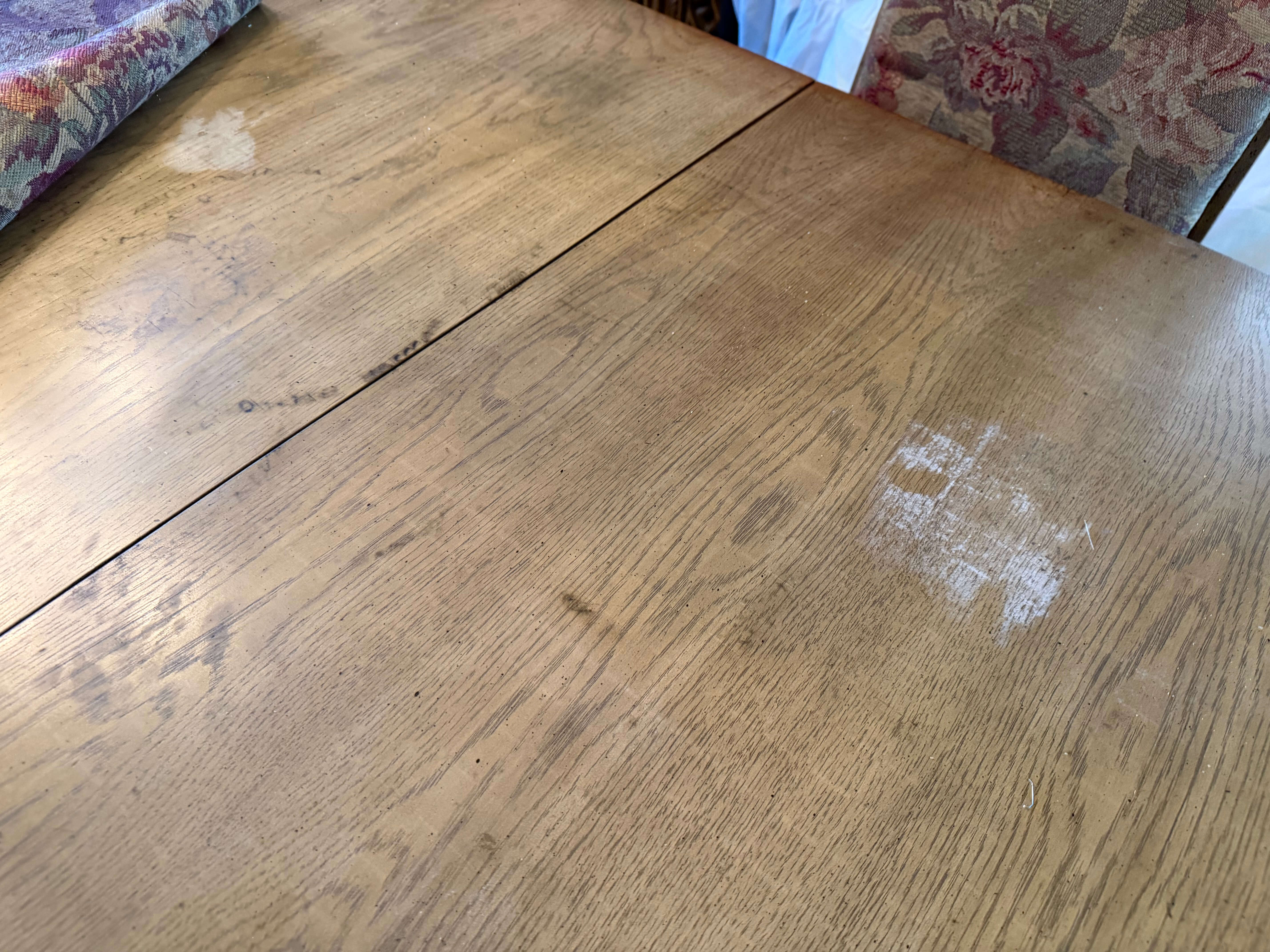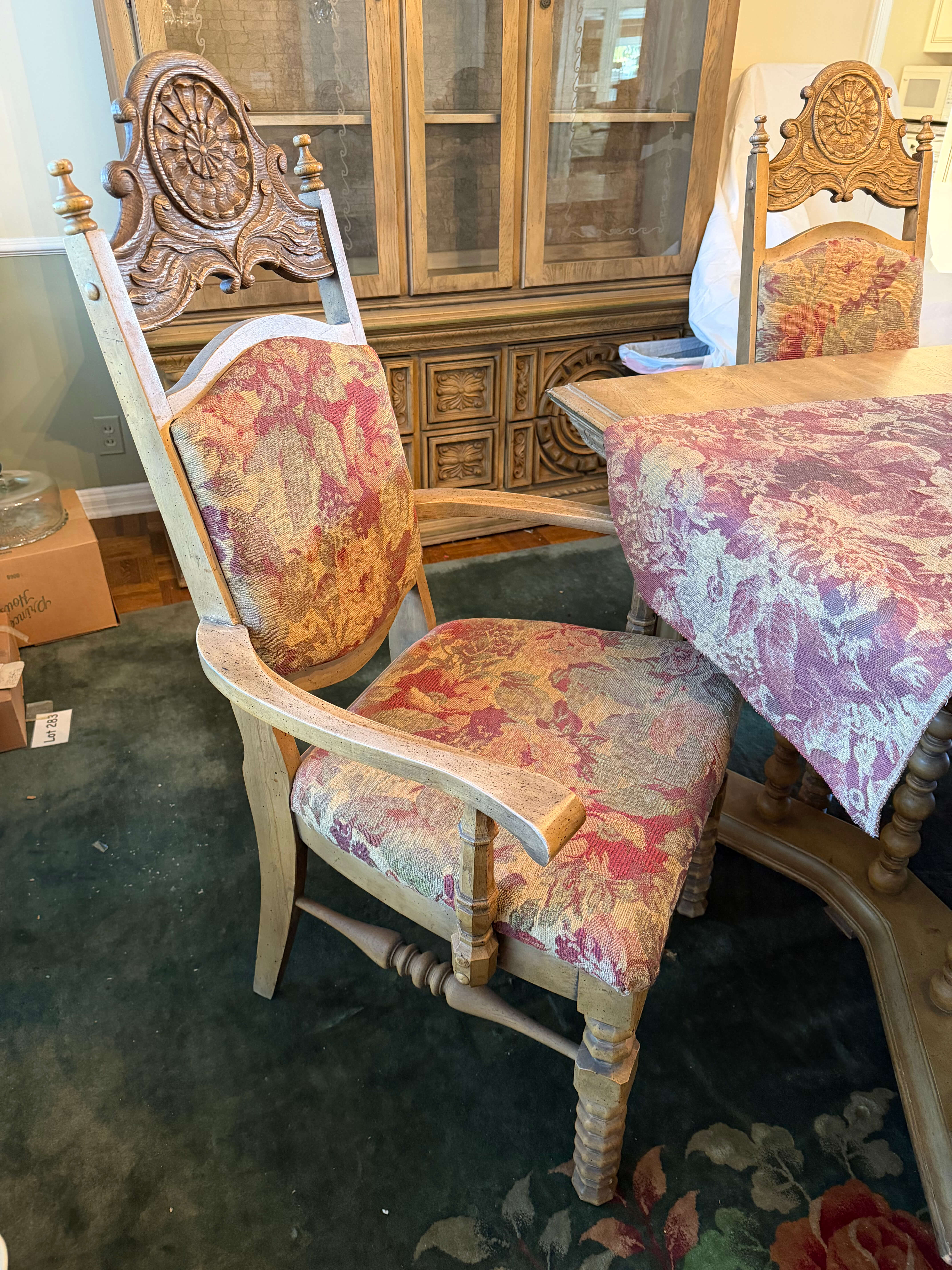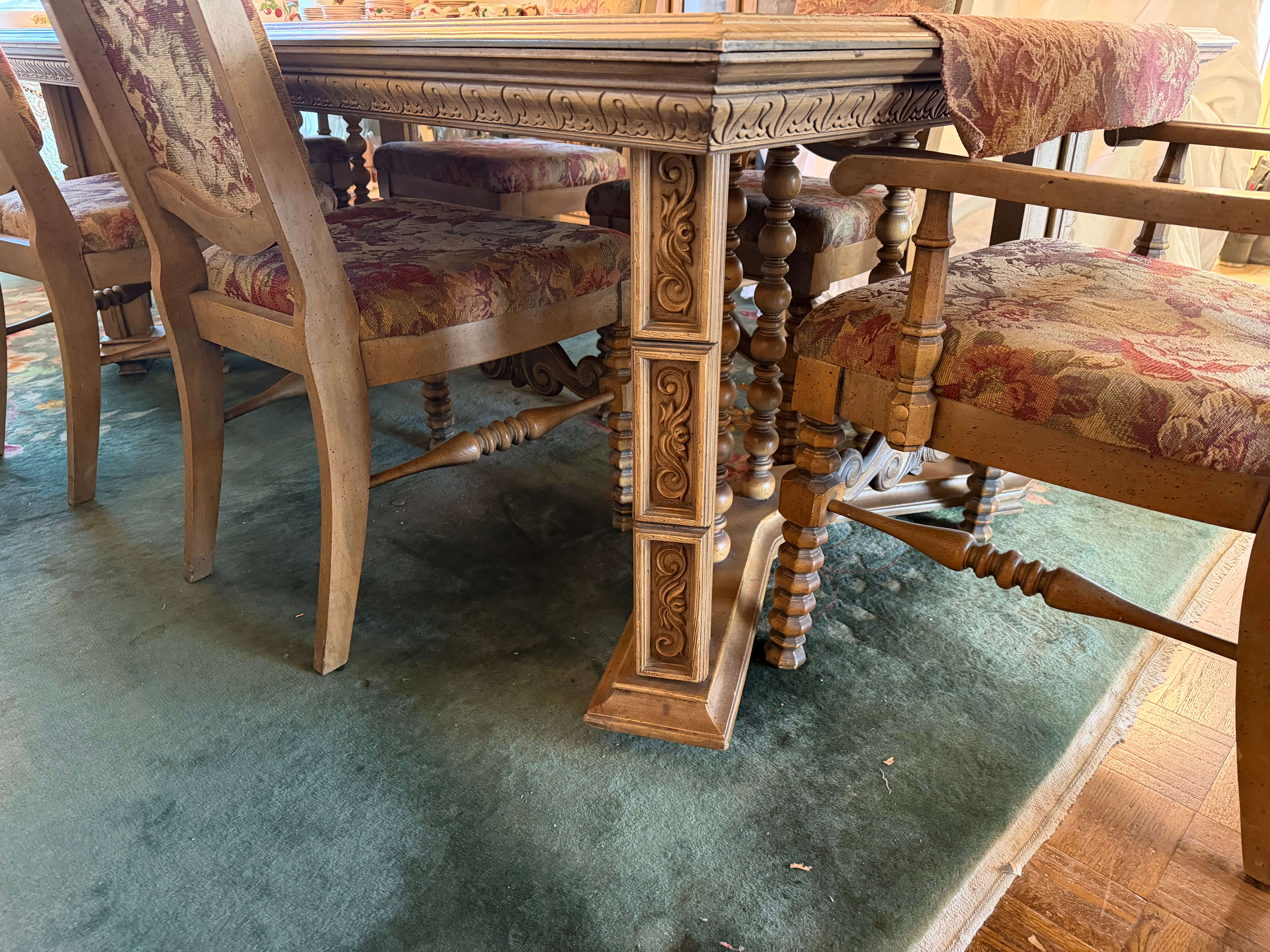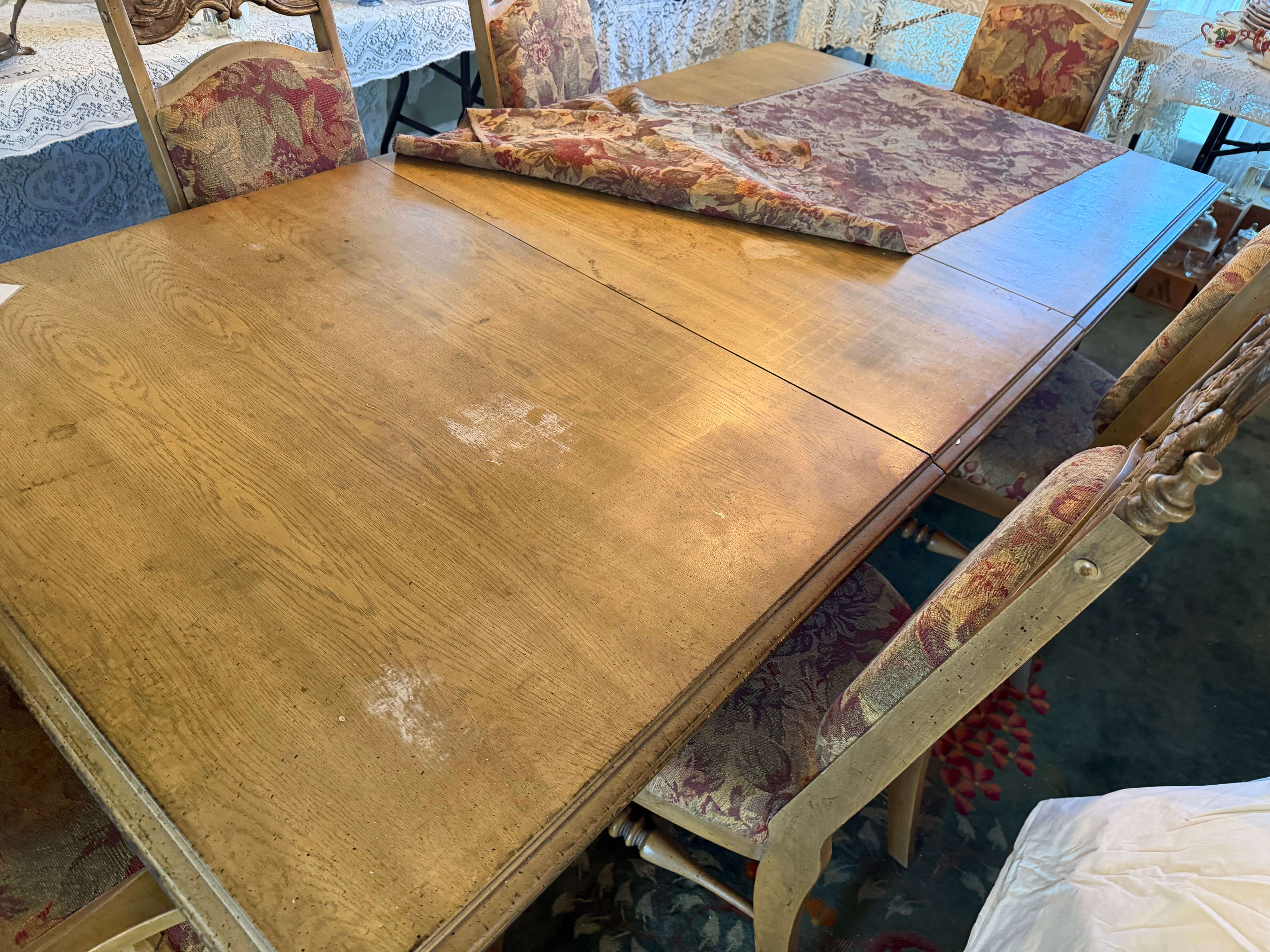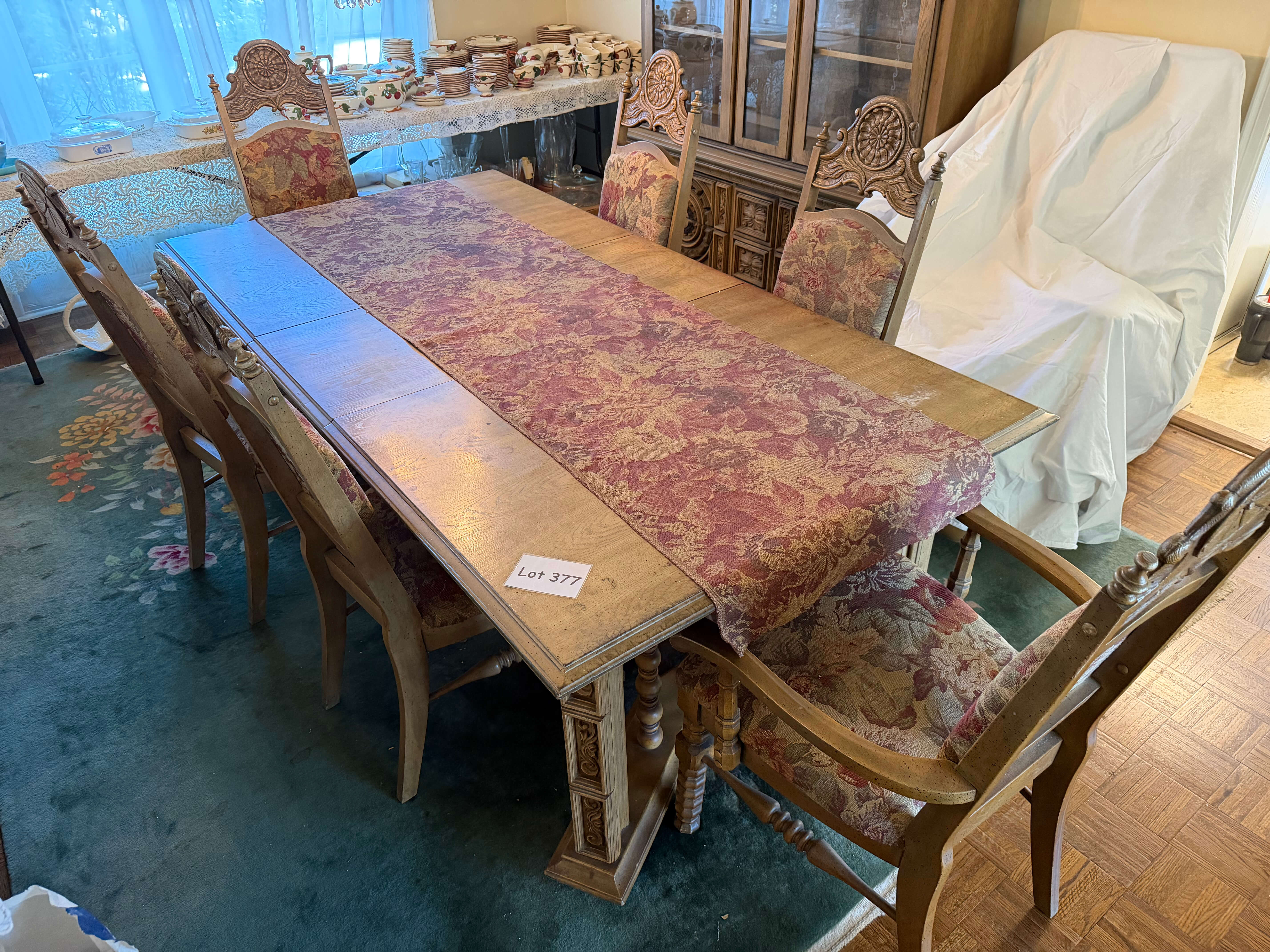 Dining Set -- Table: 84"w (including an 18"w leaf) x 44"d x 29"h. Plus (4) Chairs & (2) Armchairs -- 26"w x 20"d x 19"h (seat) 45.4"h (back)