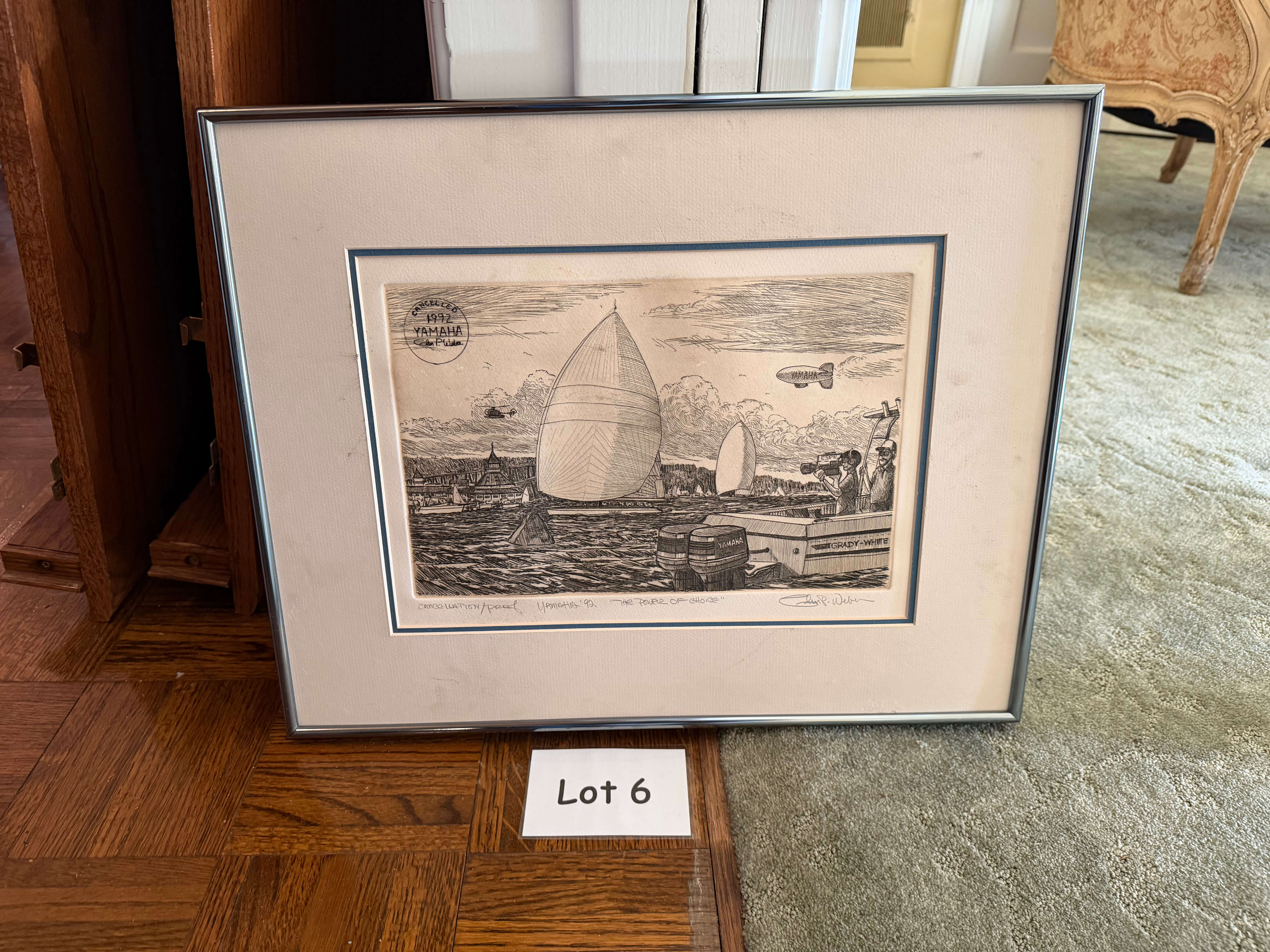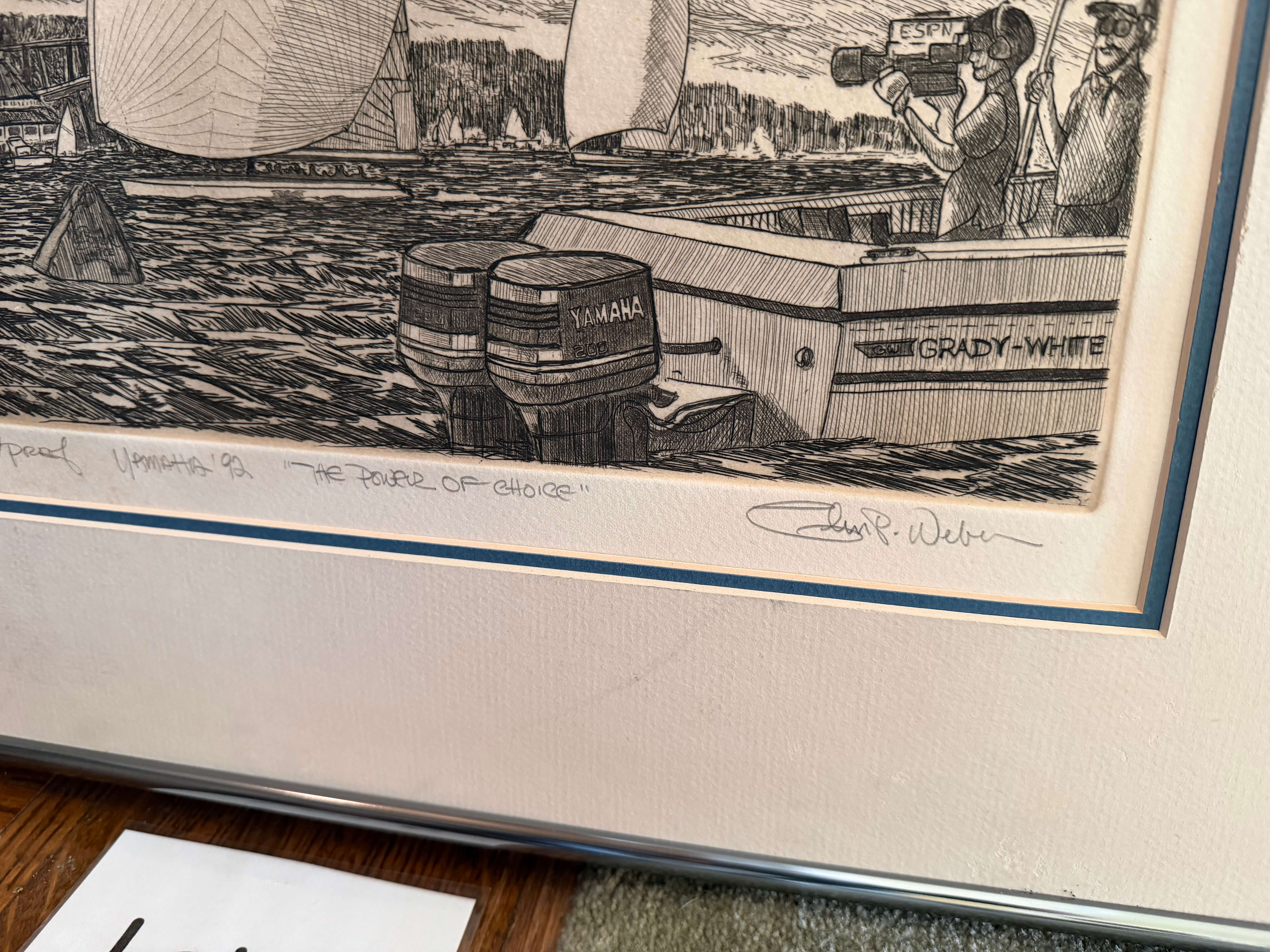 Framed (no glass) & Matted Cancelled Proof, Original Drawing, Signed Glen Weber, 20"w x 17"h. Yamaha 1992