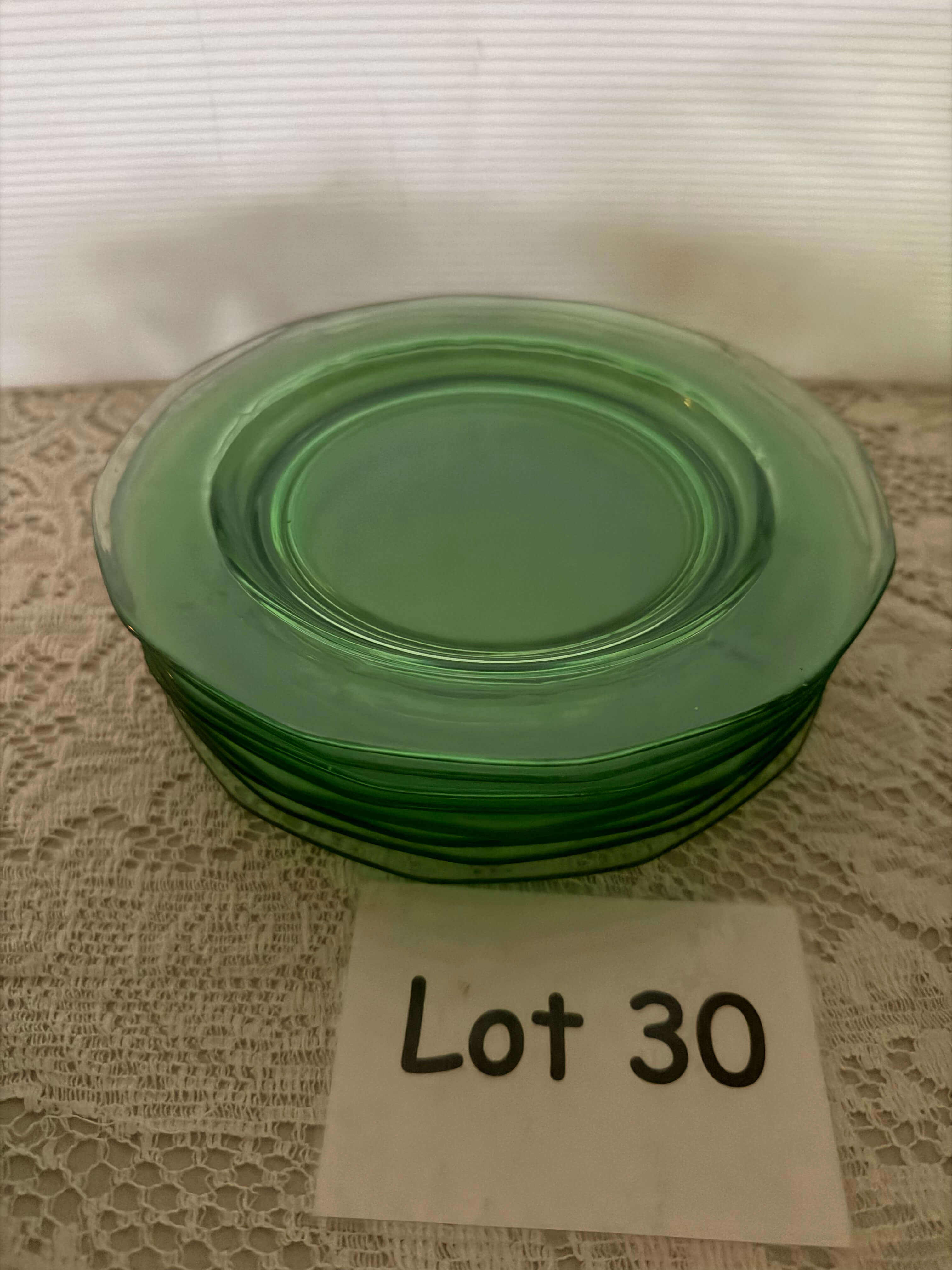 Set of 8 Green Depression Glass Plates, 7.5" diam