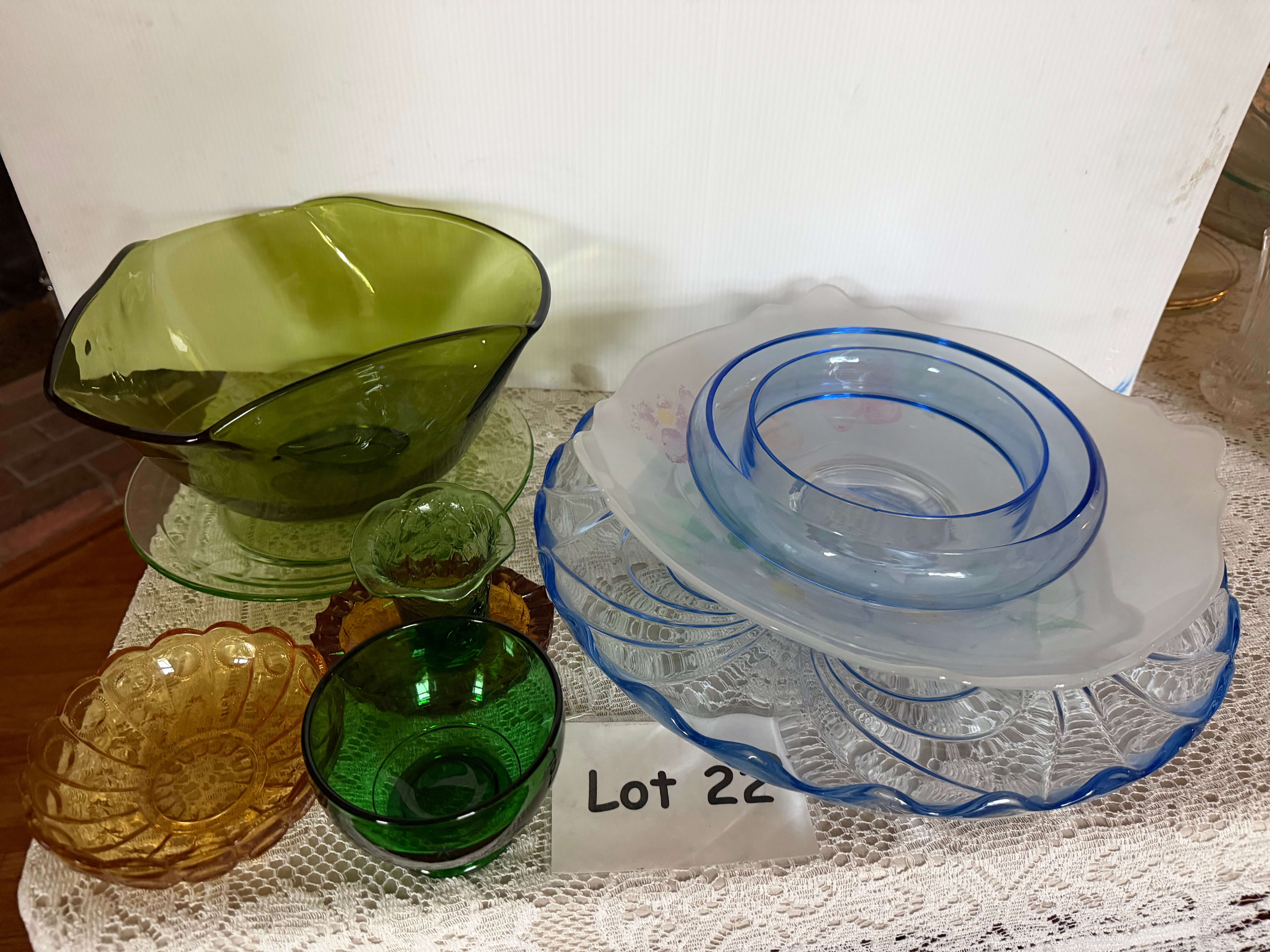 Variety of 9 Colored Glass Serving Pieces, largest is 14"diam