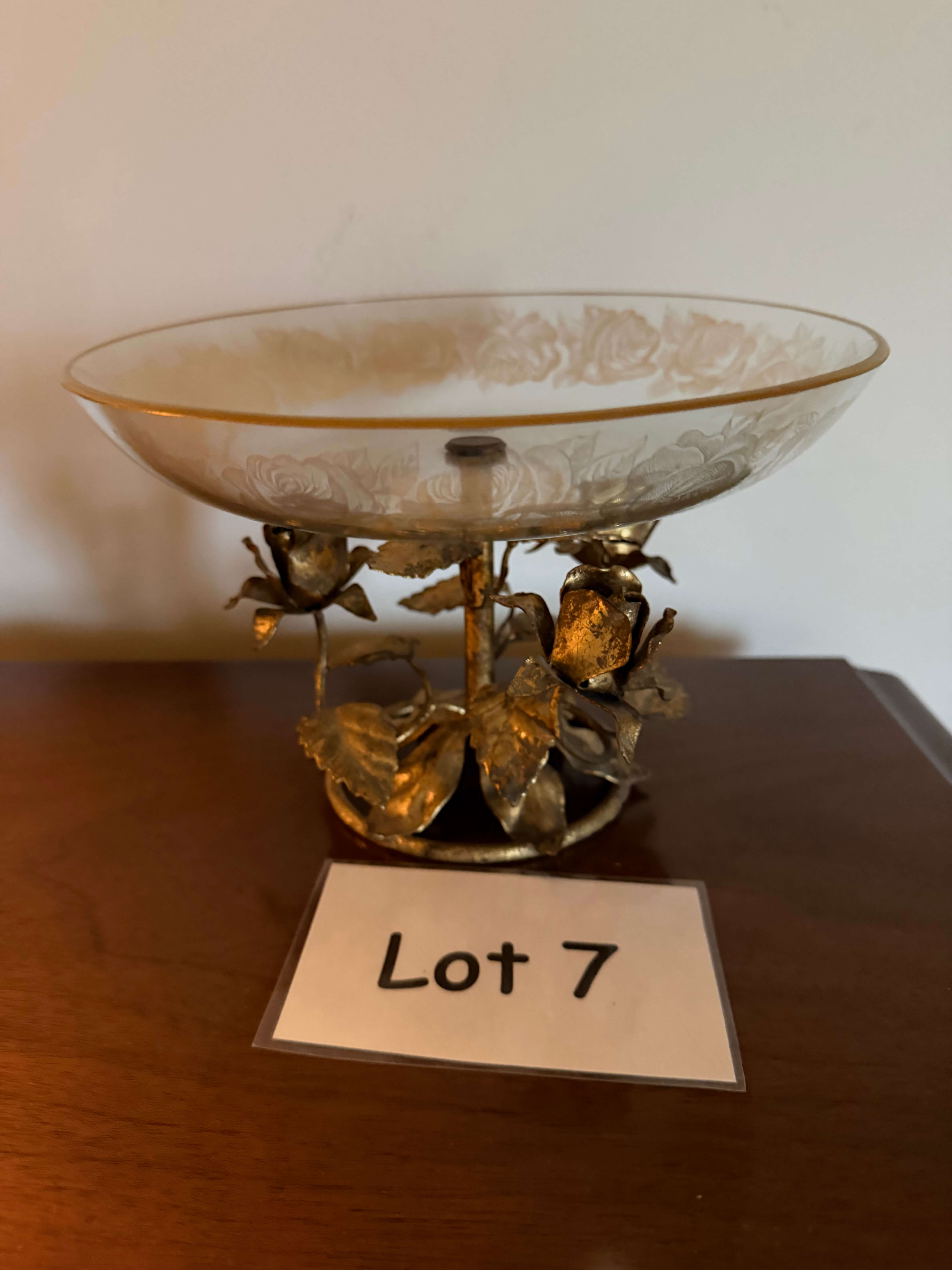 Brass Rose Base Glass Top Candy Dish. 9" diameter x 6"h