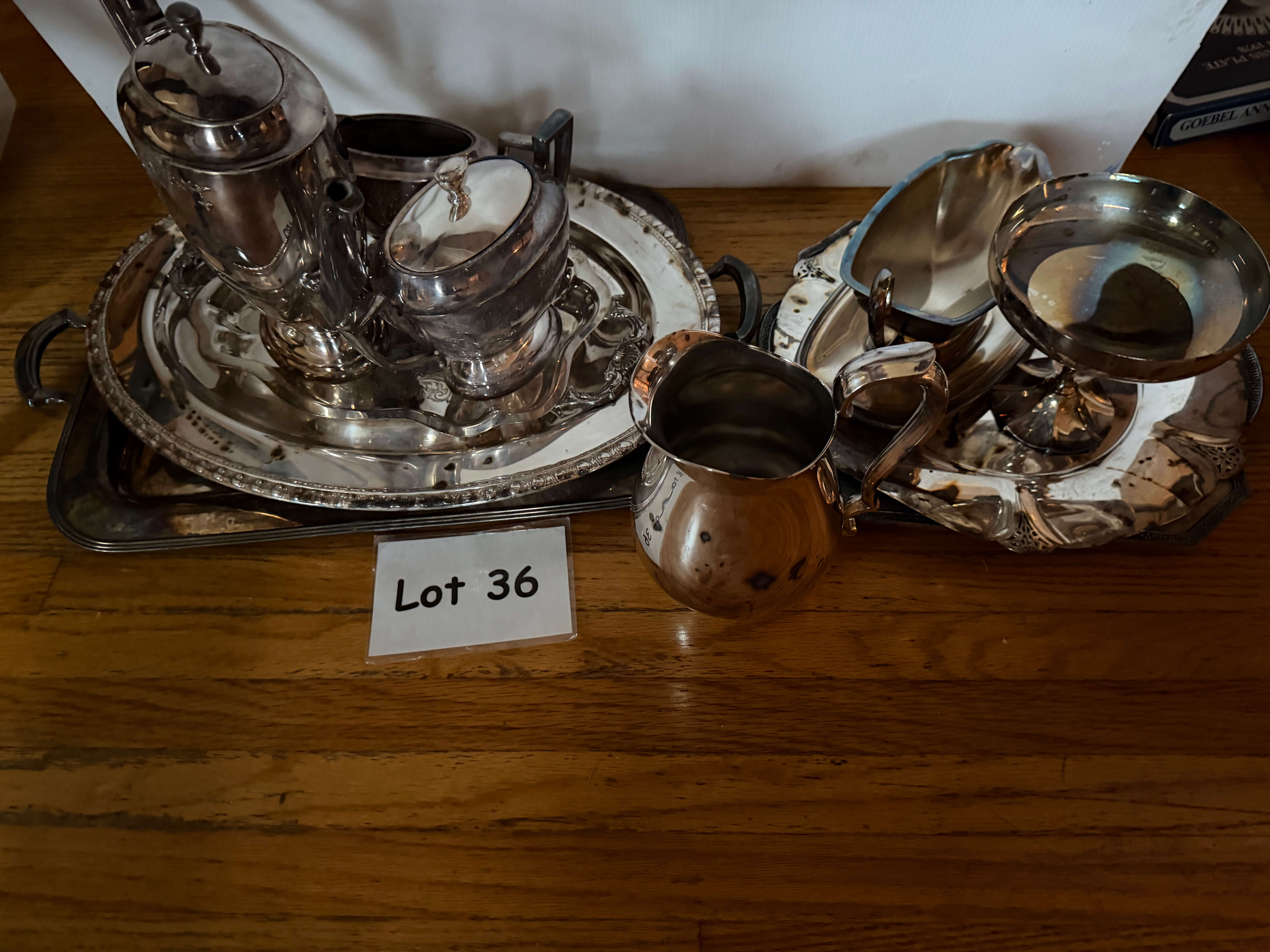 10 Pc.Variety of Metal Serveware, mostly silver-plate. Largest tray is 12" x 15"