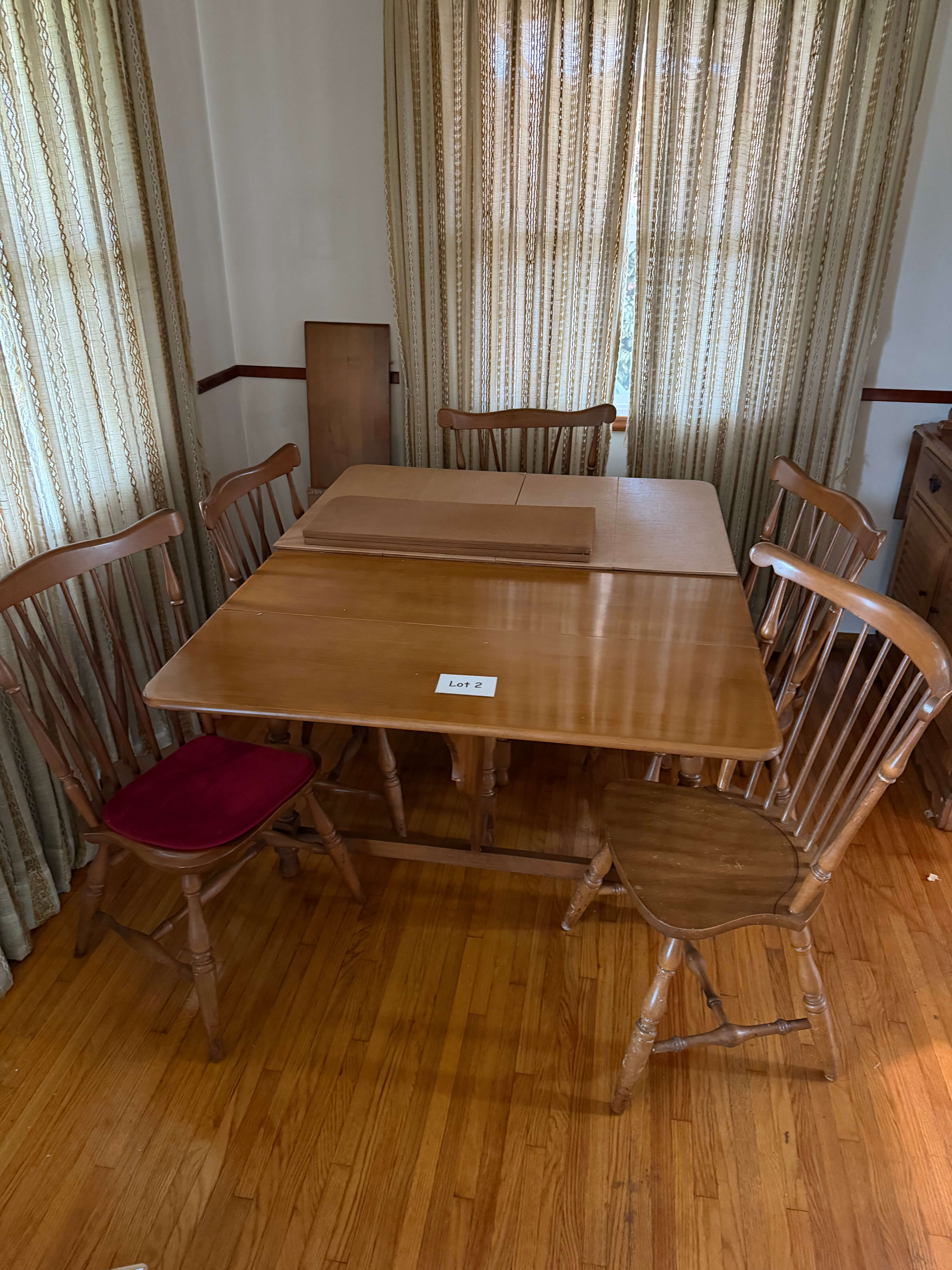 Maple Dining Set. Drop-Leaf Gate-Leg Table is 57"l (w/ leaves extended) x 45"w x 30"h. Includes (1) 12" leaf, cover pad & 5 chairs, all in good condition.