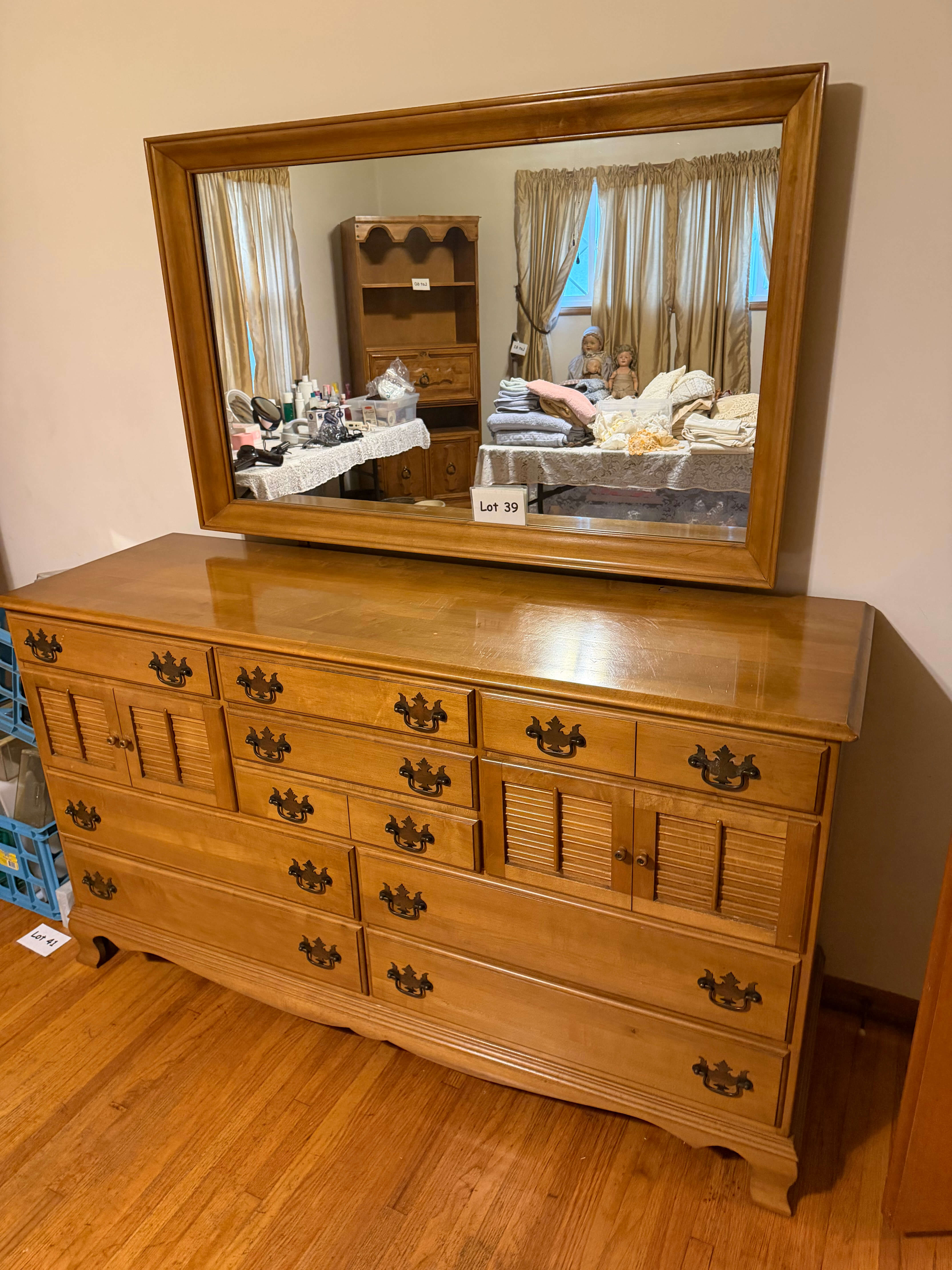 Maple Dresser w/ Mirror. 56"w x 19"d x 35"h (dresser) & 48"w x 30"h (mirror). Some minor surface scuffs on dresser