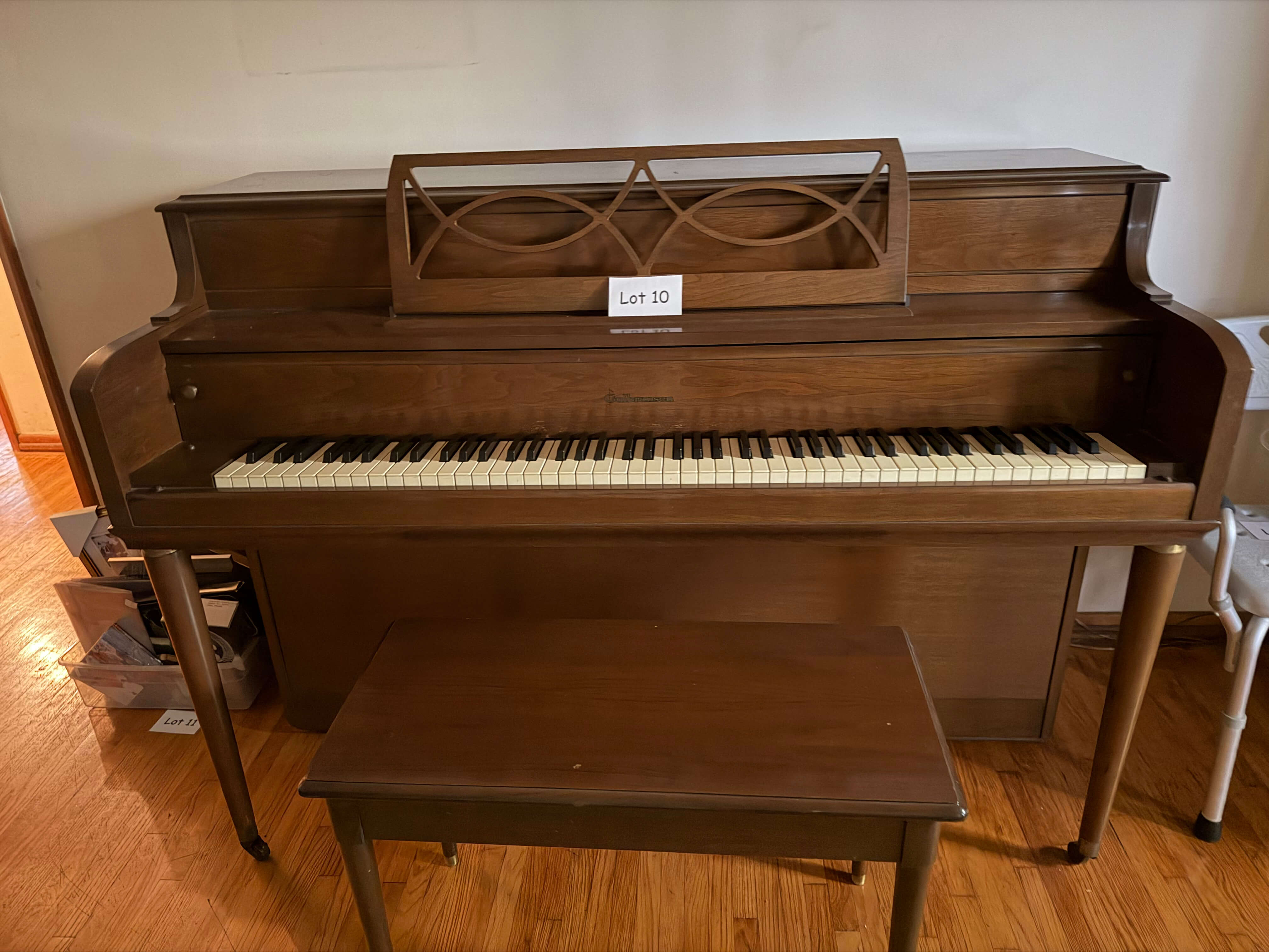 Gulbransen Console Piano w/Bench, 57.5"w x 24.5"d x 41.5"h. Good playable condition, needs tuning