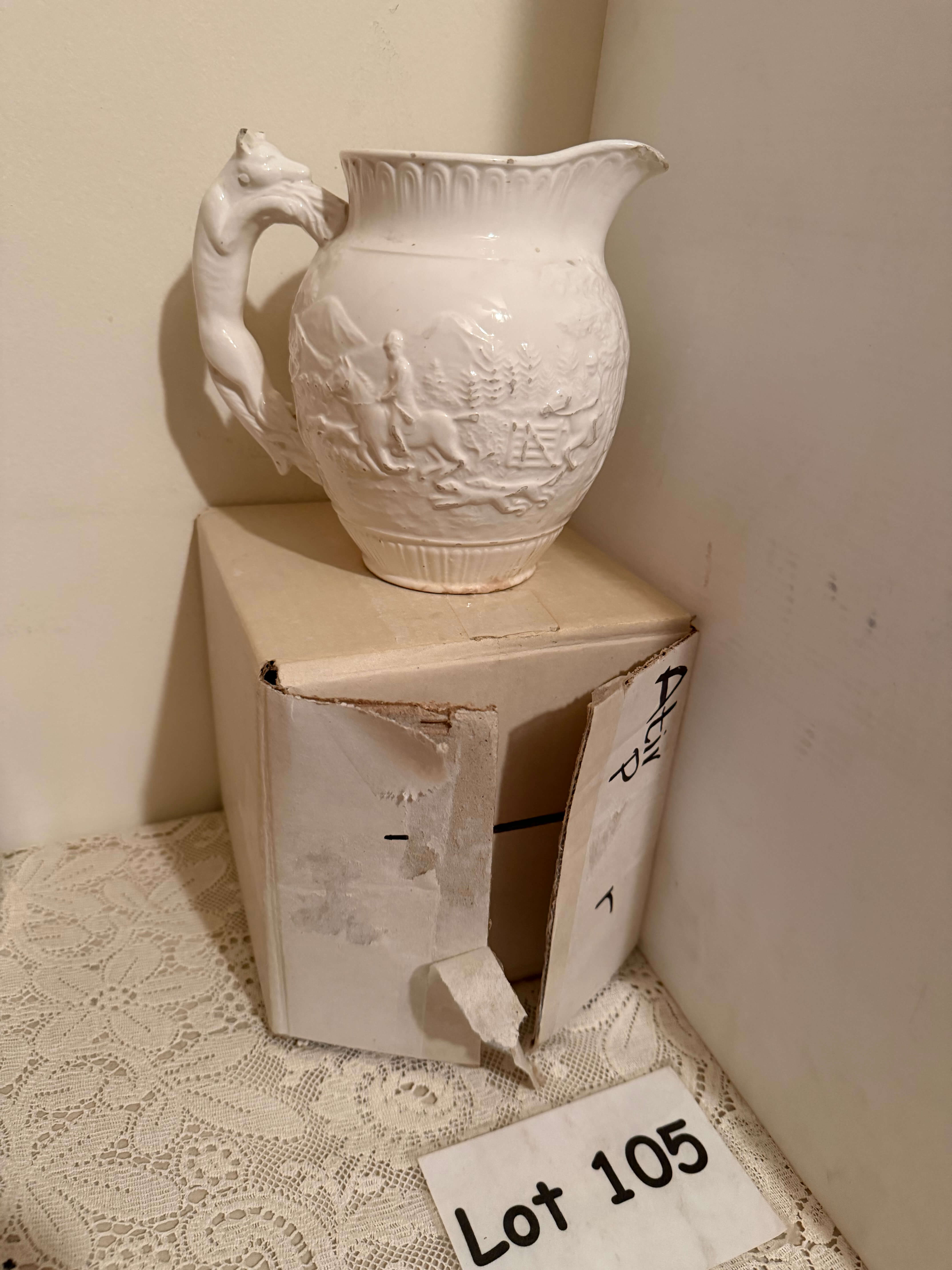 Decorative White Ceramic Pitcher, 7"h