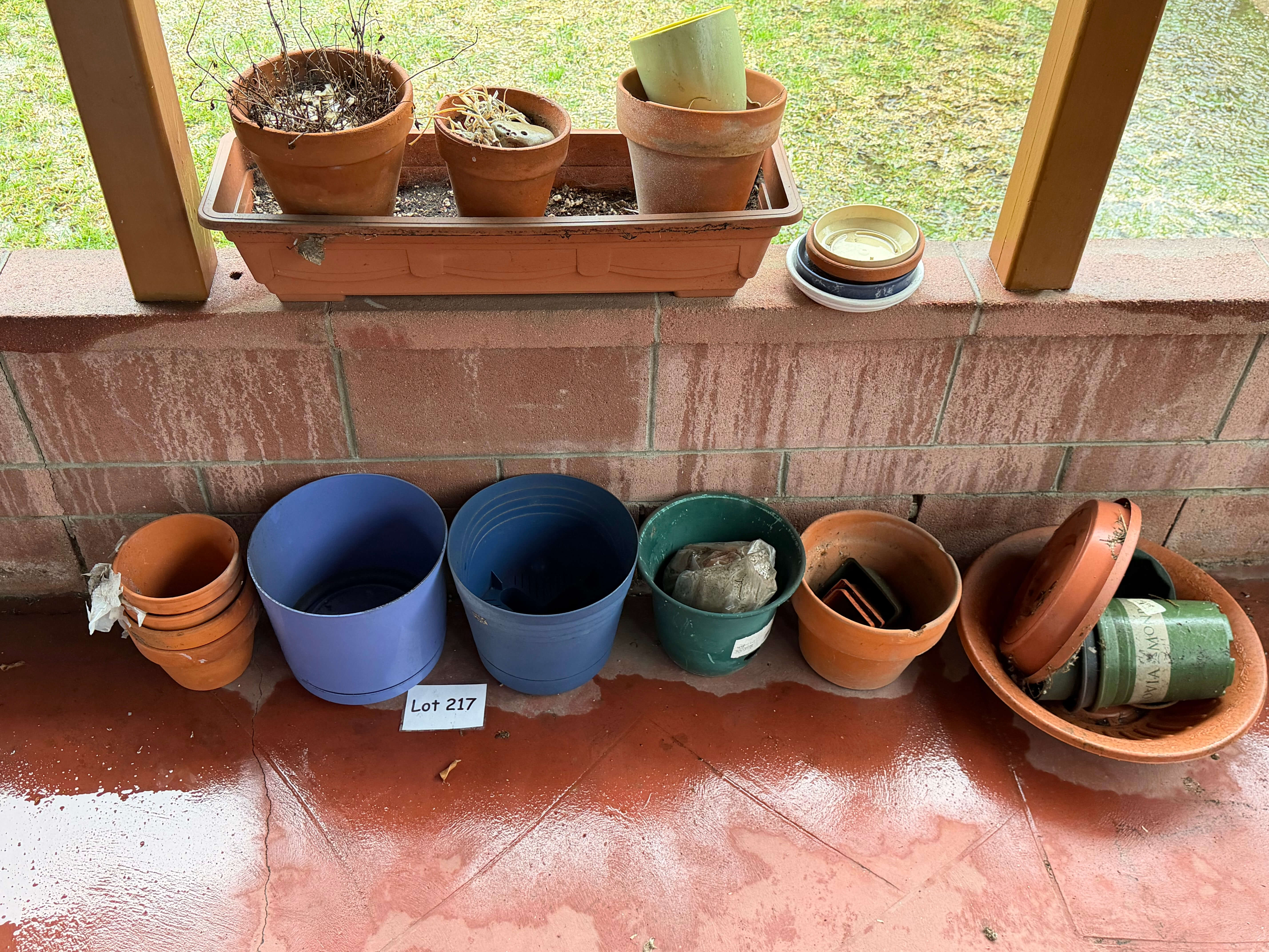 Variety of Plant Pots, Plastic & Terra Cotta. Tallest (blue plastic) is 10" diameter x 9"h