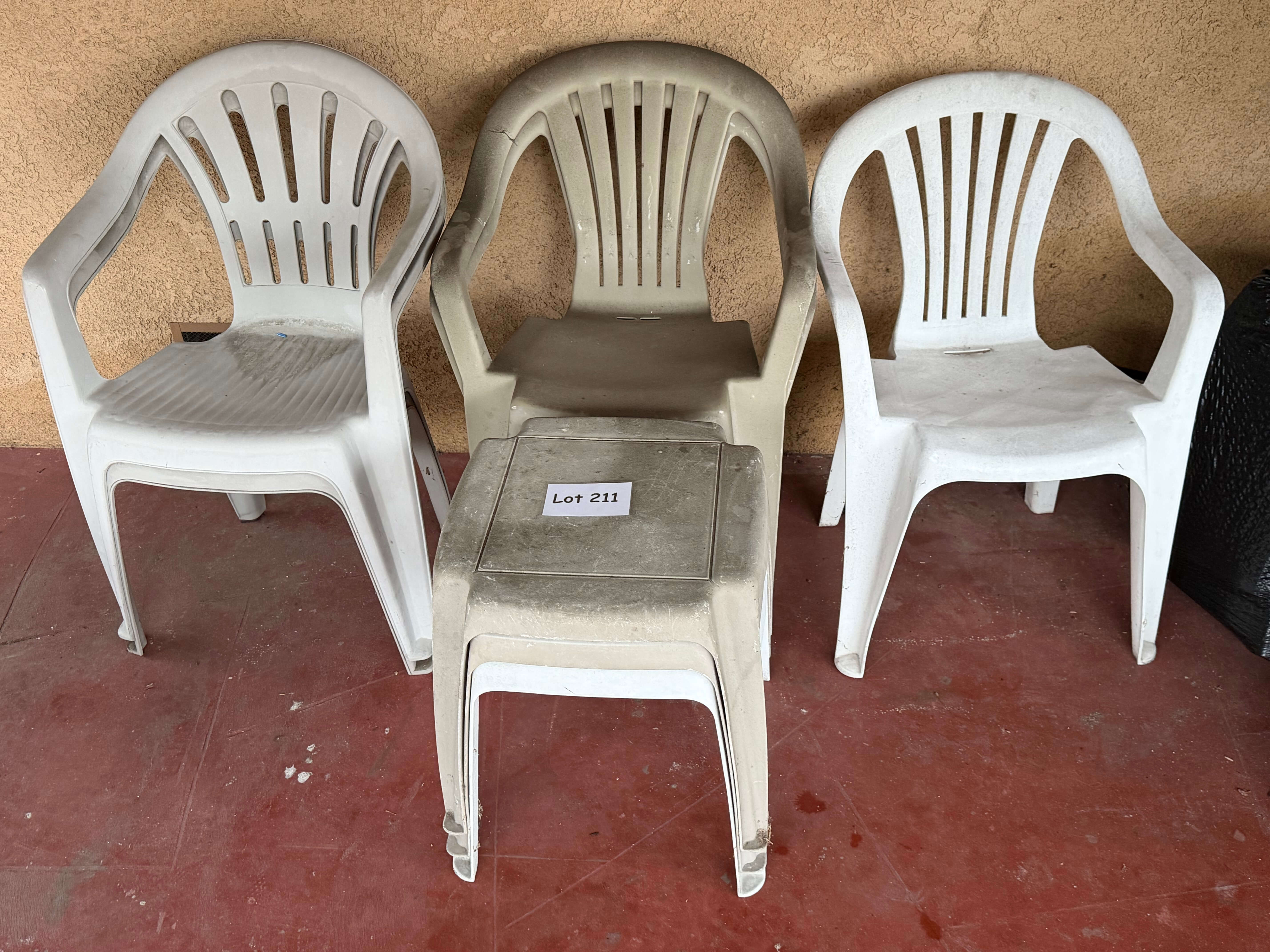 5 Standard Size Plastic Patio Chairs & 3 Side Tables (16"sq x 17"h). Fair to somewhat decent condition