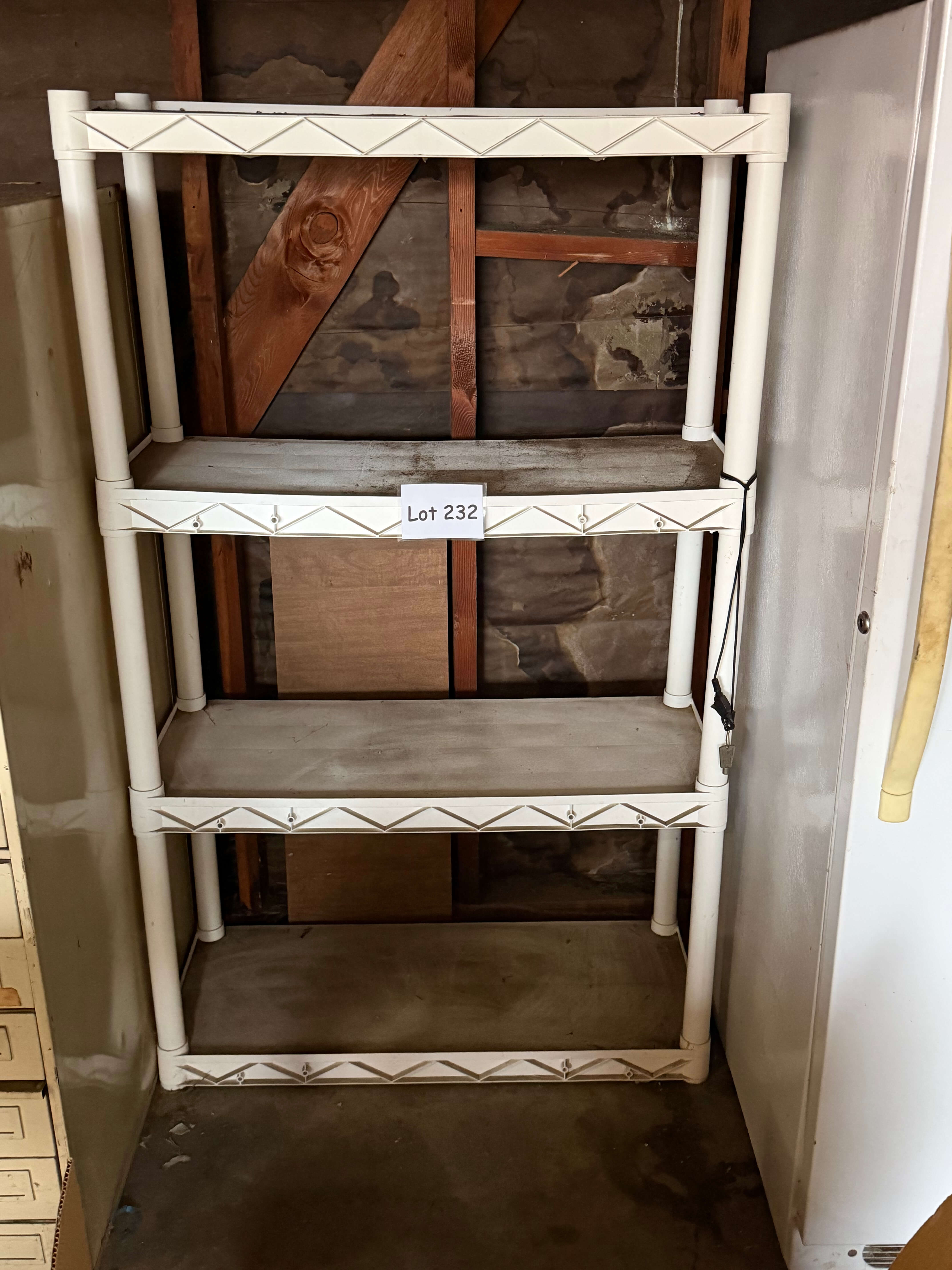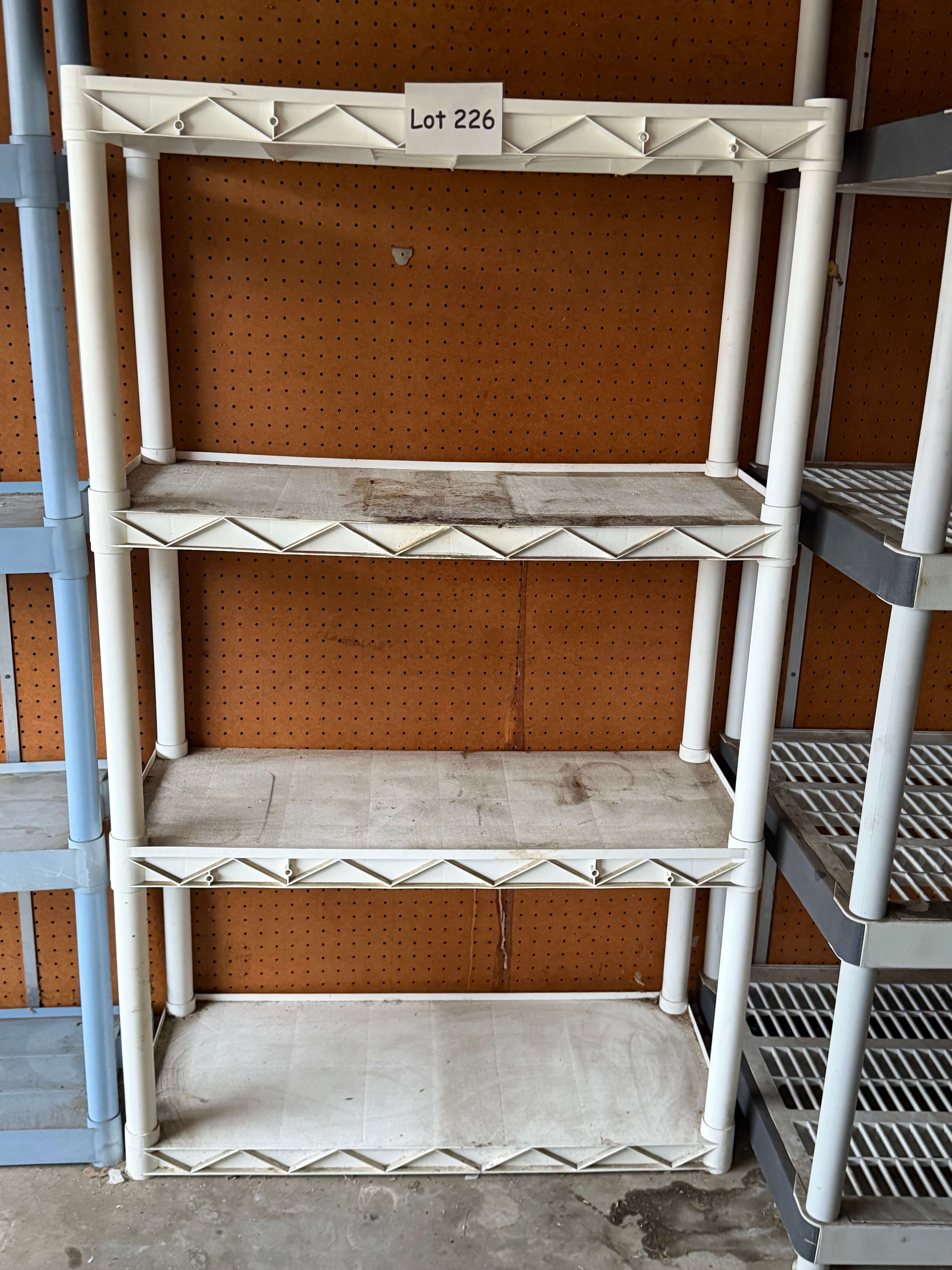 Plastic Storage Shelf (comes apart) for storage), 33"w x 14"d x 56"h. Needs cleaning