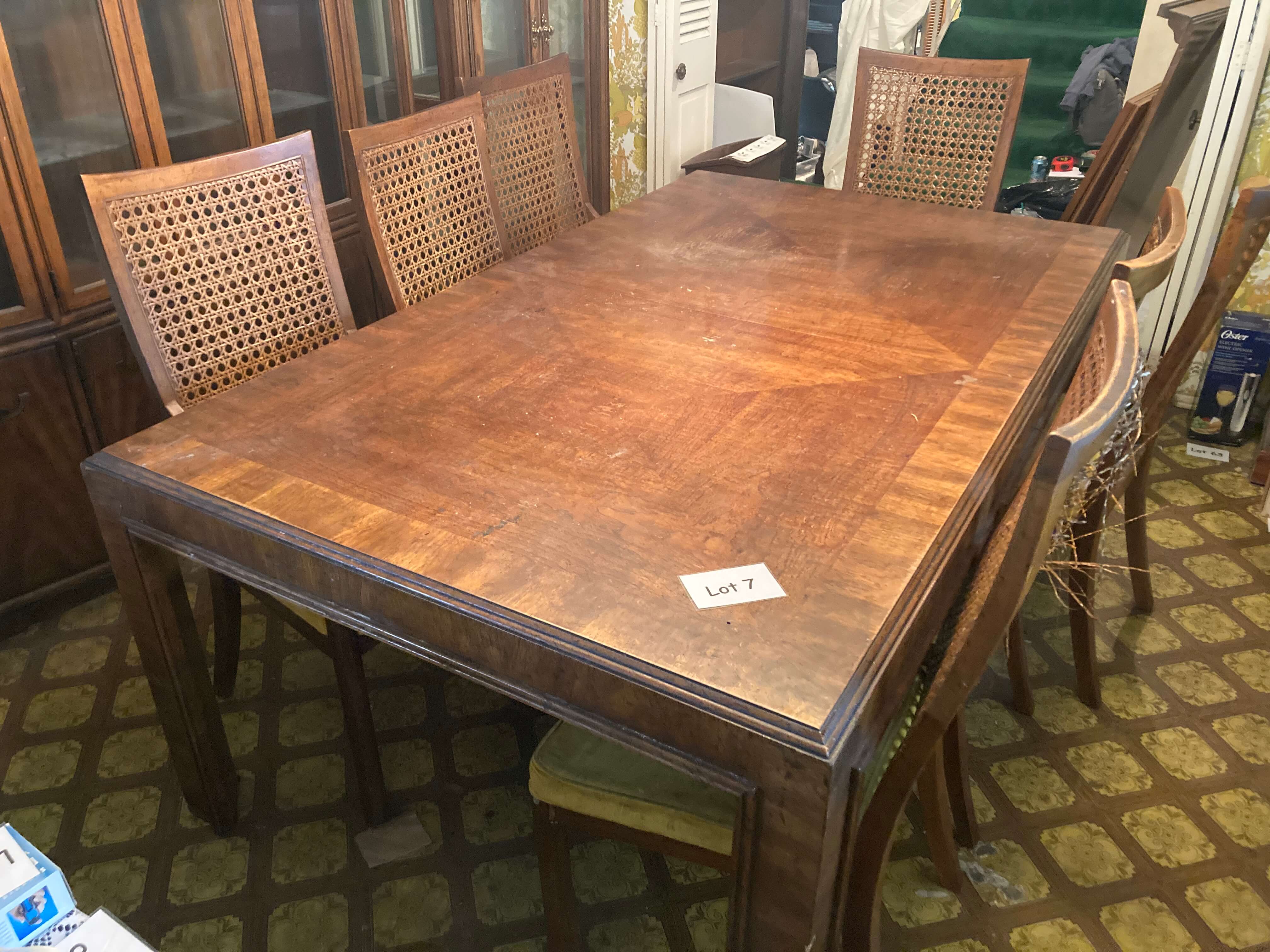 Dining Set (all pieces show wear). Table (74"l x 45"w x 29"h) w/ 1 leaf (20"w) & padded cover. 6 Chairs (stains on seats & 1 has broken back) 2 Armchairs & 4 standard