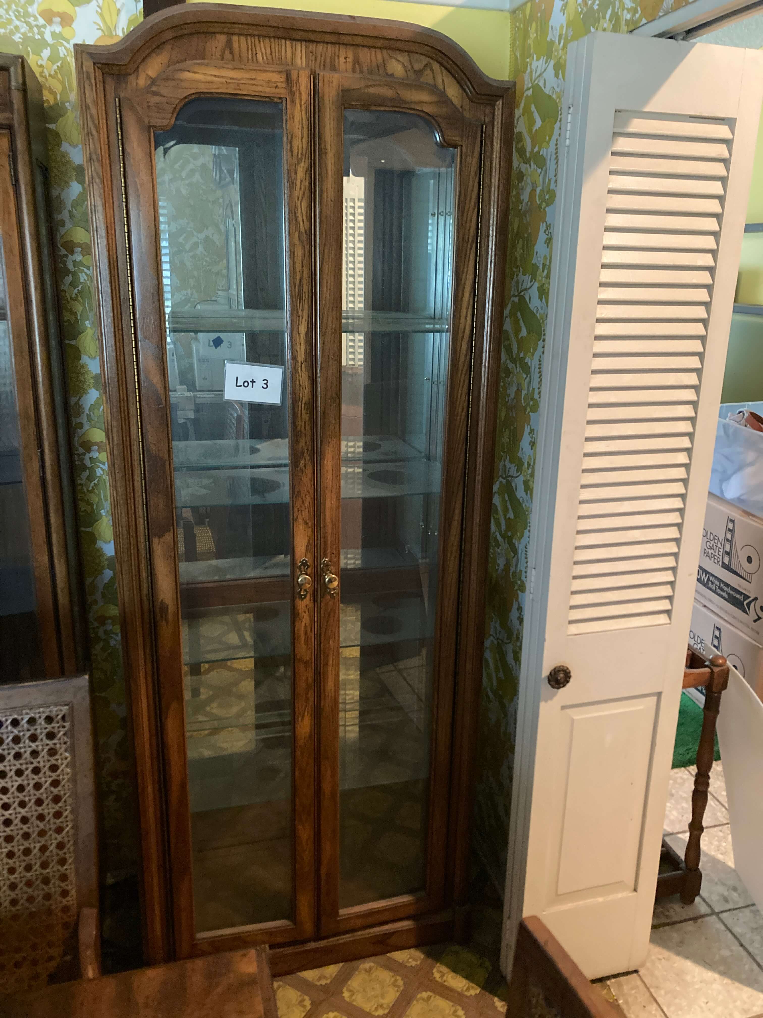 Lighted Curio Cabinet, 32"w x 16"d x 82"h. Good condition (needs cleaning)